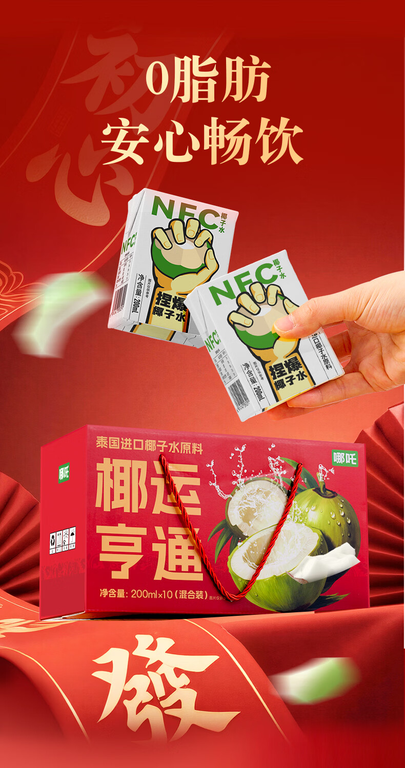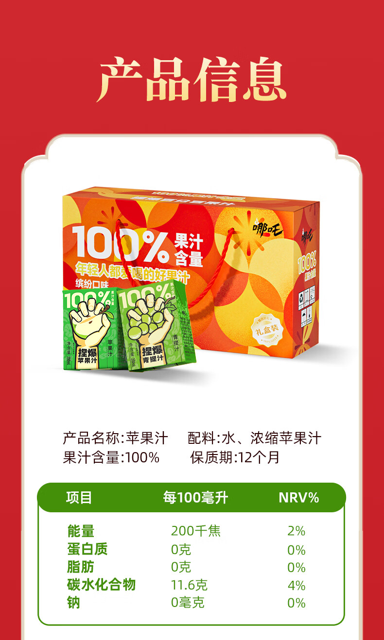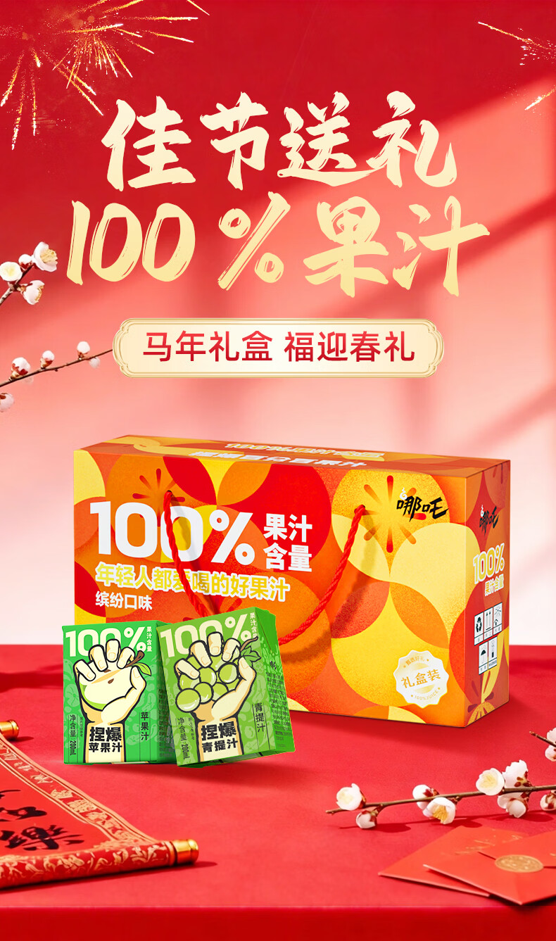 哪吒甜橙雪梨苹果青提青柠白桦树西梅汁椰子水年货送礼盒饮料品含维C 捏爆100%青提汁2L*2瓶 哪吒捏爆果汁