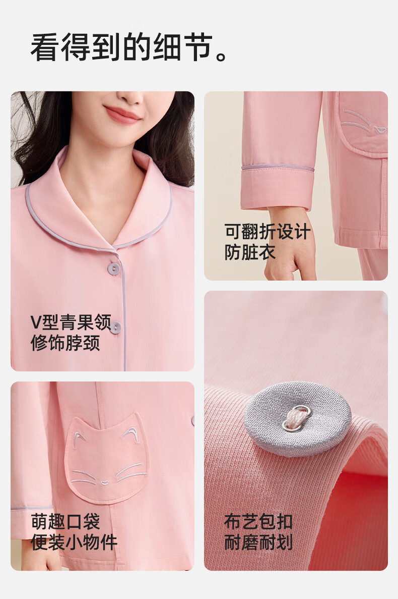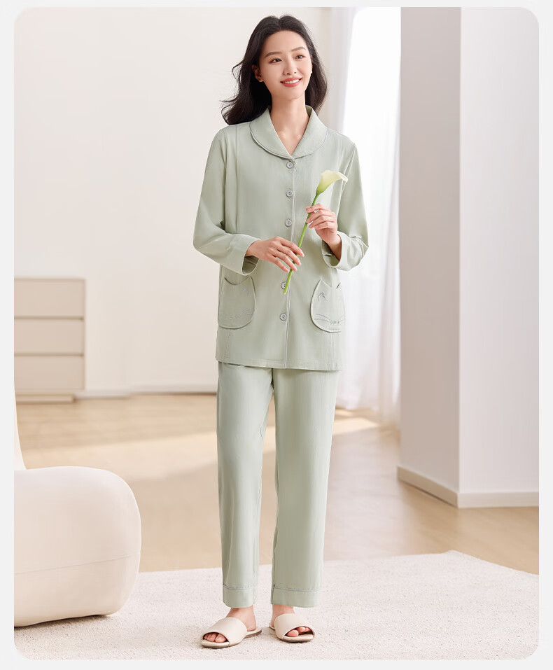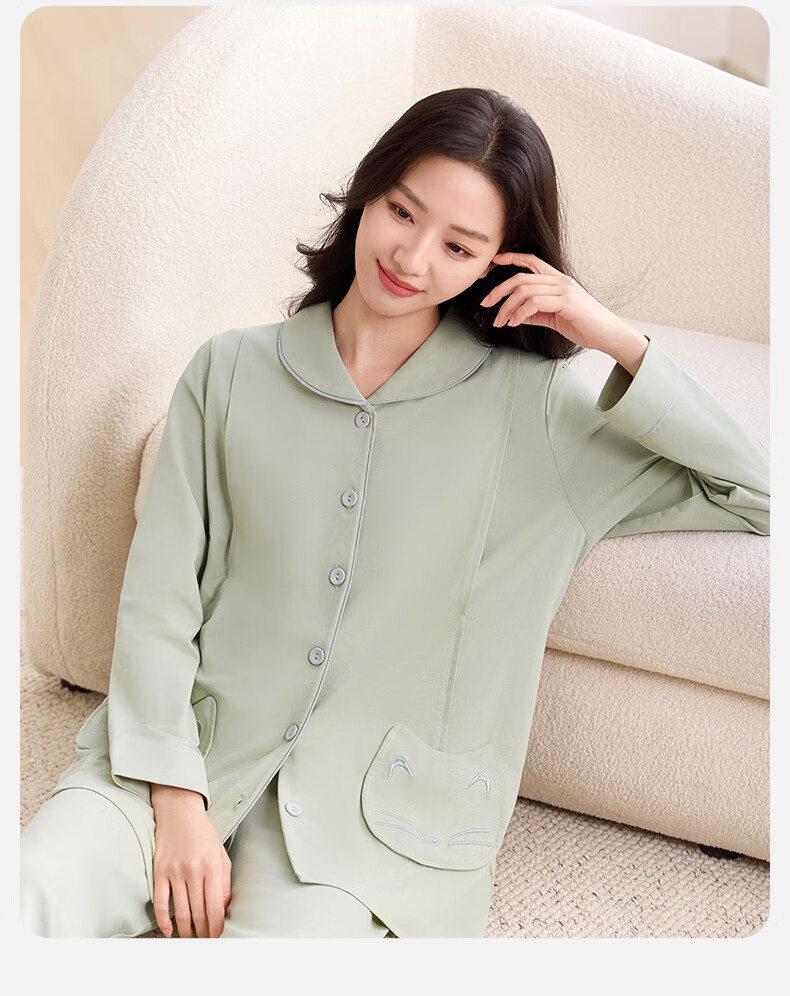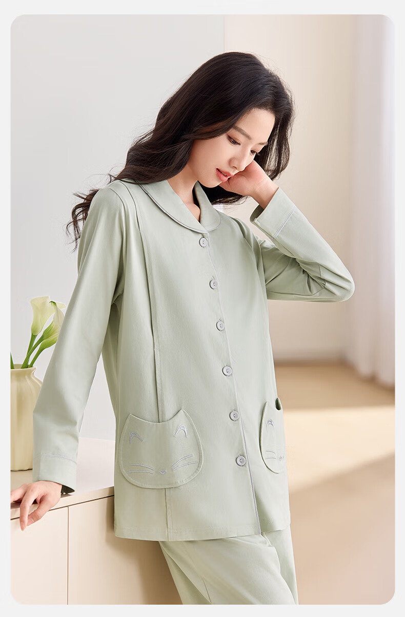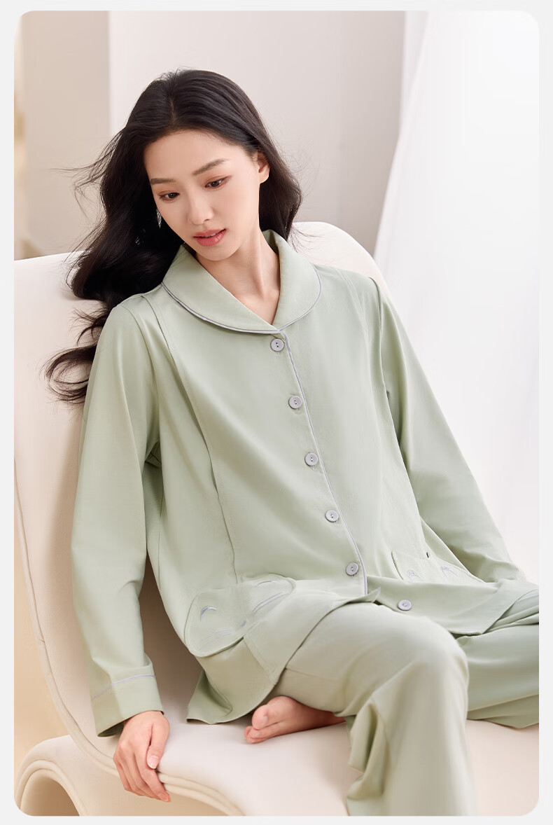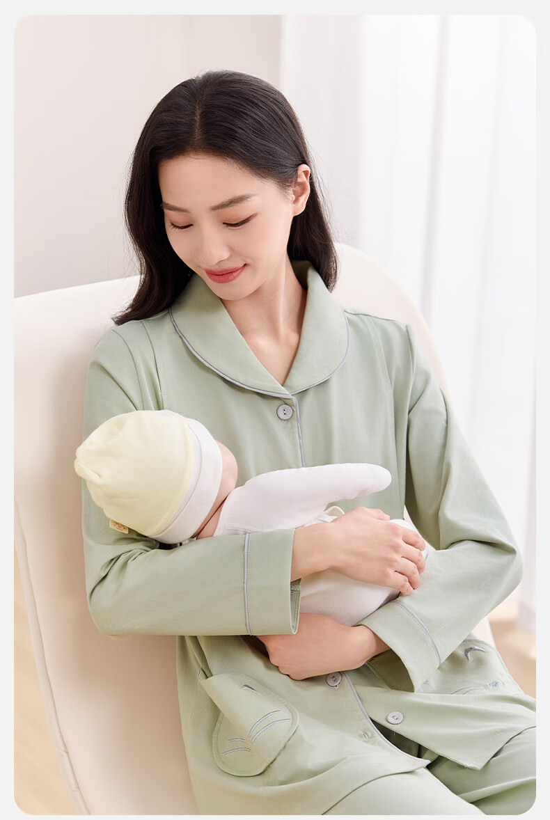 十月结晶月子服春秋薄款产妇棉产后孕妇睡衣哺乳家居服套装绿色M码