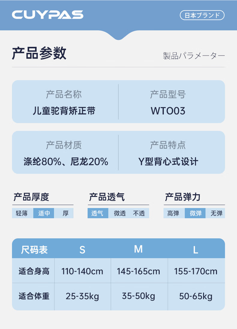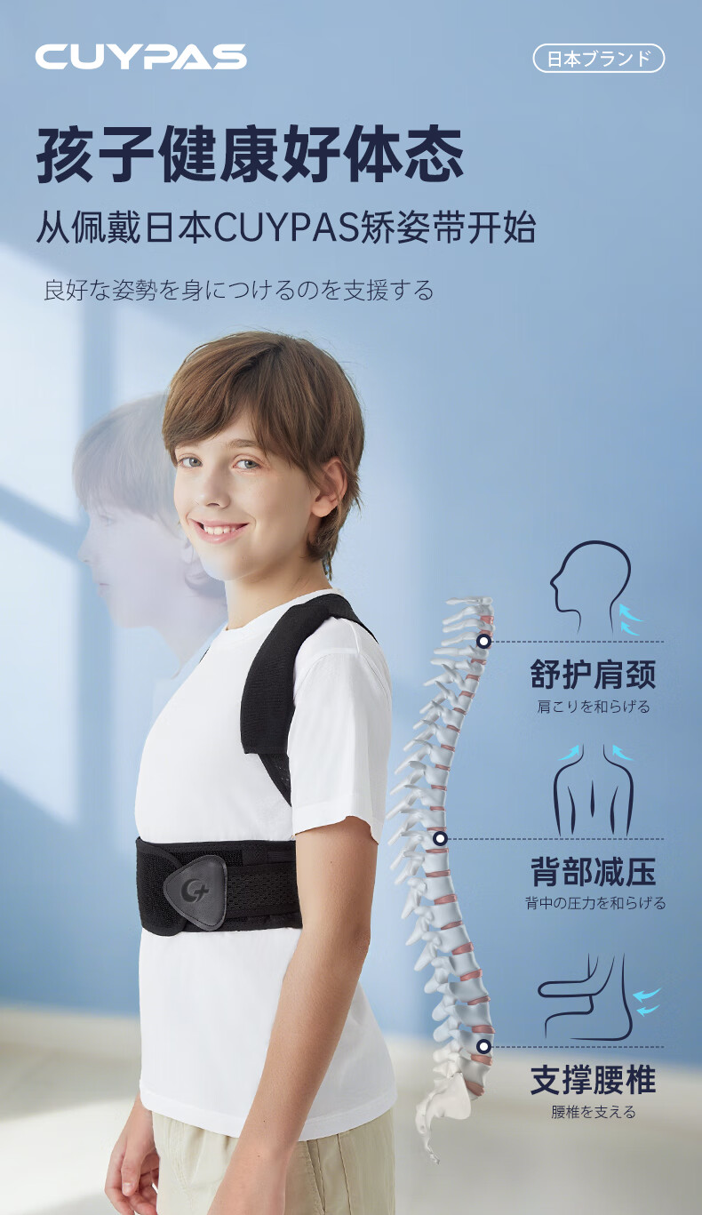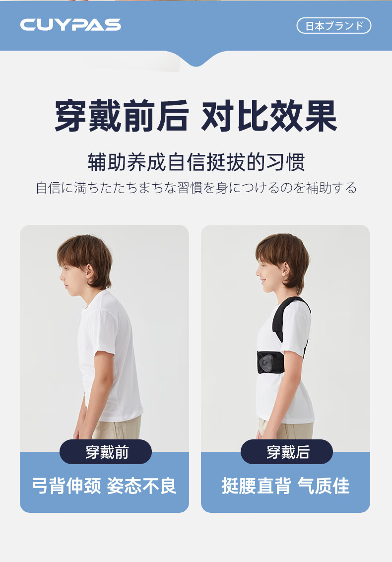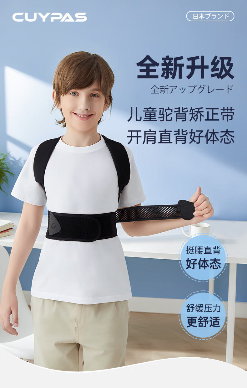 CUYPAS日本新升级学生儿童专用驼背矫正器青少年纠正背部矫正带神器 黑色 M (体重35-50kg)