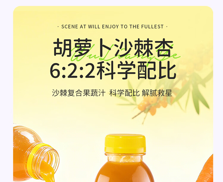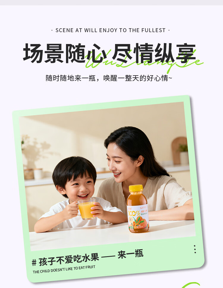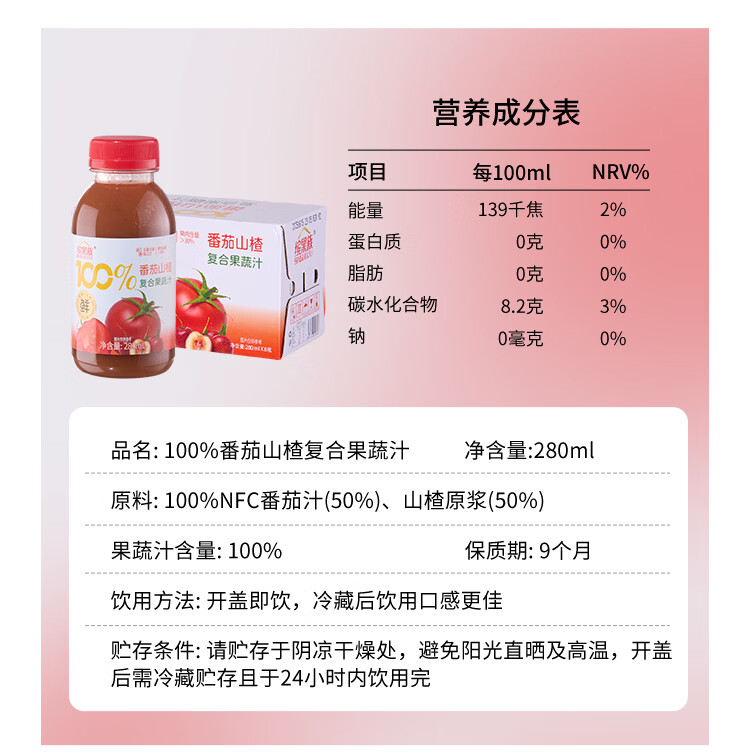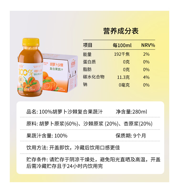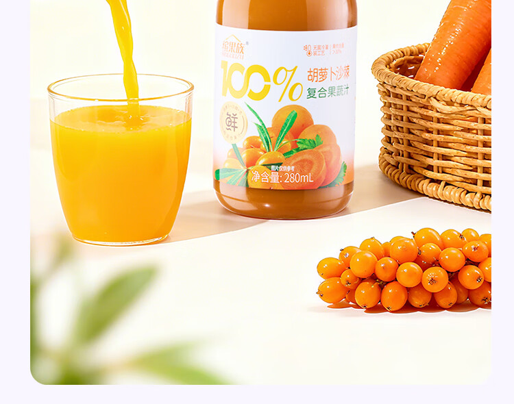 缤果族NFC100%复合果蔬汁西梅桑葚番茄山楂胡萝卜沙棘 效期至3月14日 100%胡萝卜沙棘果汁280ml*8瓶