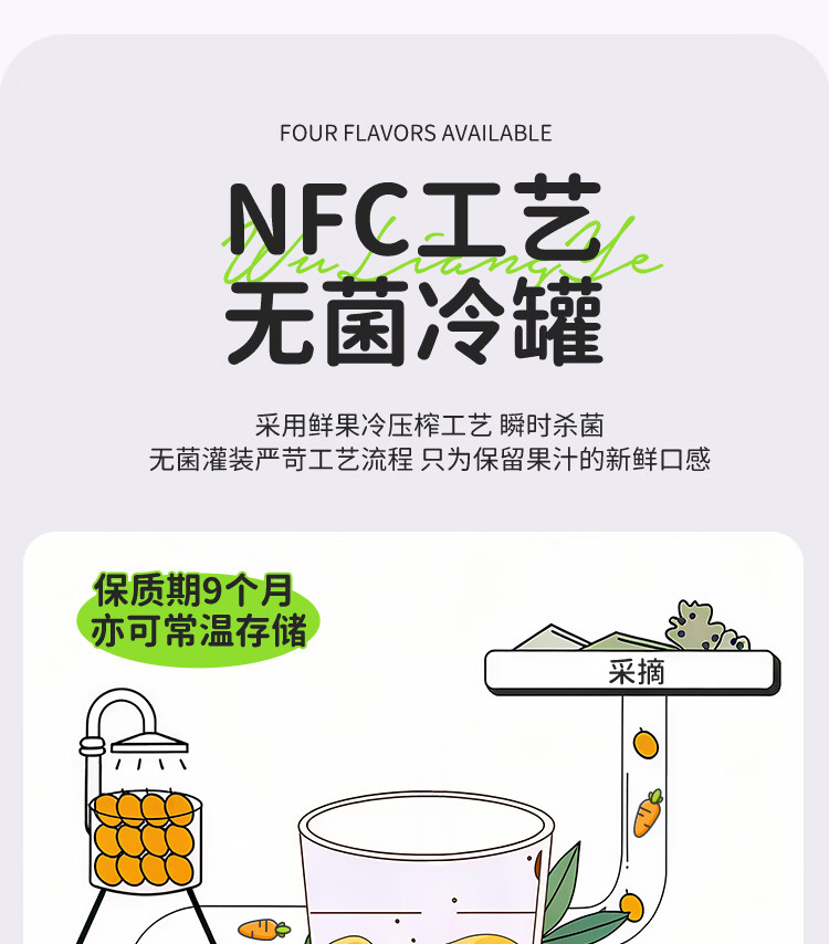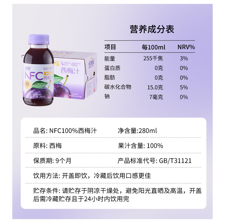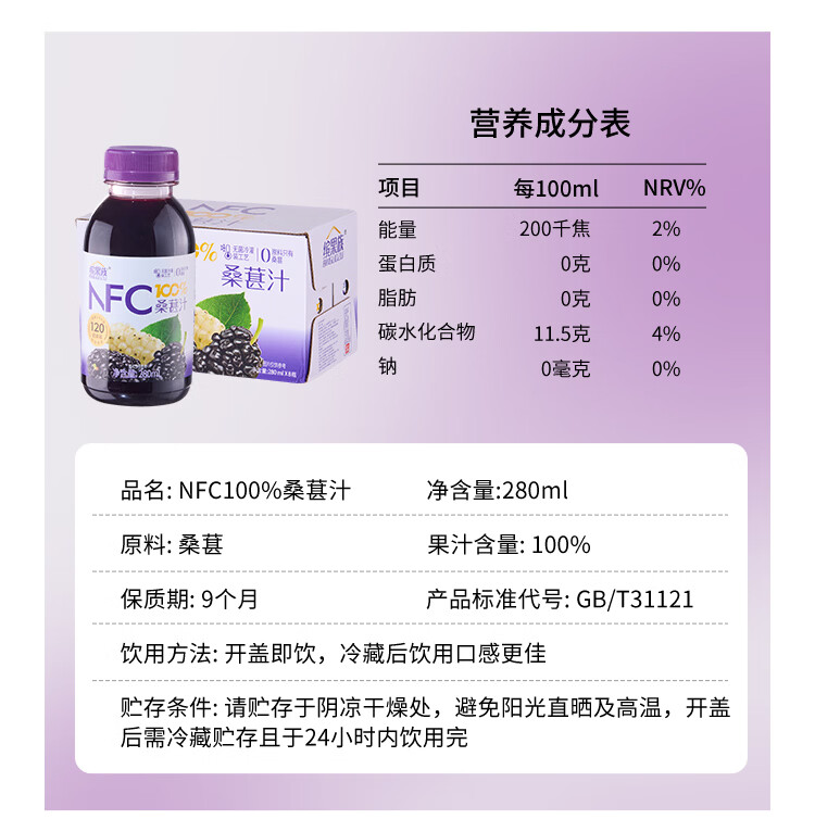 福兰农庄100%NFC鲜榨果汁配料表干净0脂肪饮料 NFC葡萄汁300ml*10瓶礼盒装