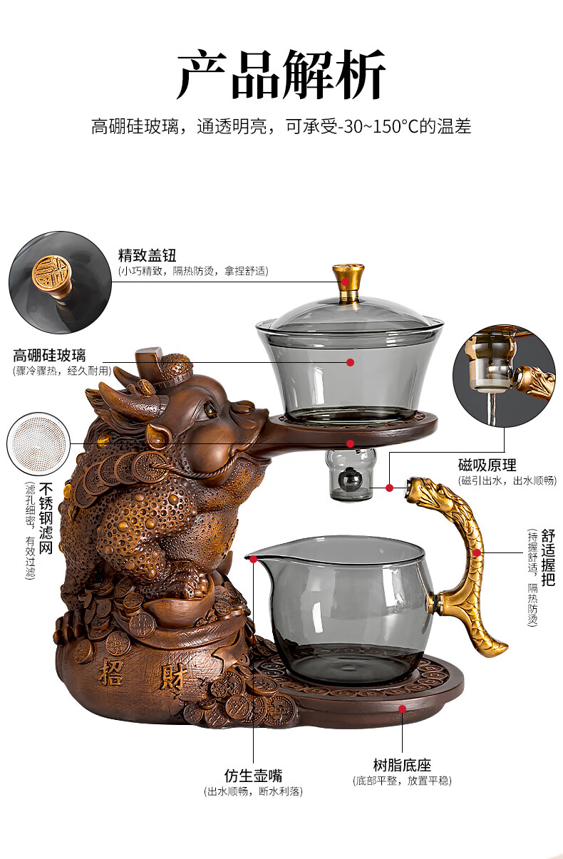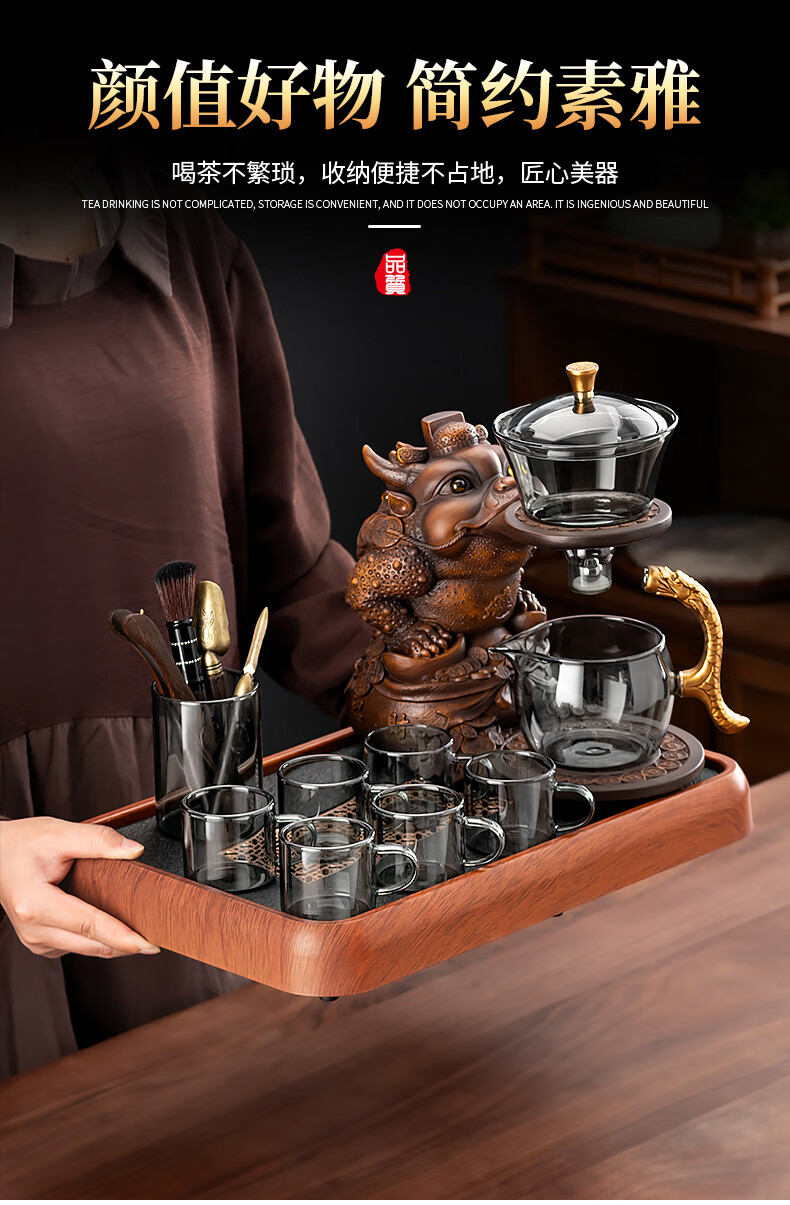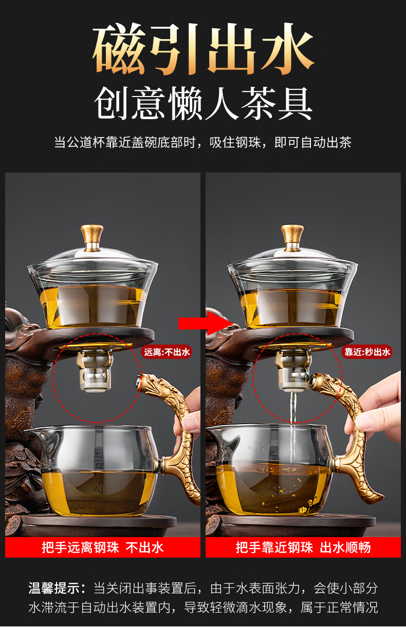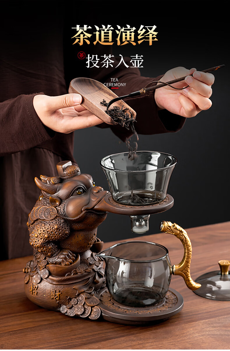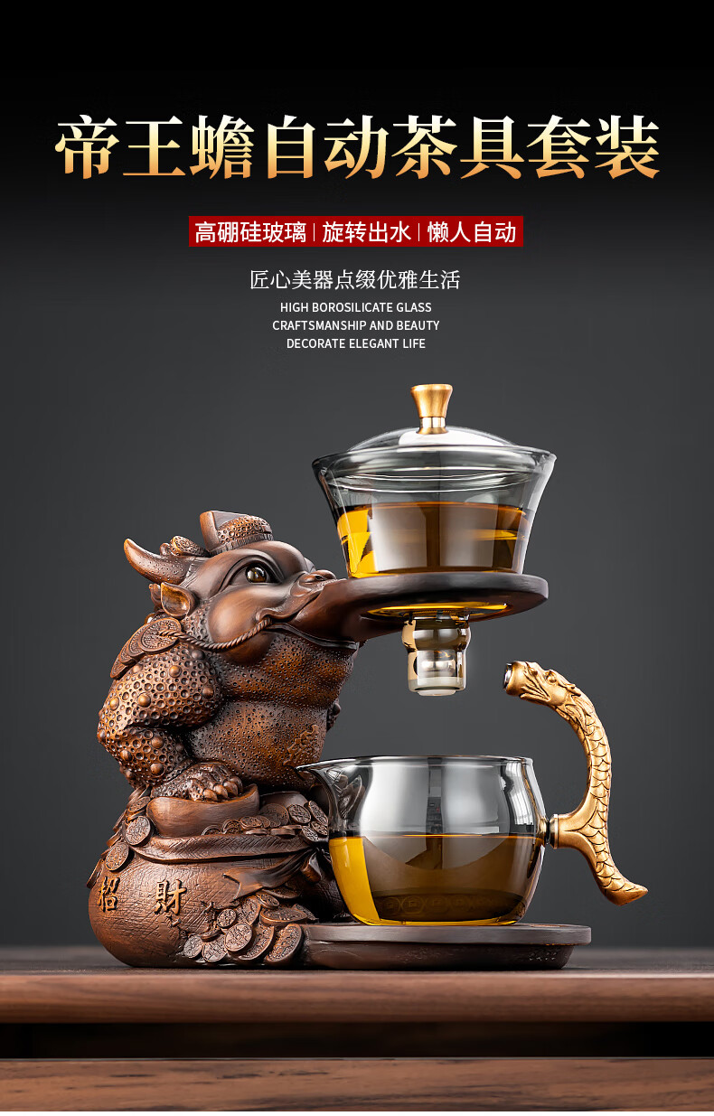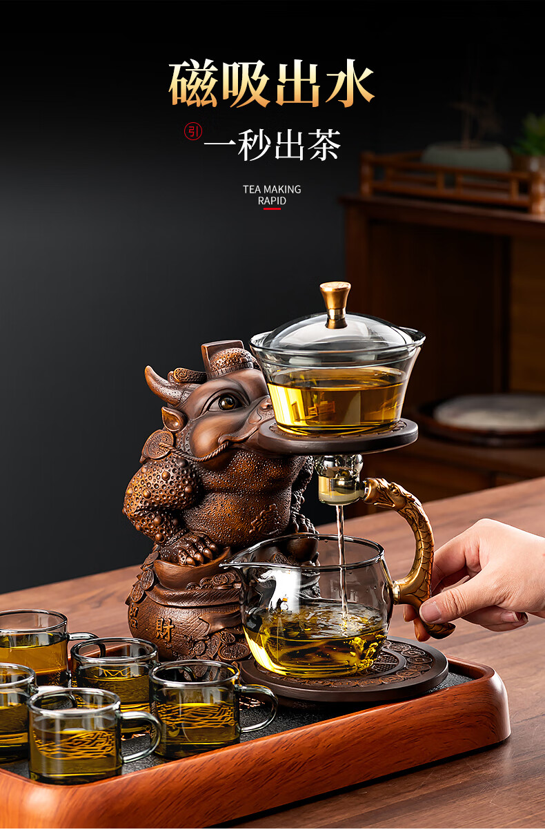 心茧创意磁吸自动茶具套装高档懒人泡茶壶家用防烫办公整套金蟾桌摆件 烟灰/自动进宝金蟾主机+六把杯