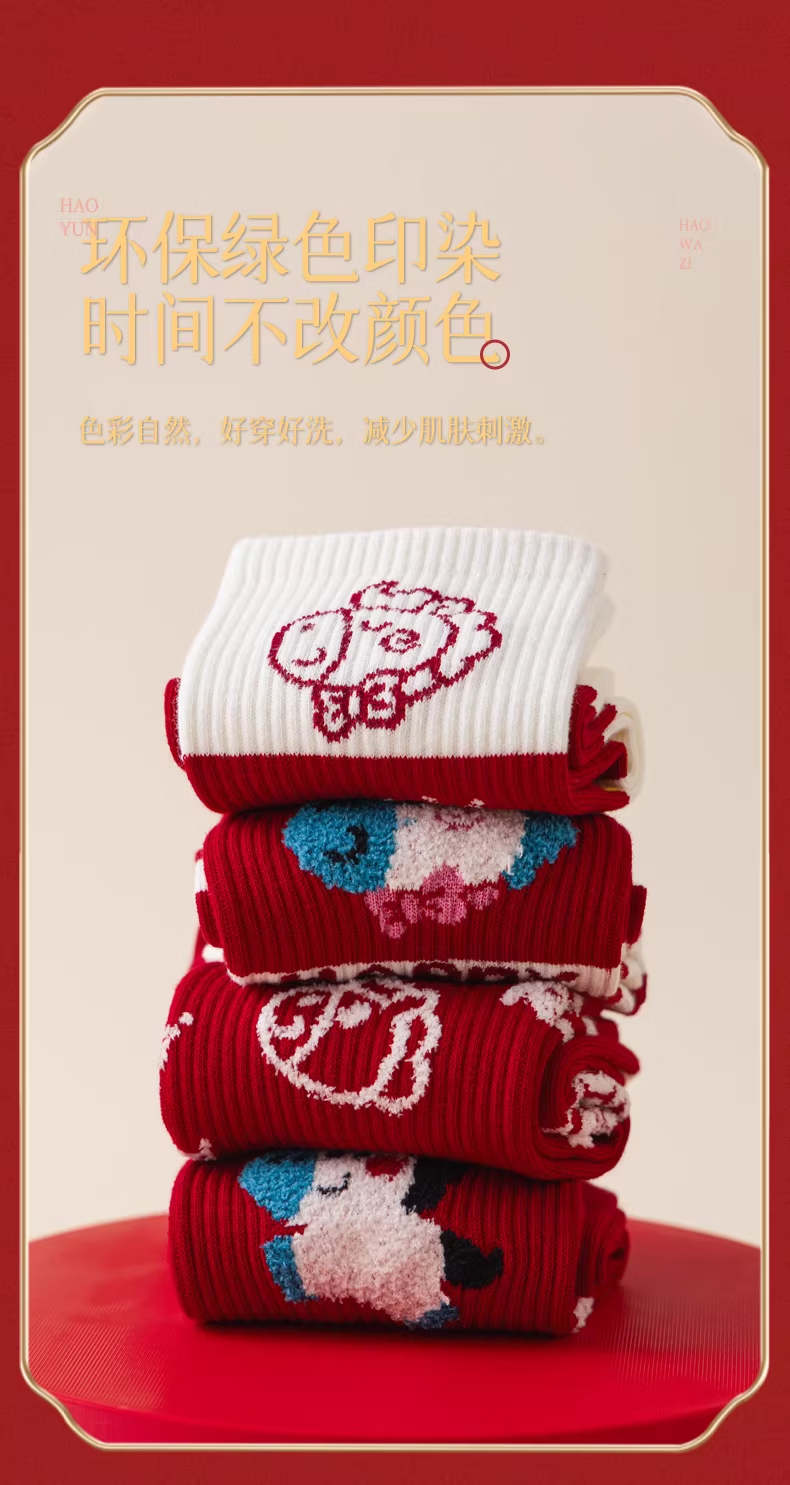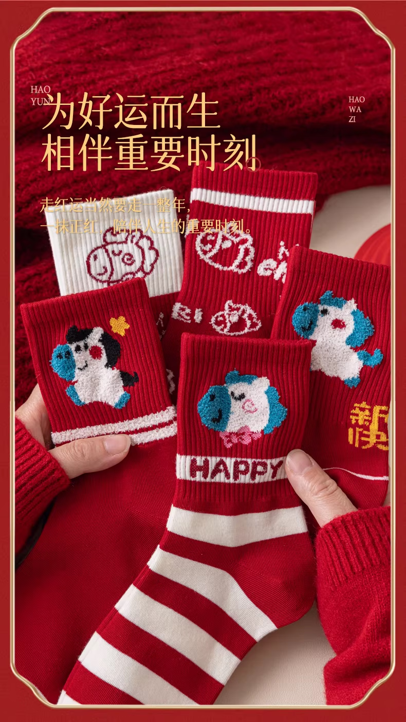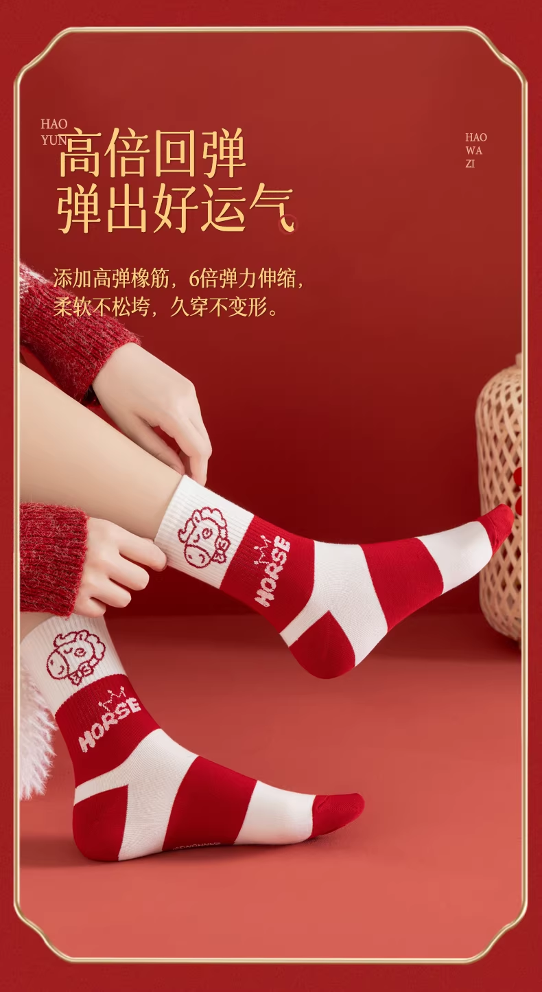 马年本命年红袜子男女款秋冬情侣一对新年结婚大红色可爱中筒袜女 【2双】双杠马+宽条马 均码