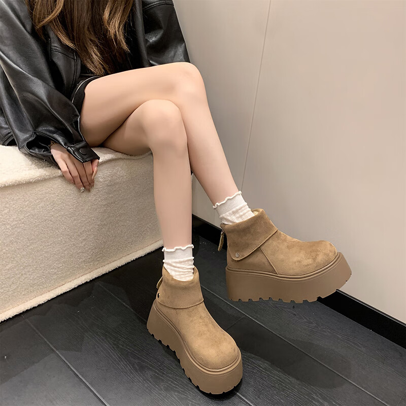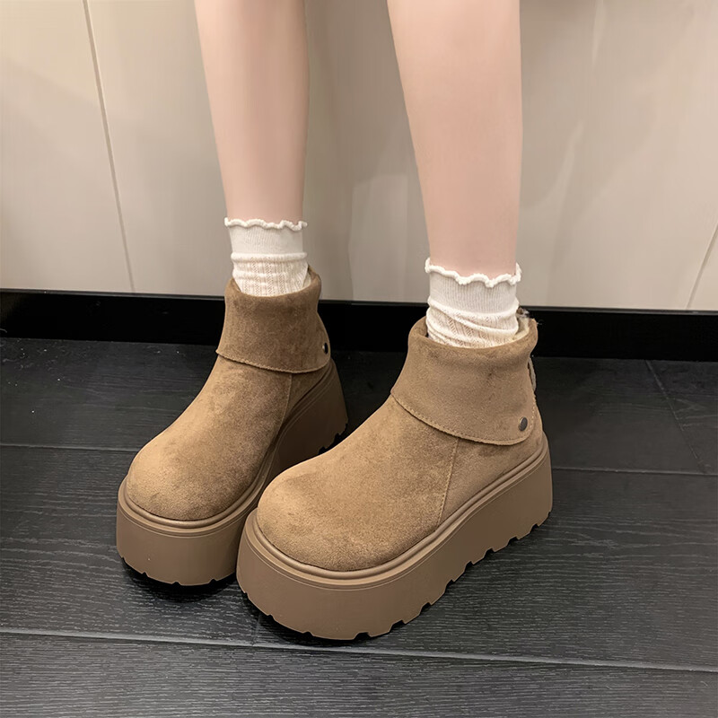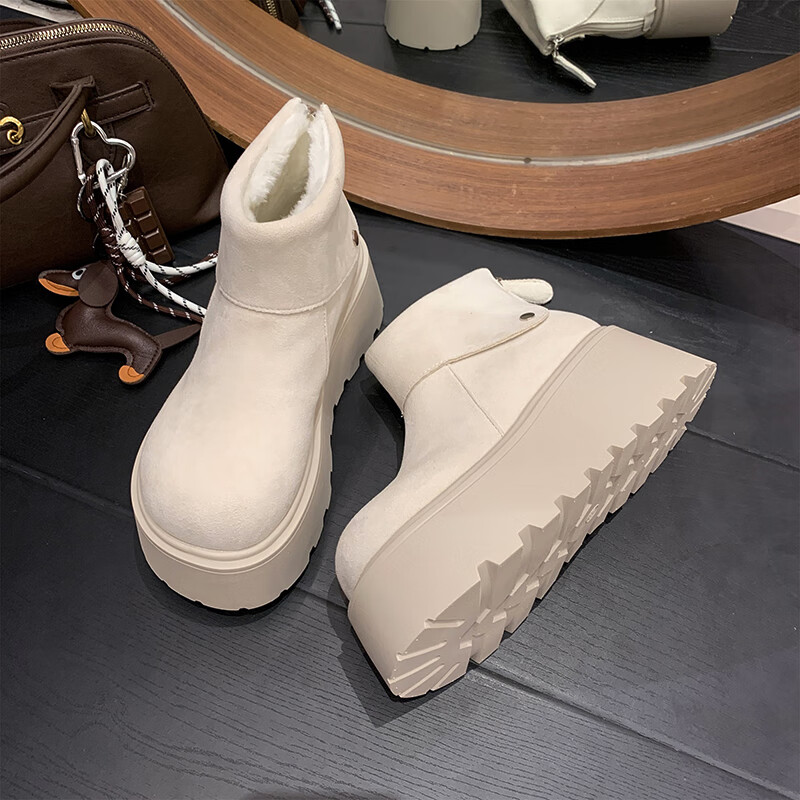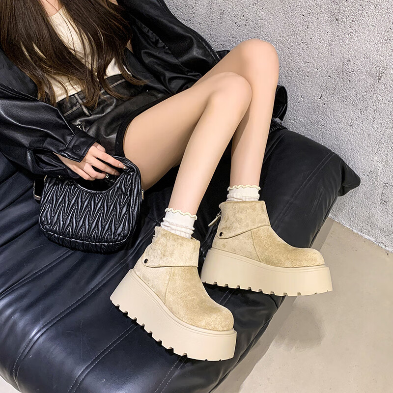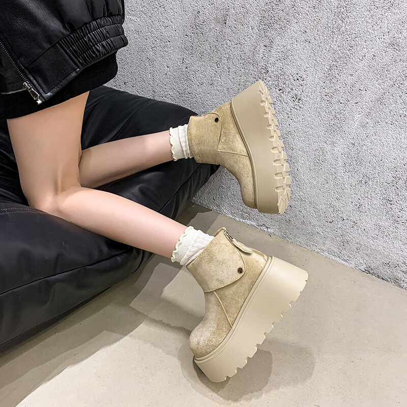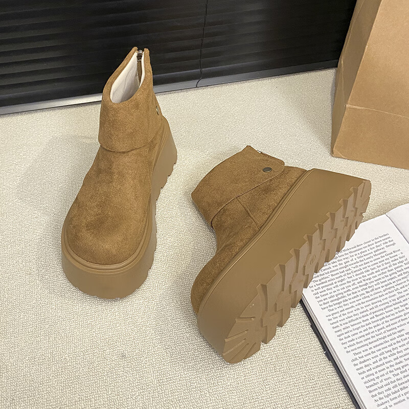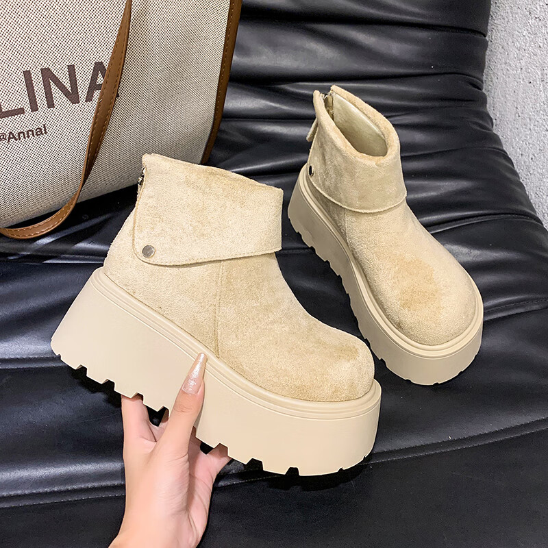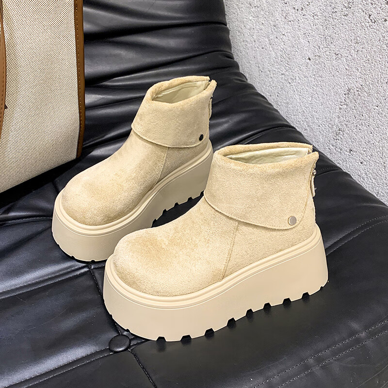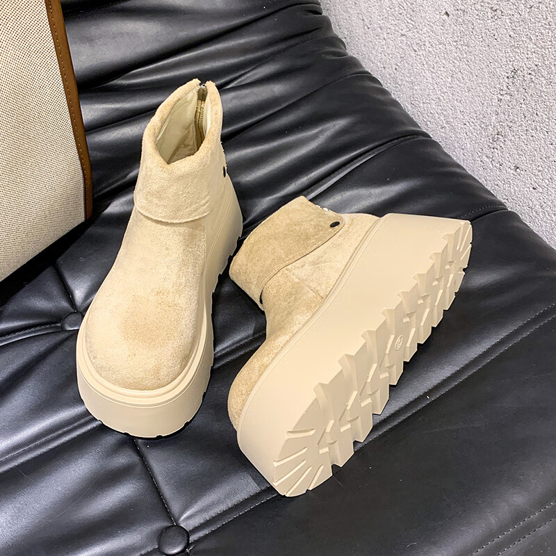 稻草人(MEXICAN)7CM增高真皮厚底美拉德勃肯短靴女秋冬雪地靴棉鞋加绒保暖马丁靴 米杏色-单里 35 标准尺码