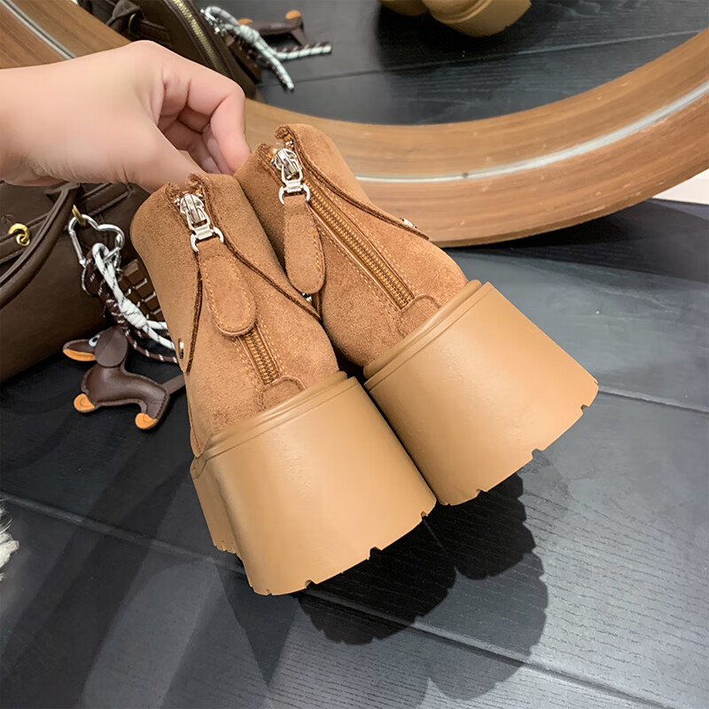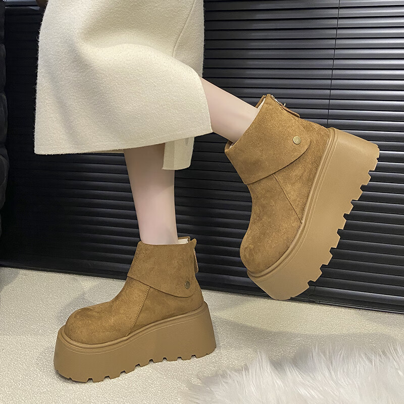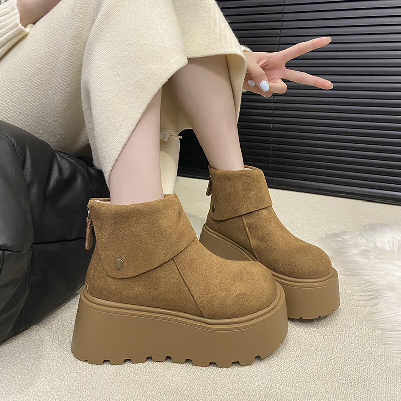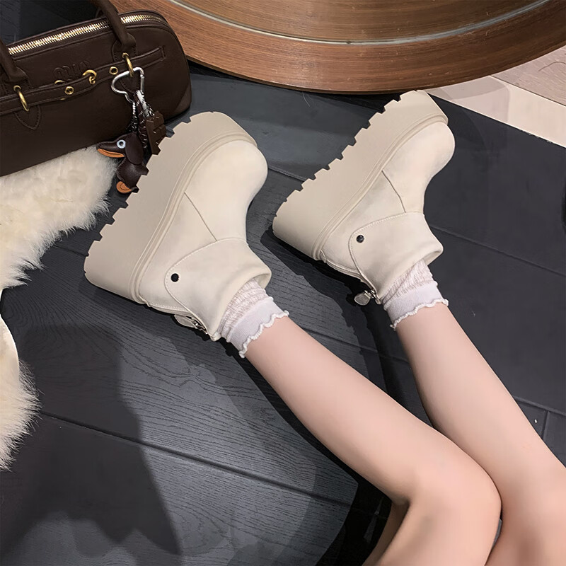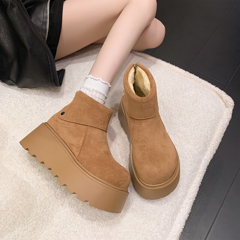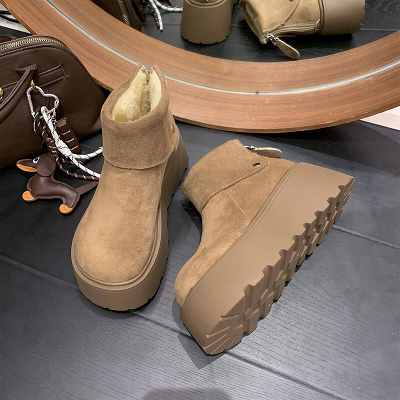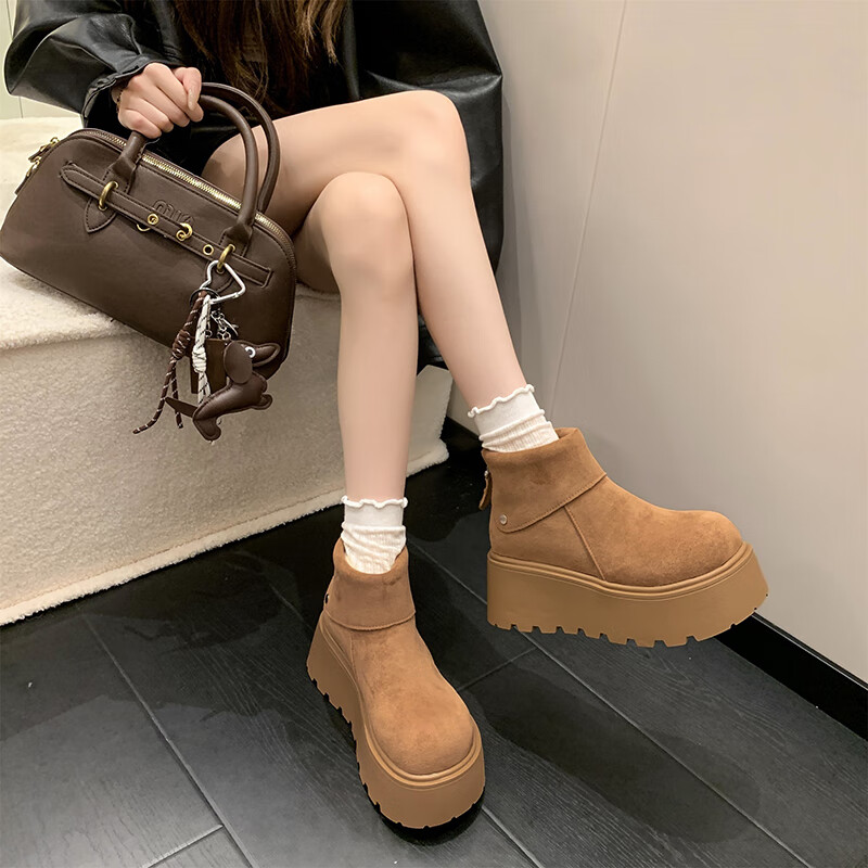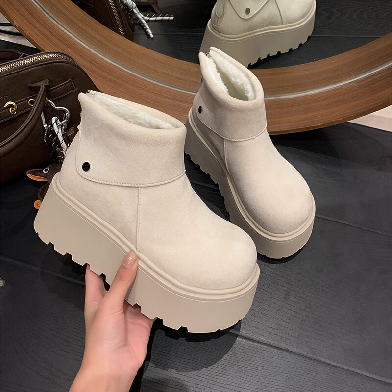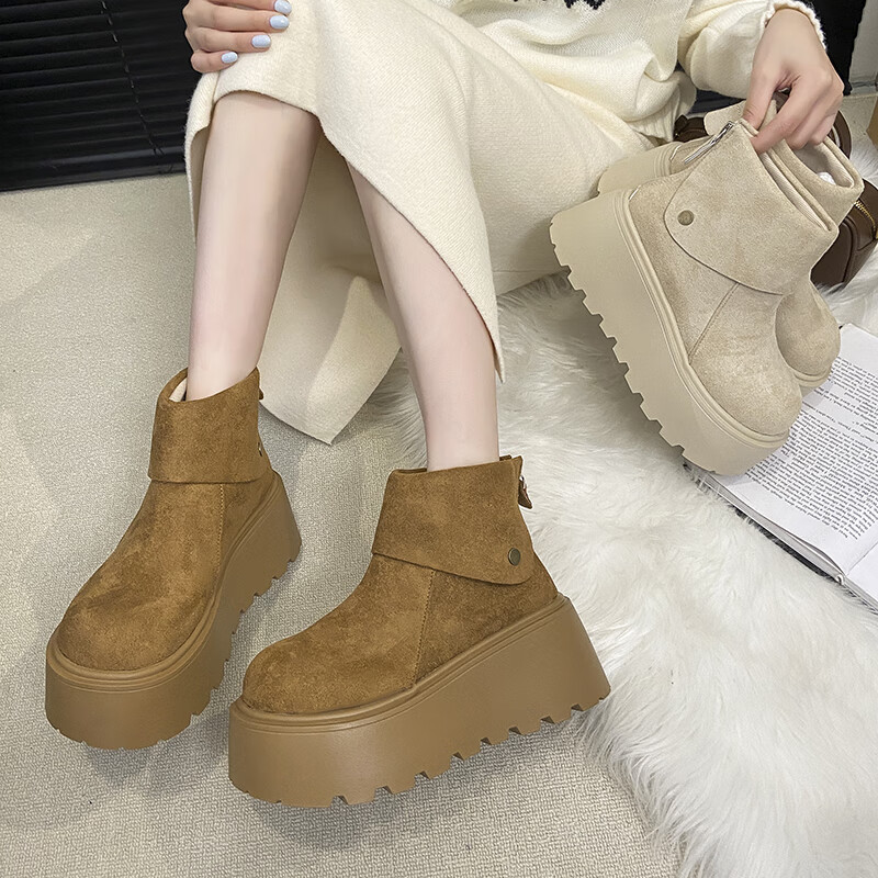 稻草人(MEXICAN)7CM增高真皮厚底美拉德勃肯短靴女秋冬雪地靴棉鞋加绒保暖马丁靴 米杏色-单里 35 标准尺码