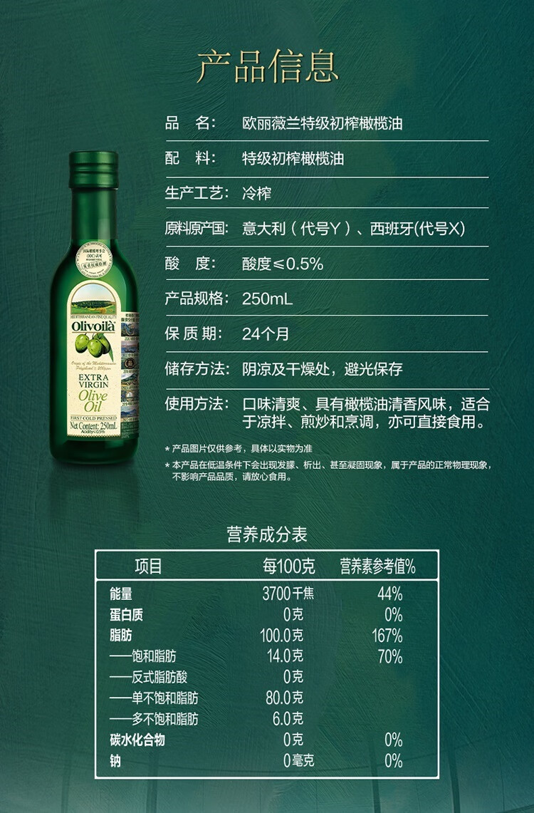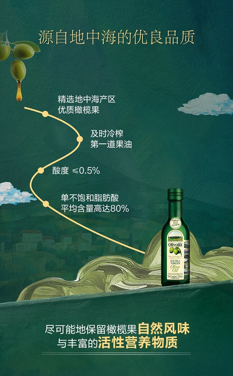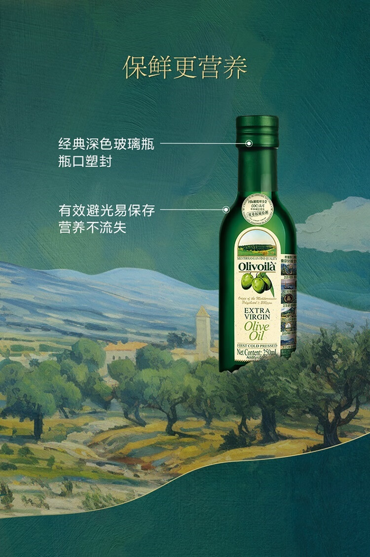 欧丽薇兰 Olivoila【保真橄榄油】食用油 特级初榨 压榨 橄榄油250ml