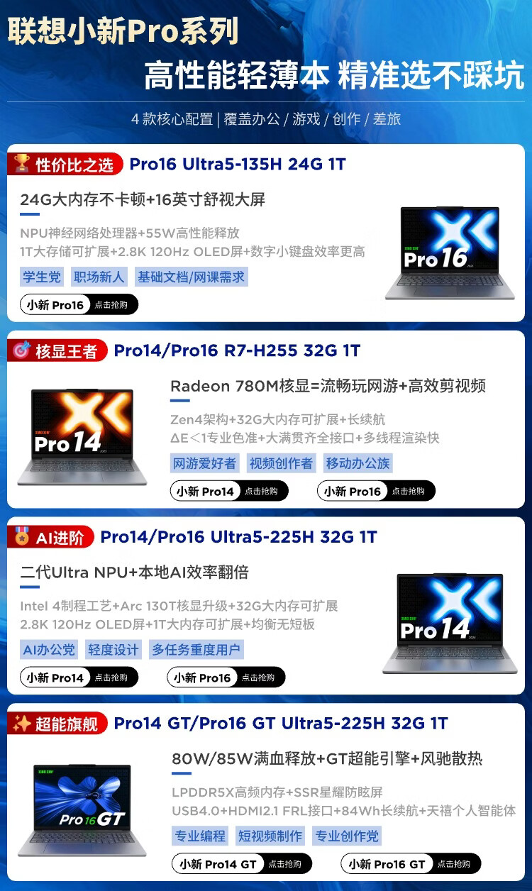 联想笔记本电脑小新Pro14GT AI元启轻薄本 2代酷睿Ultra9 32G 1T 2.8K高刷OLED【国家补贴】