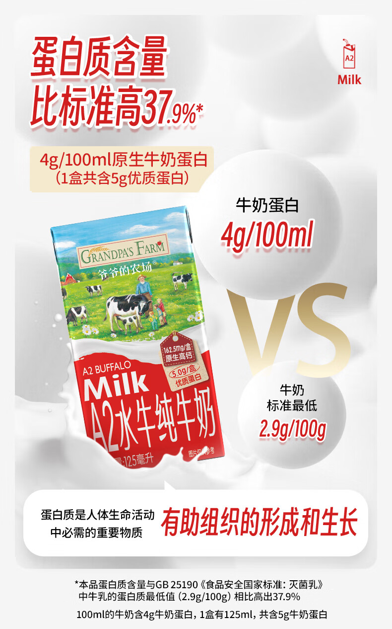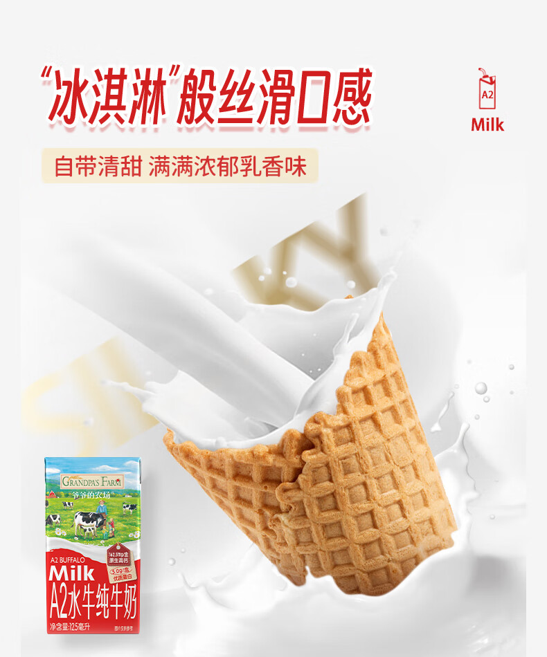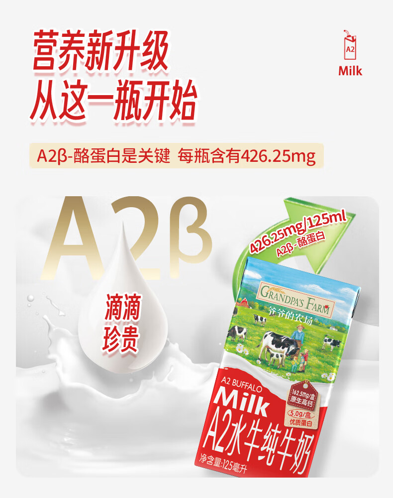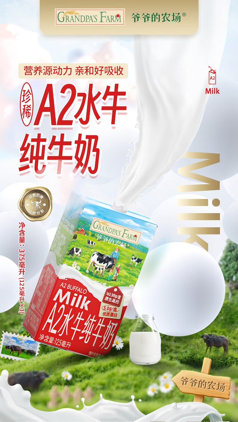 爷爷的农场A2水牛奶125ml*3盒 高钙 5g/盒优质蛋白纯牛奶儿童早餐生牛乳