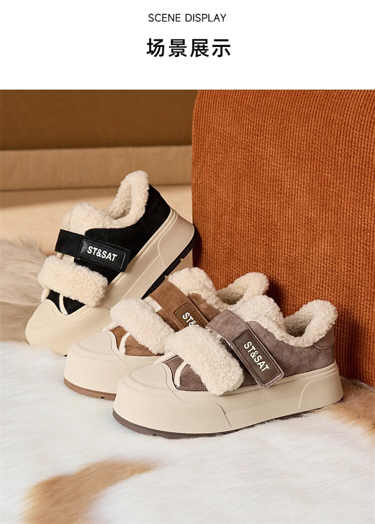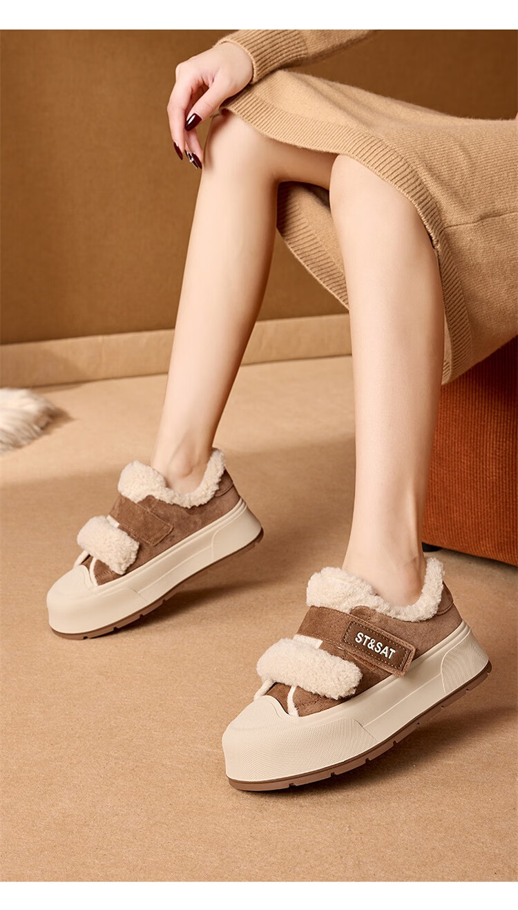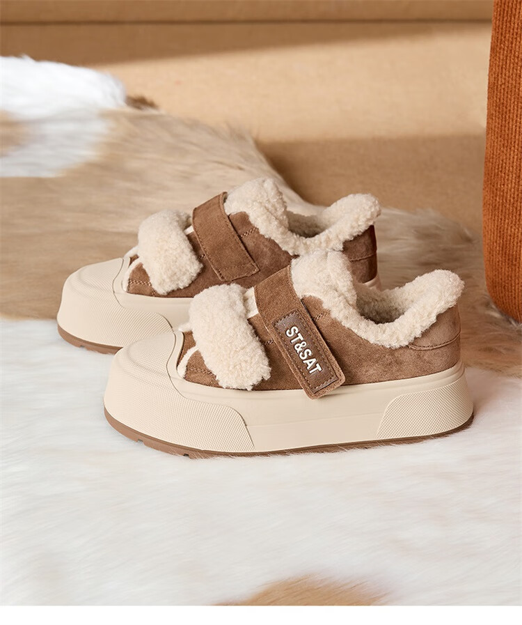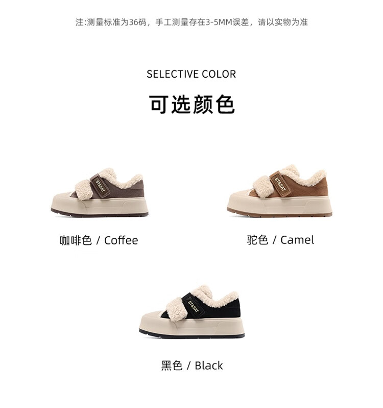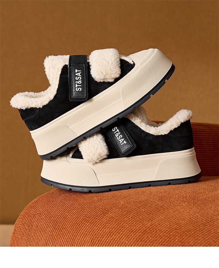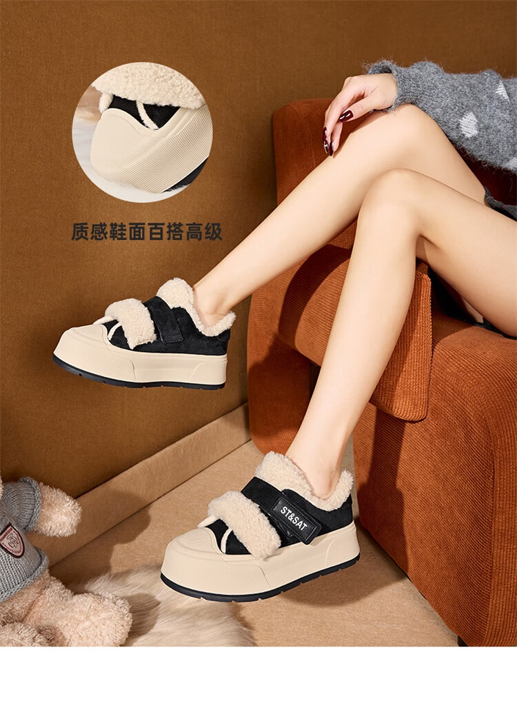 星期六厚底加绒板鞋女2025冬季新款加厚保暖面包鞋魔术贴小个子增高棉鞋 黑色 【厚底加绒】跟高4cm 35