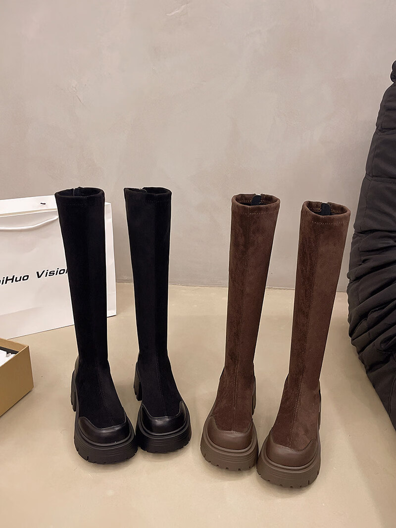 稻草人(MEXICAN)棕色长筒靴女不过膝2026秋冬新款小个子高筒骑士靴厚底瘦瘦弹力靴 棕色(质保升级版) 35