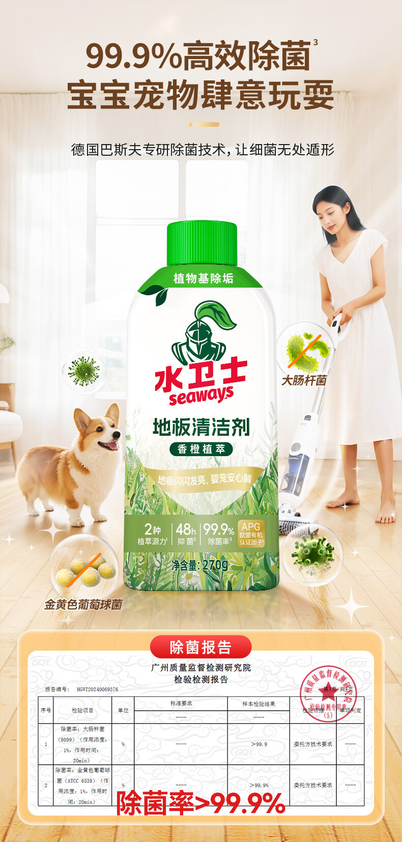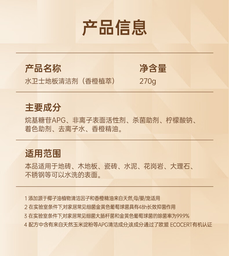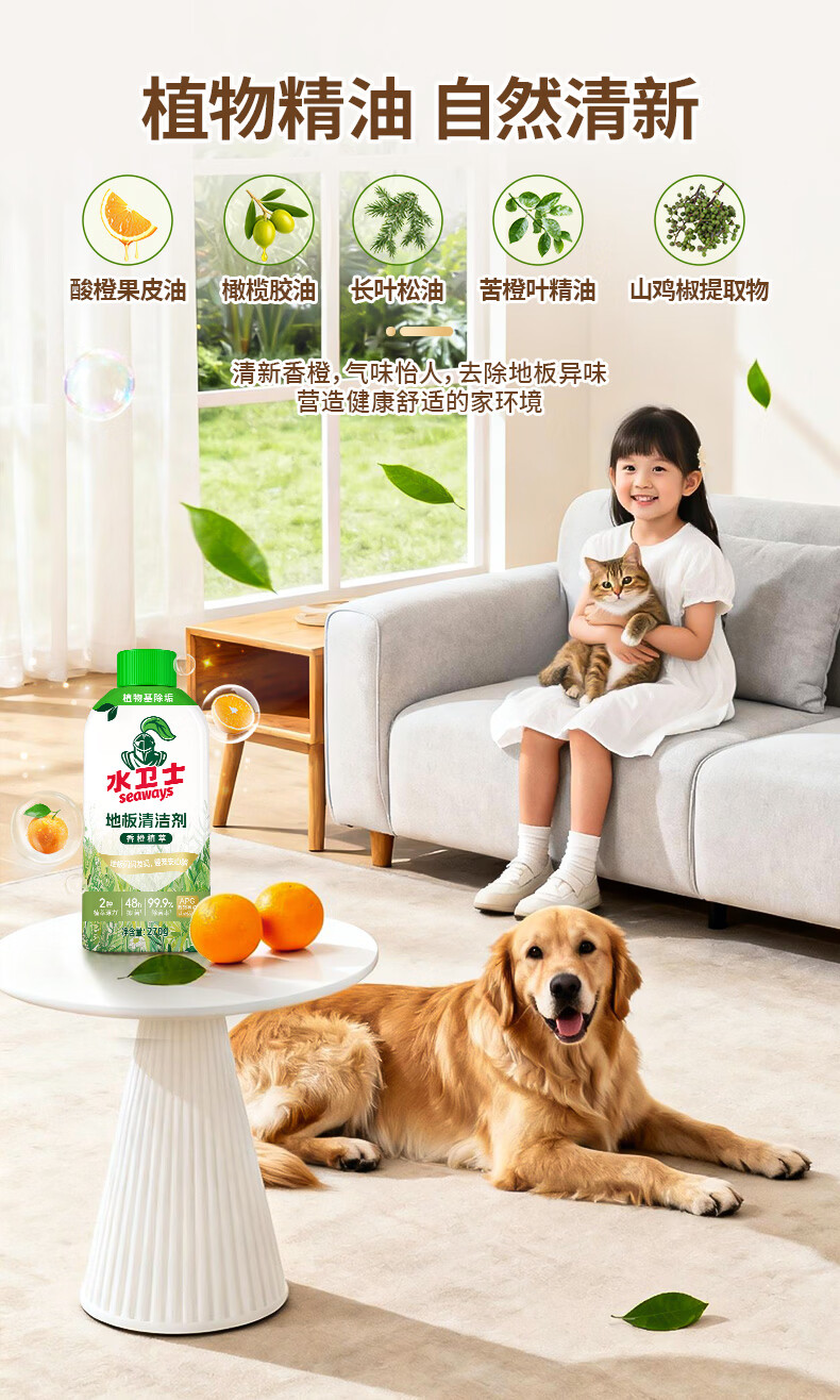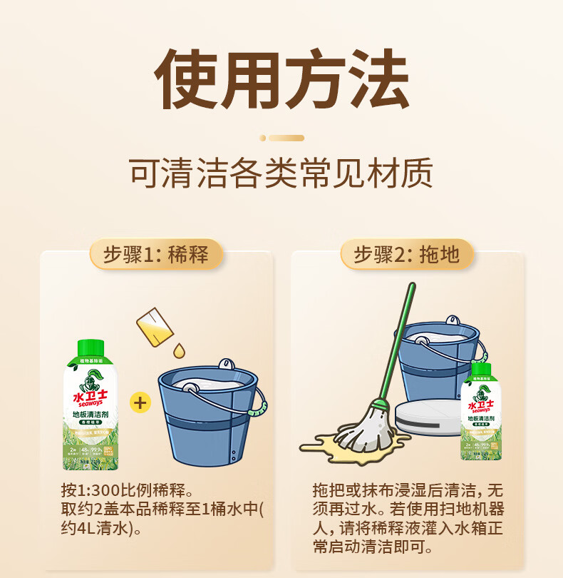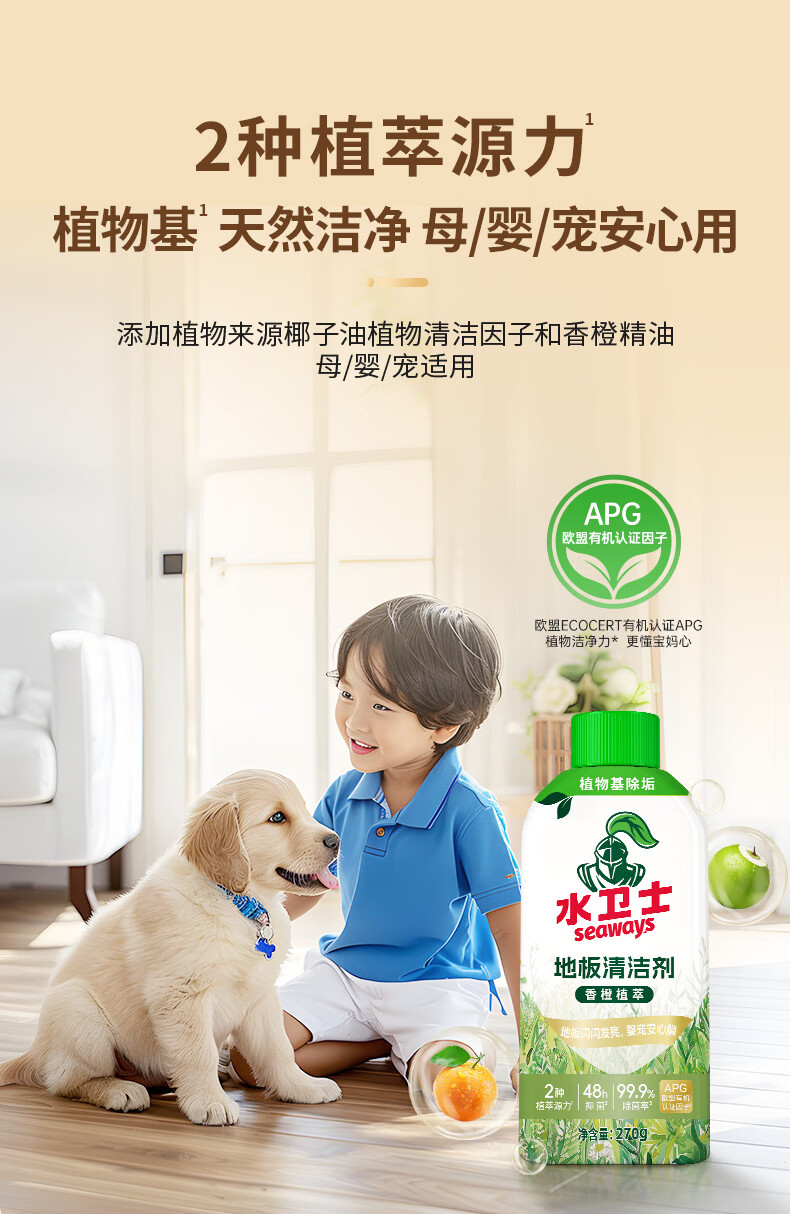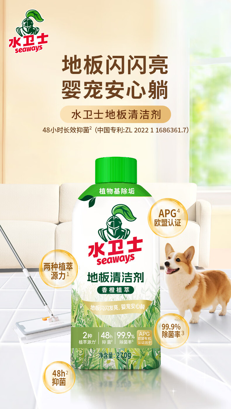 水卫士地板清洁剂婴宠家庭适用 扫地机器人专用 瓷砖拖地去污除菌去污垢 270g*3瓶【婴宠友好】