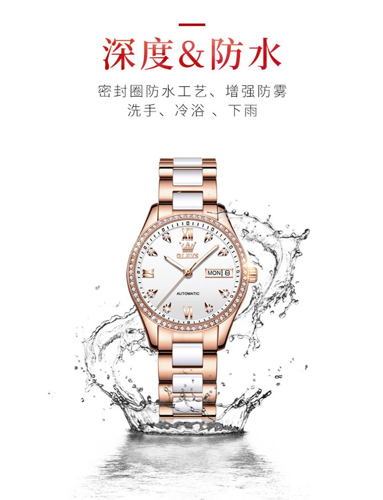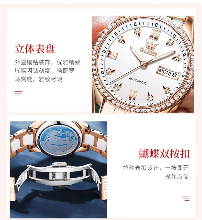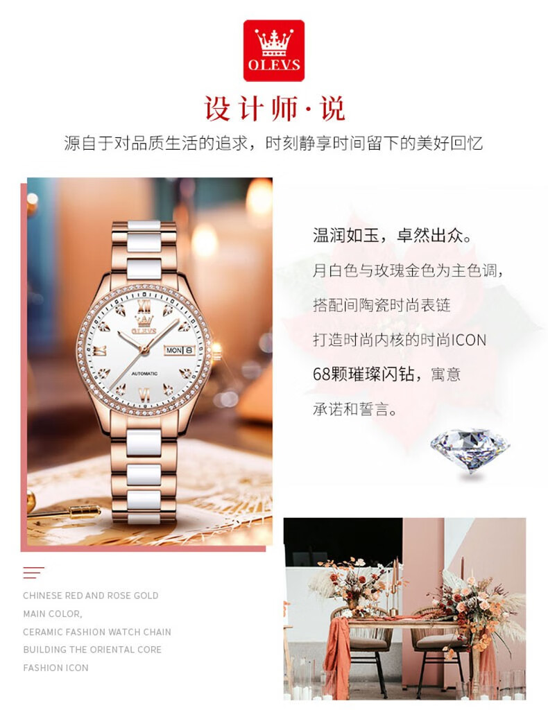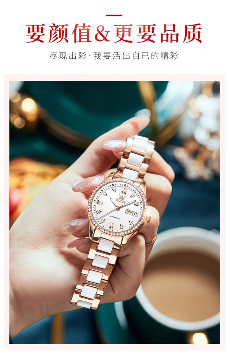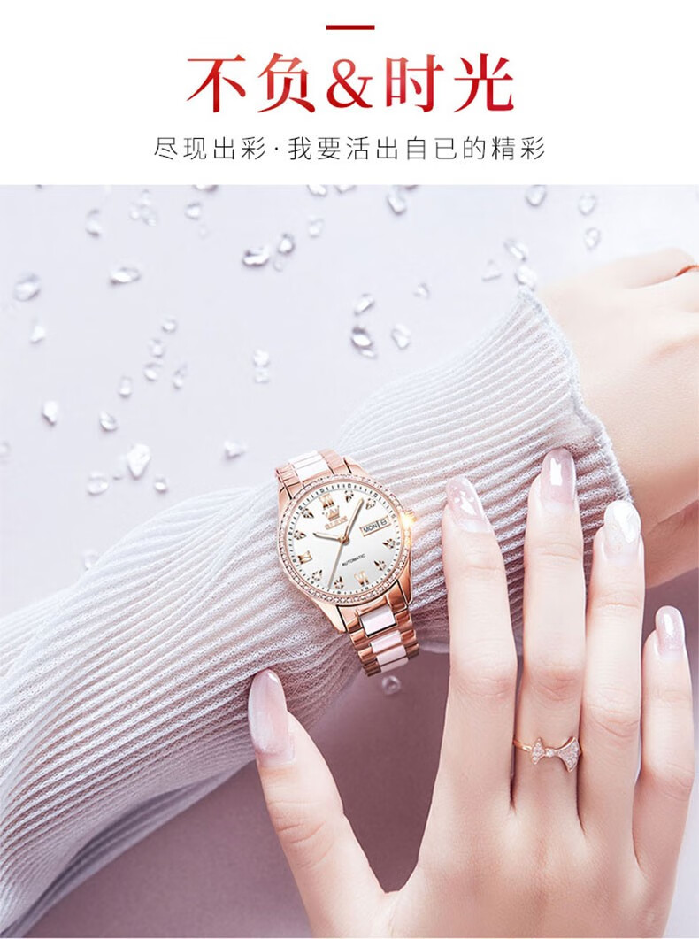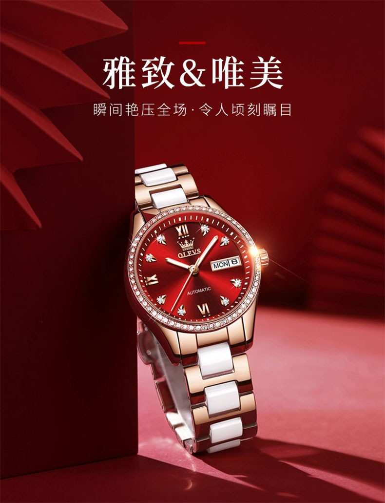 欧利时(OLEVS)瑞士认证手表女士全自动机械表女表防水夜光时尚镶钻商务女士手表 升级版6637陶瓷玫壳红面免费刻字
