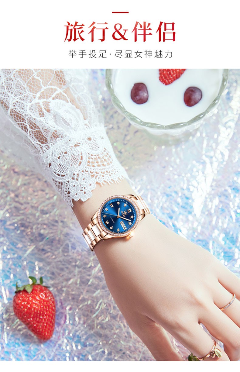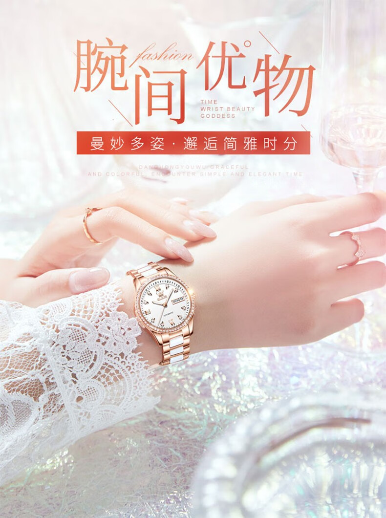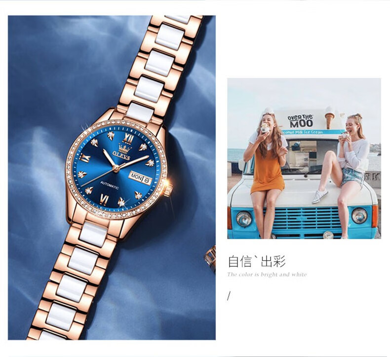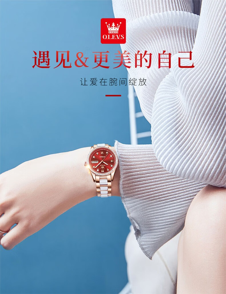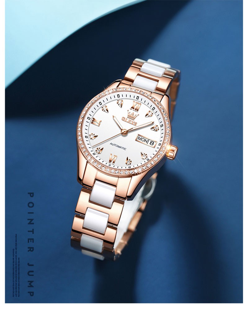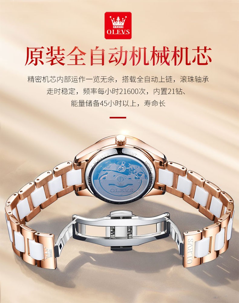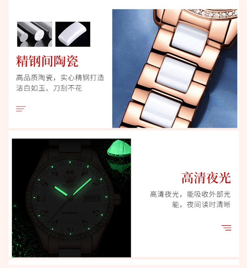 欧利时(OLEVS)瑞士认证手表女士全自动机械表女表防水夜光时尚镶钻商务女士手表 升级版6637陶瓷玫壳红面免费刻字