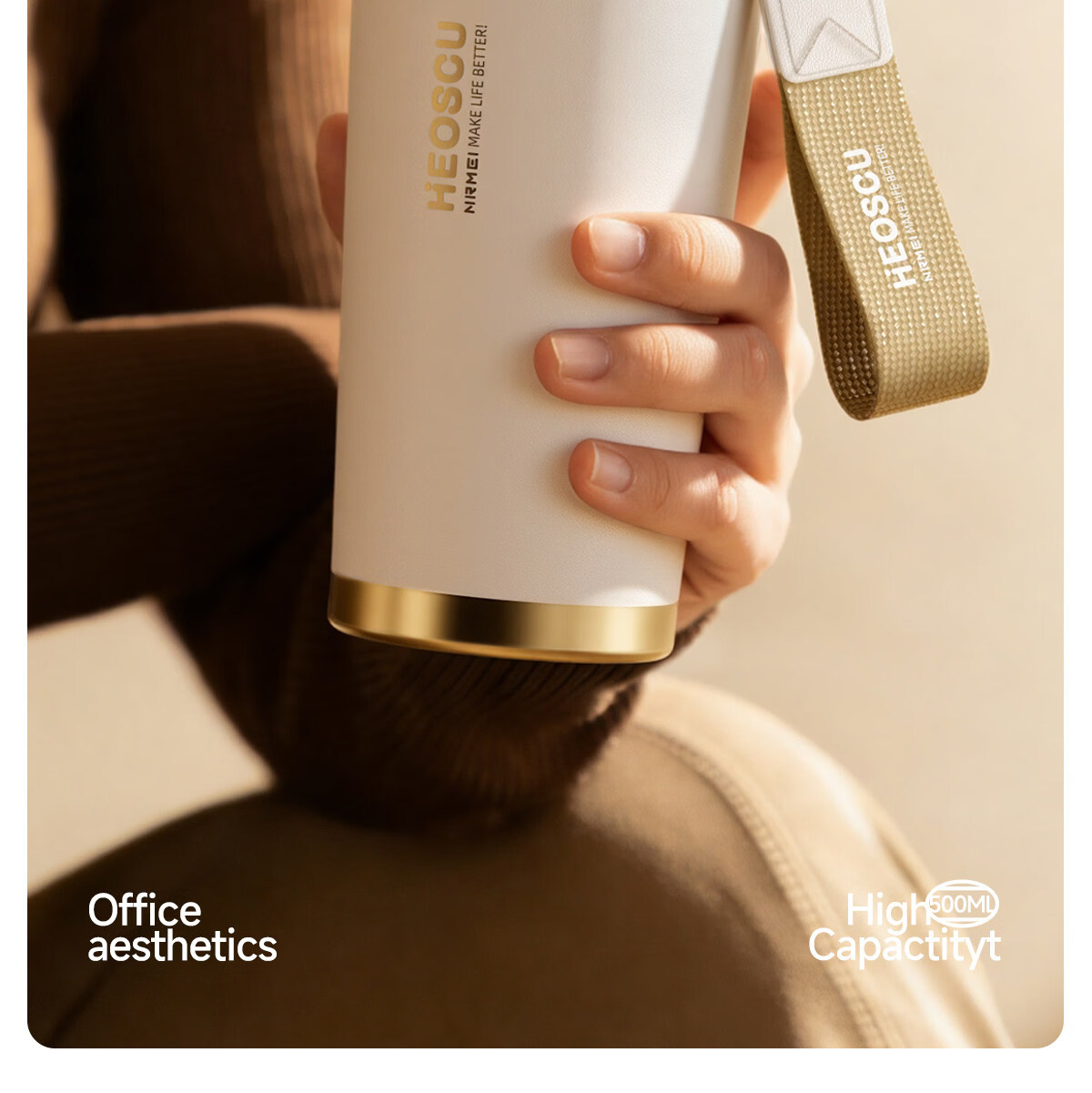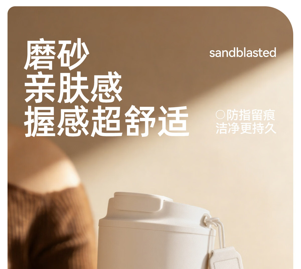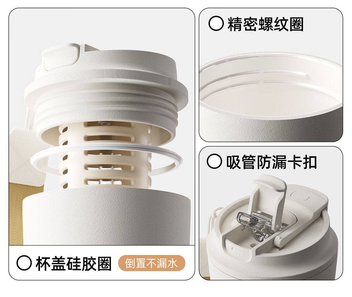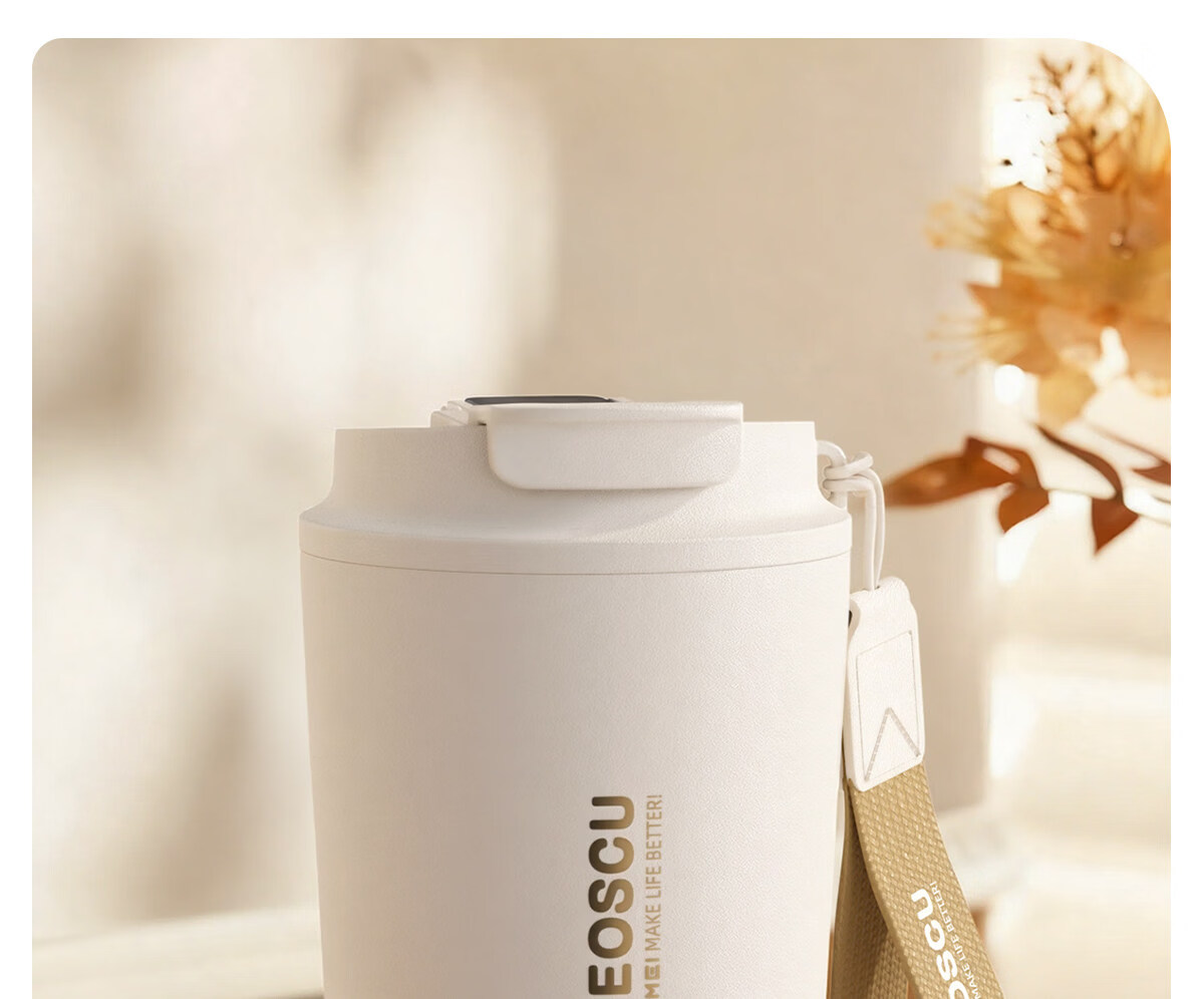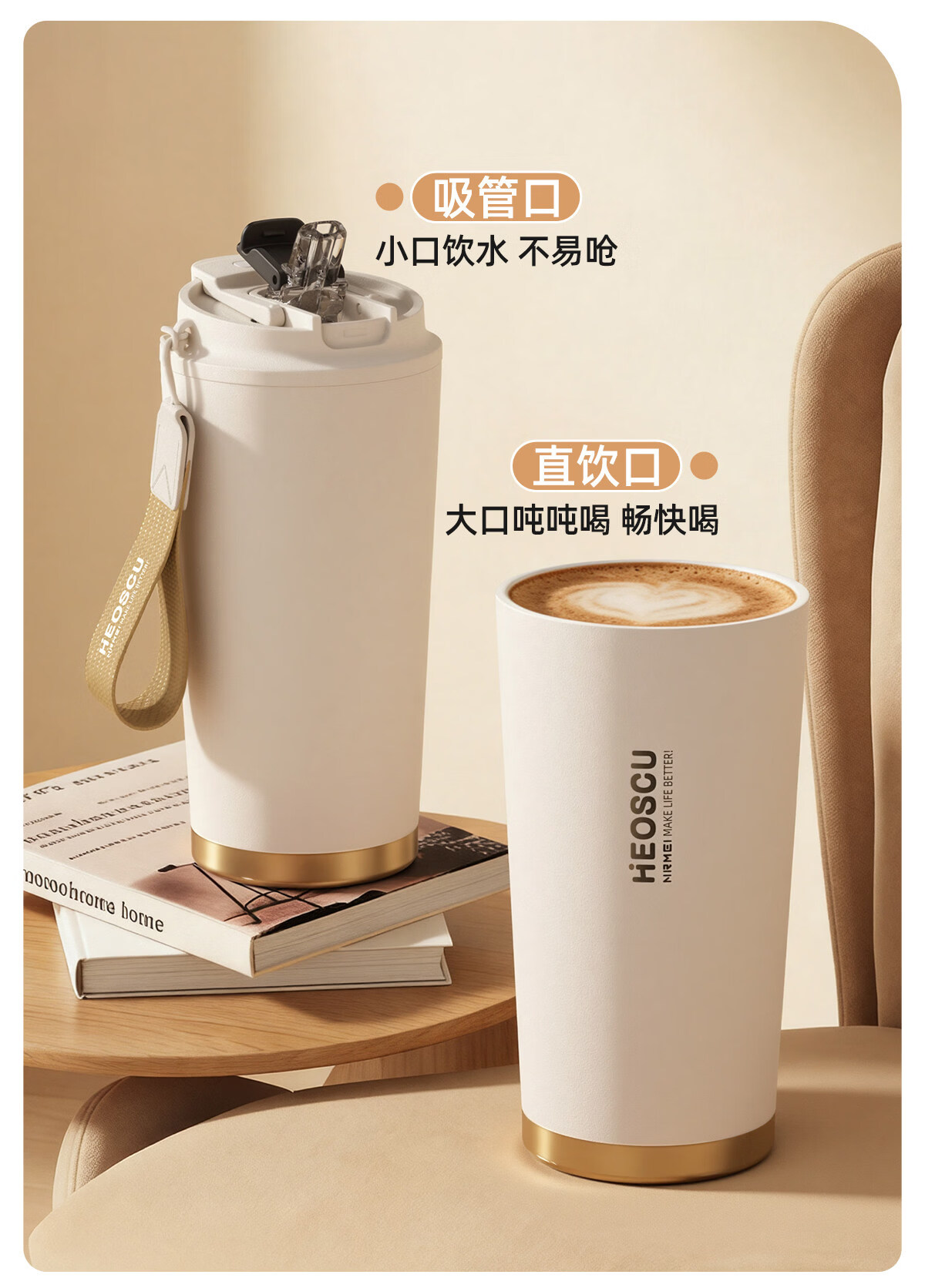 恩尔美(nRMEi)咖啡保温杯大容量男女款316不锈钢男女士便携车载双饮吸管水杯子 【316内胆款】柔雾白500ml【一杯双饮/便携提绳】