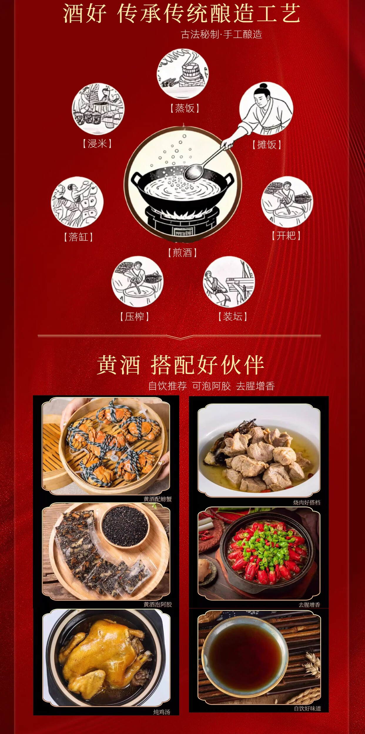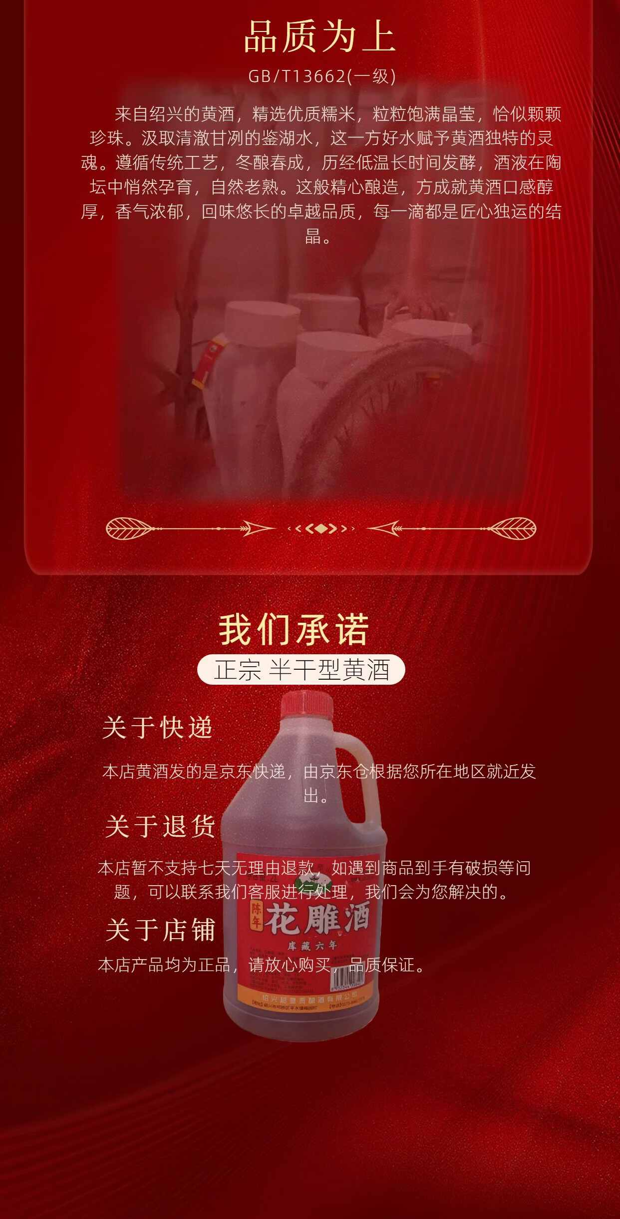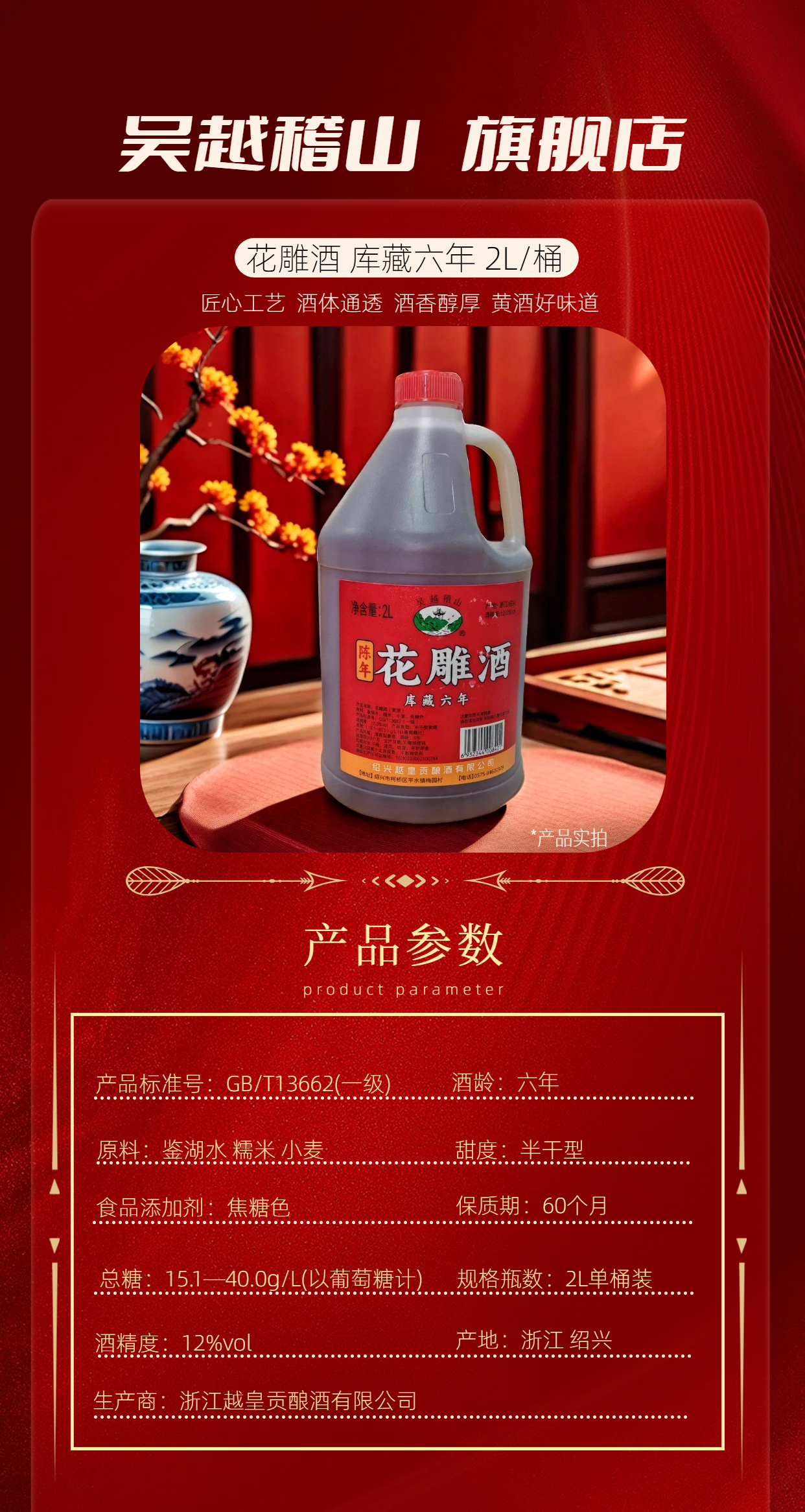 吴越稽山正宗绍兴花雕酒黄酒手工酿造家用老酒六年花雕酒 2L 1桶单瓶装