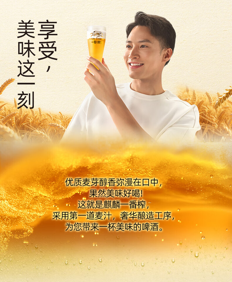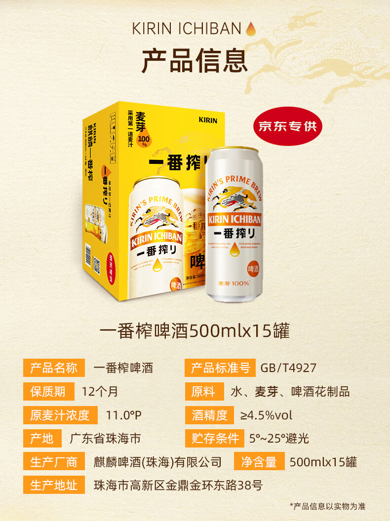 麒麟(Kirin)一番榨 黄啤酒 500ml*15听 整箱装 清爽口感 京东自营