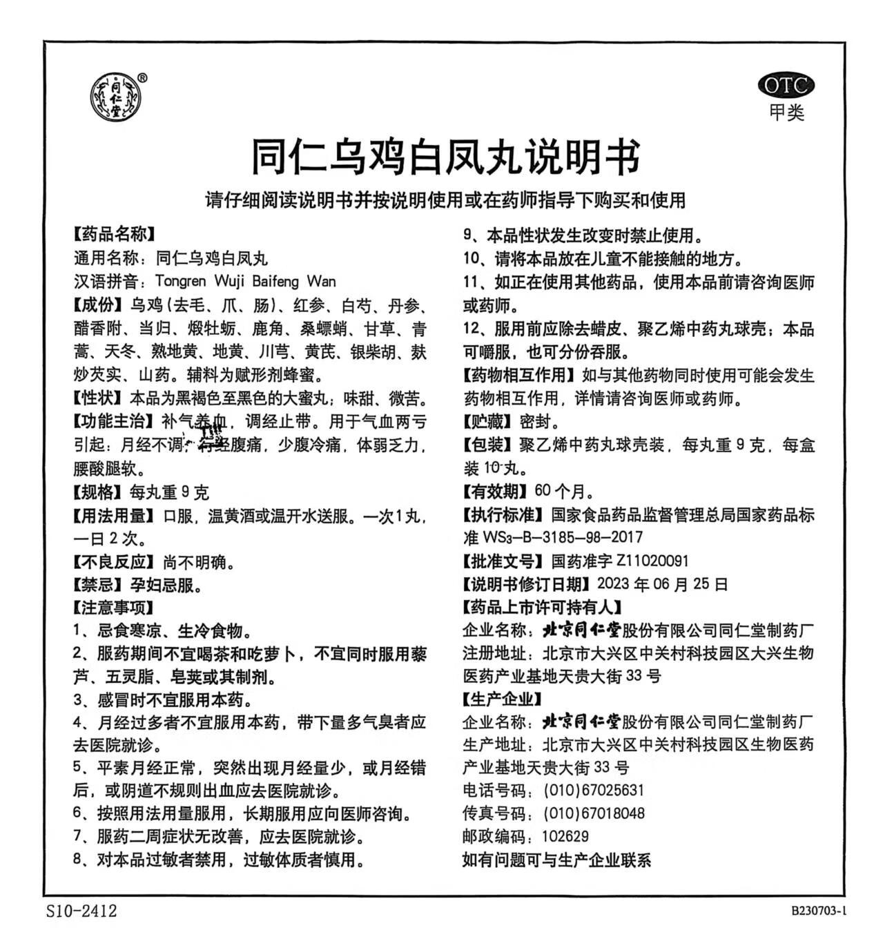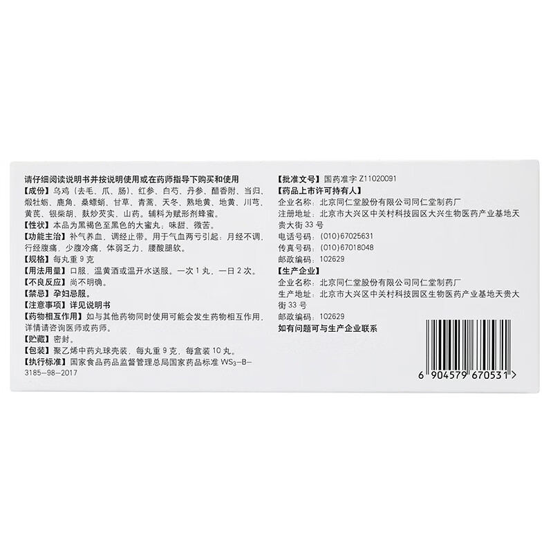 北京同仁堂 同仁乌鸡白凤丸 9g*10丸大蜜丸 补气养血调经止带月经不调妇科用药非处方药
