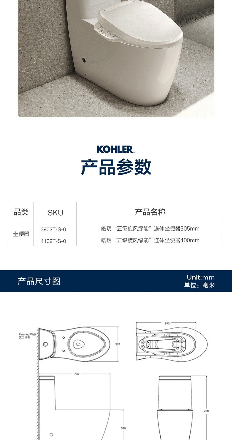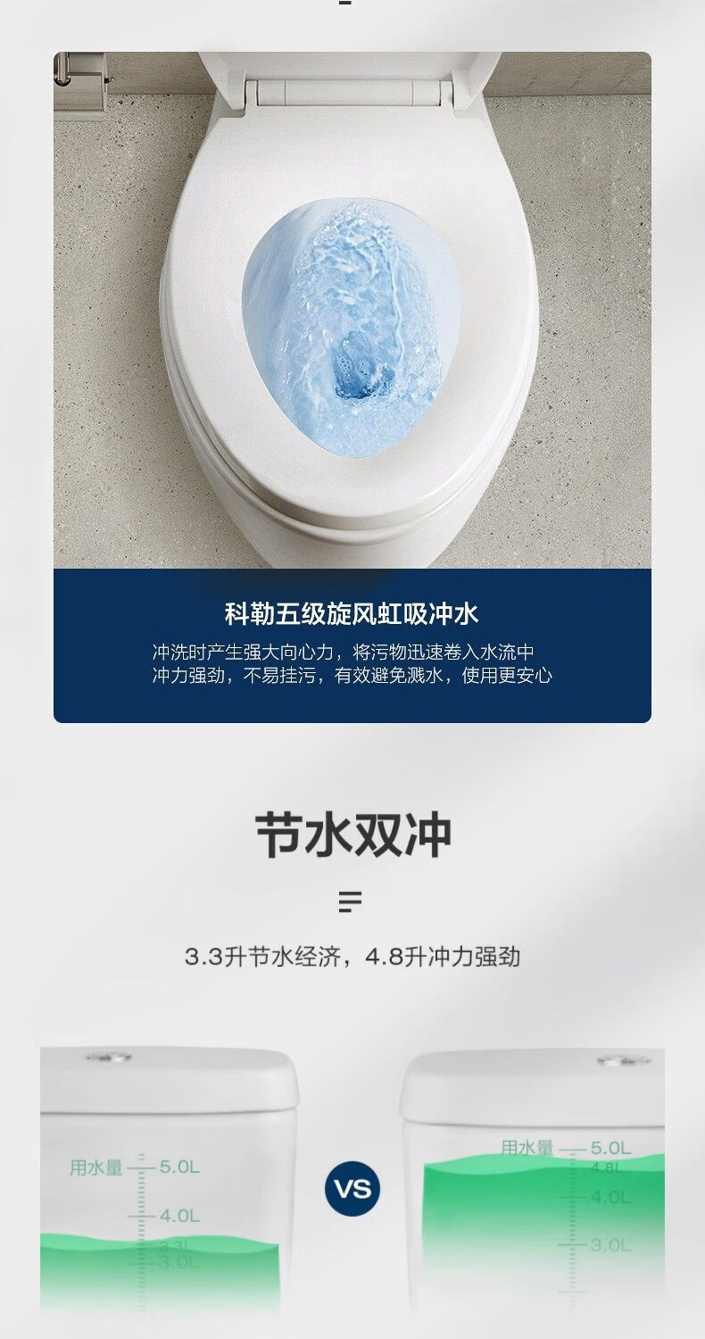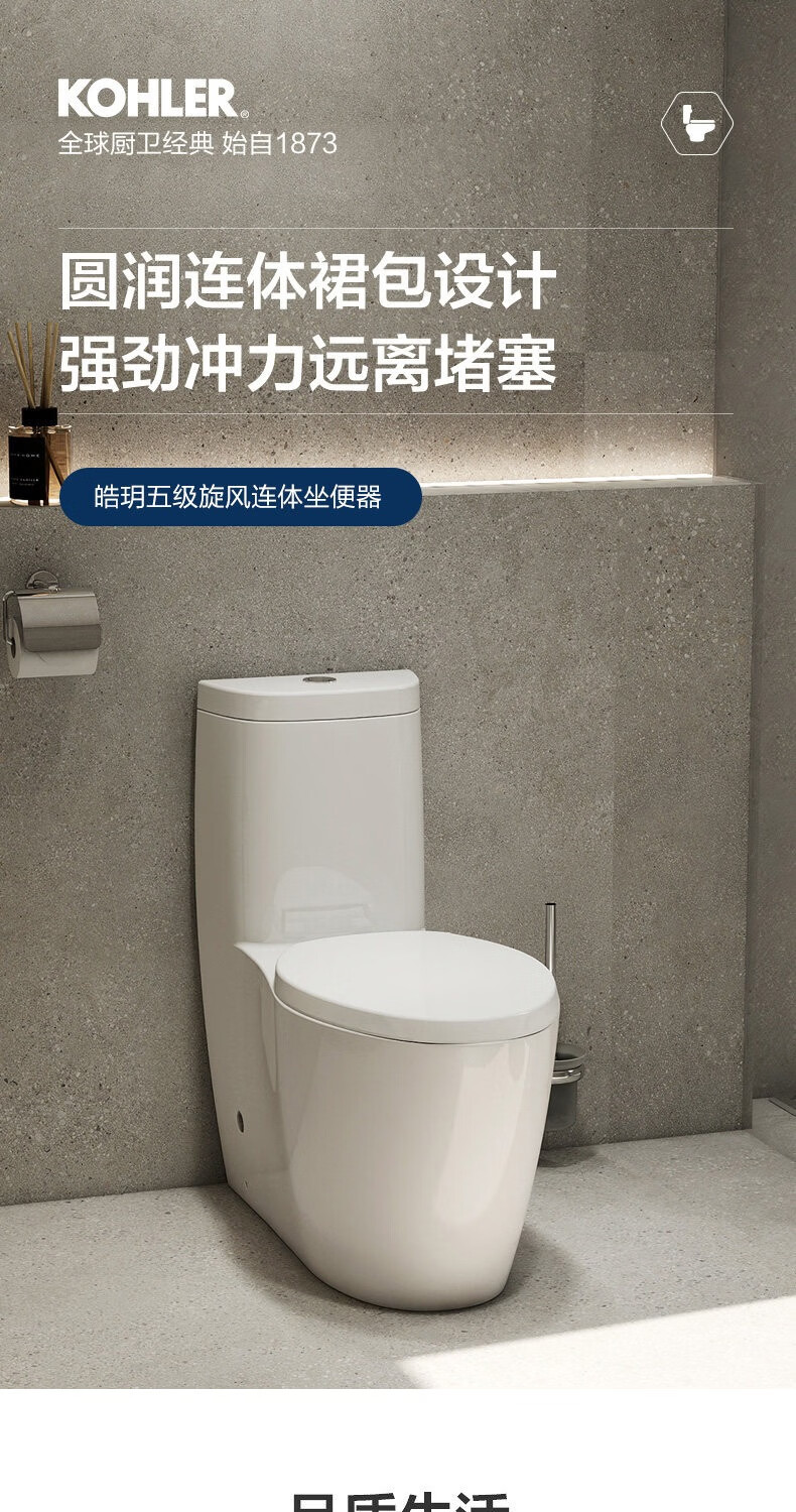 科勒(KOHLER)五级旋风马桶皓玥家用卫生间坐便器缓降连体式马桶小户型3902T 皓玥连体坐便器 305/300mm
