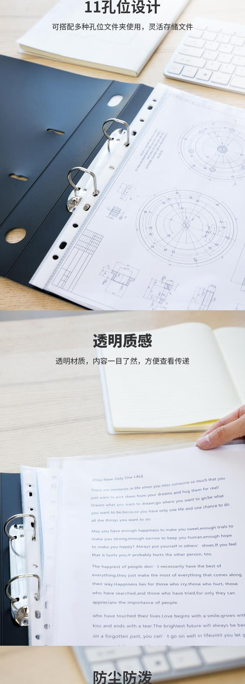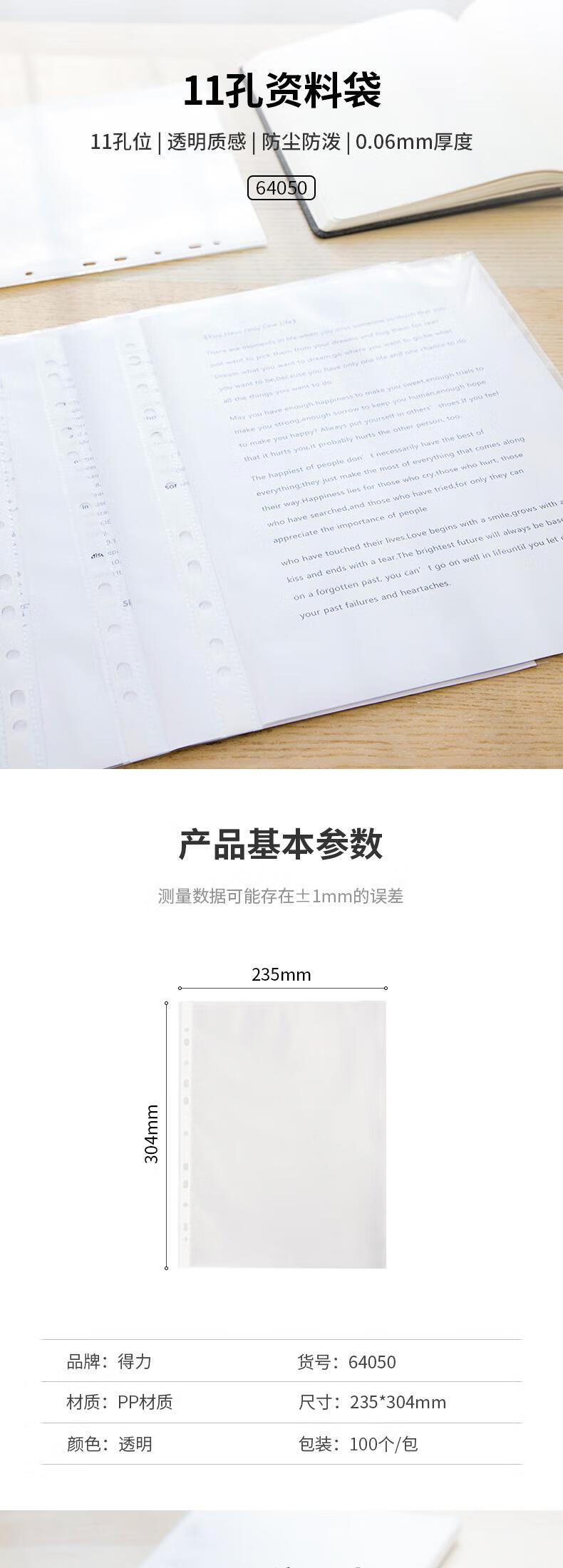 得力(deli)100个装11孔透明文件袋 A4插页文件快递袋活页文件档案奖状资料袋替芯 办公财务票据收纳学生64050