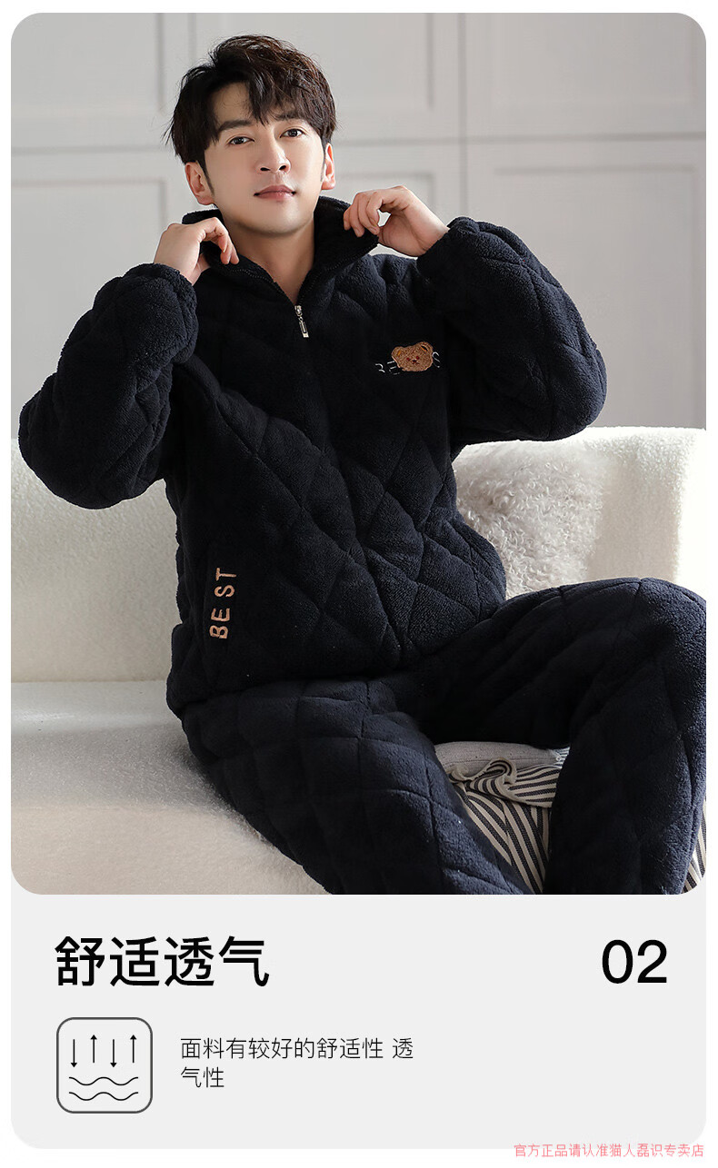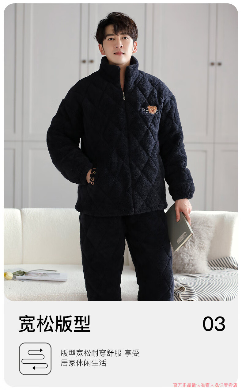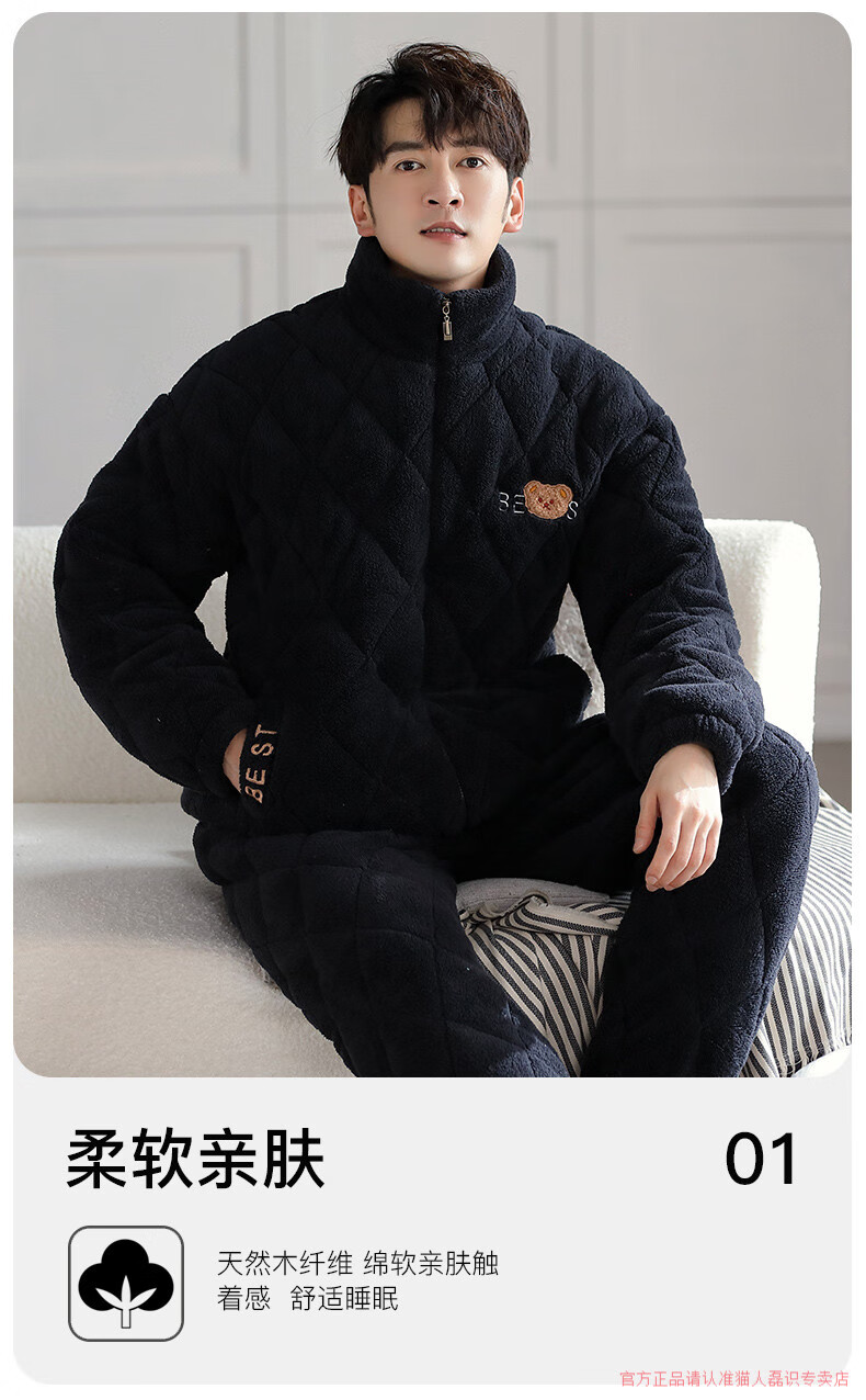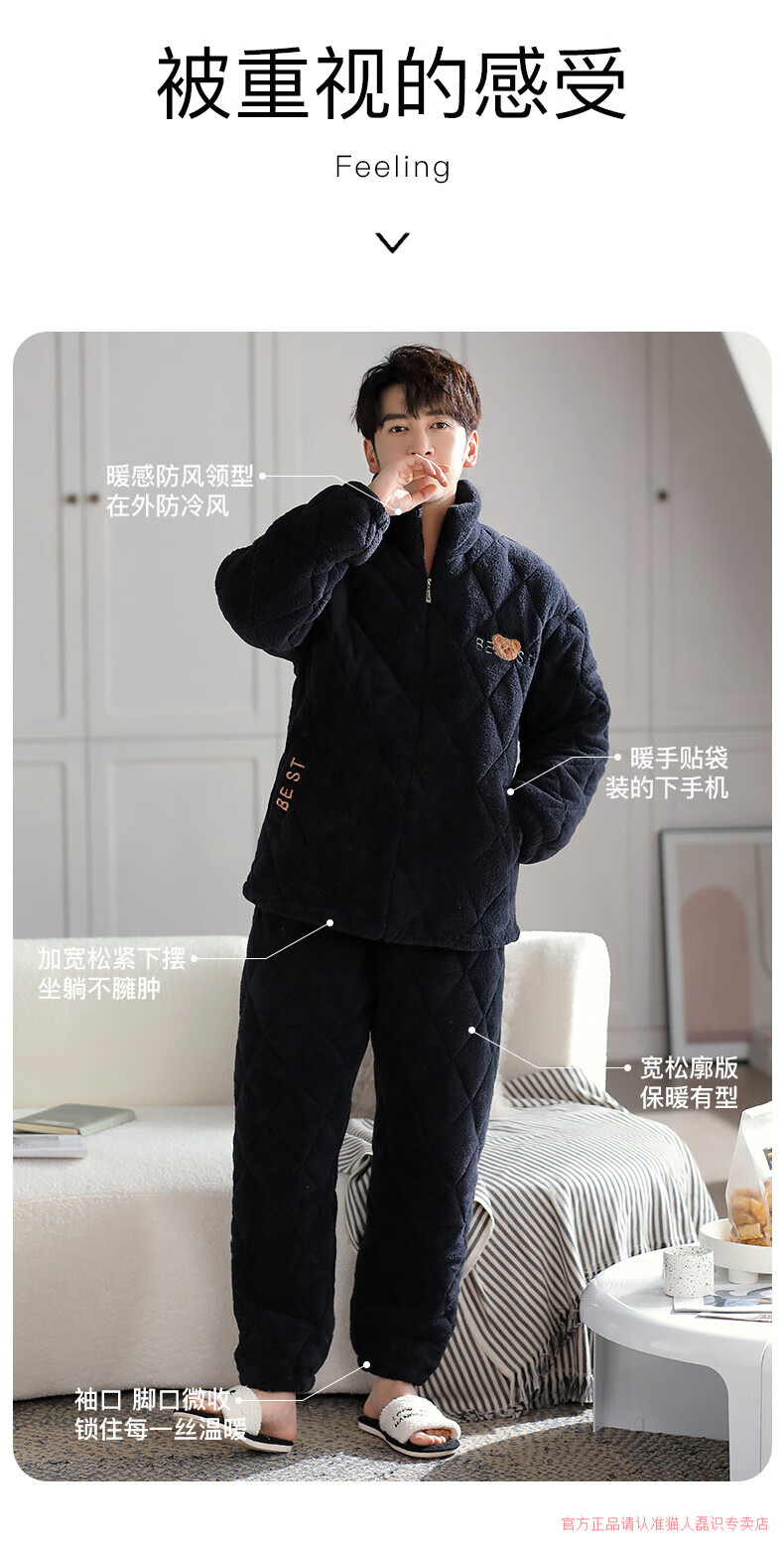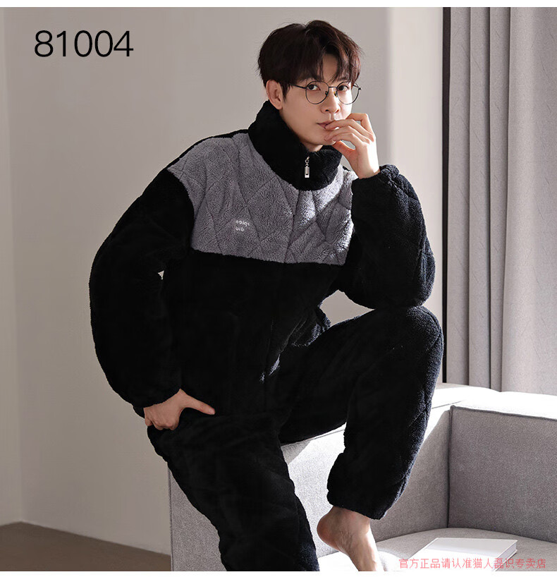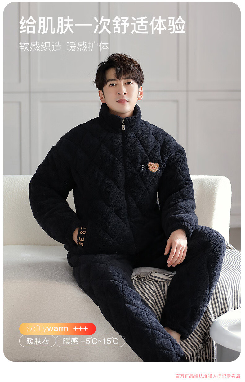 猫人(MiiOW)睡衣男秋冬季加绒加厚2025新款珊瑚绒保暖三层夹棉家居服套装 暗黑色 【三层加厚·蓄热保暖】 XL 【130-150斤】