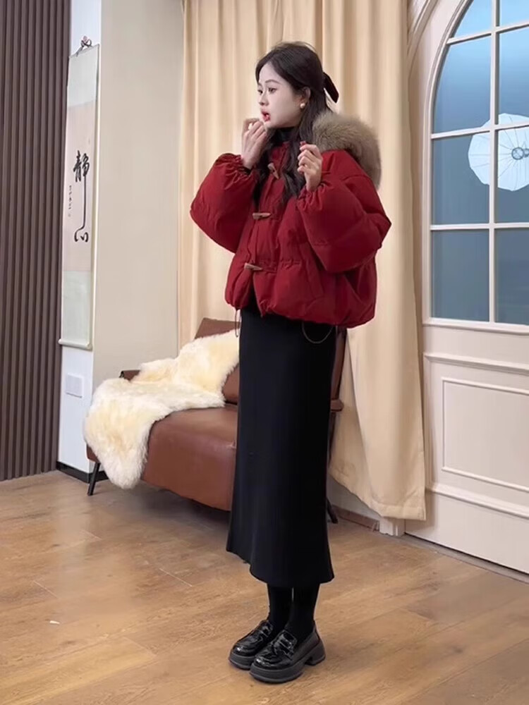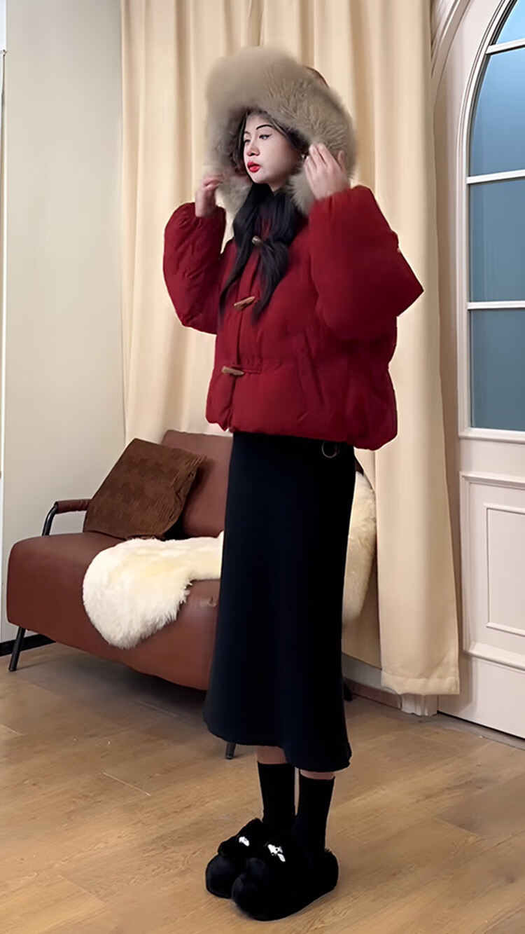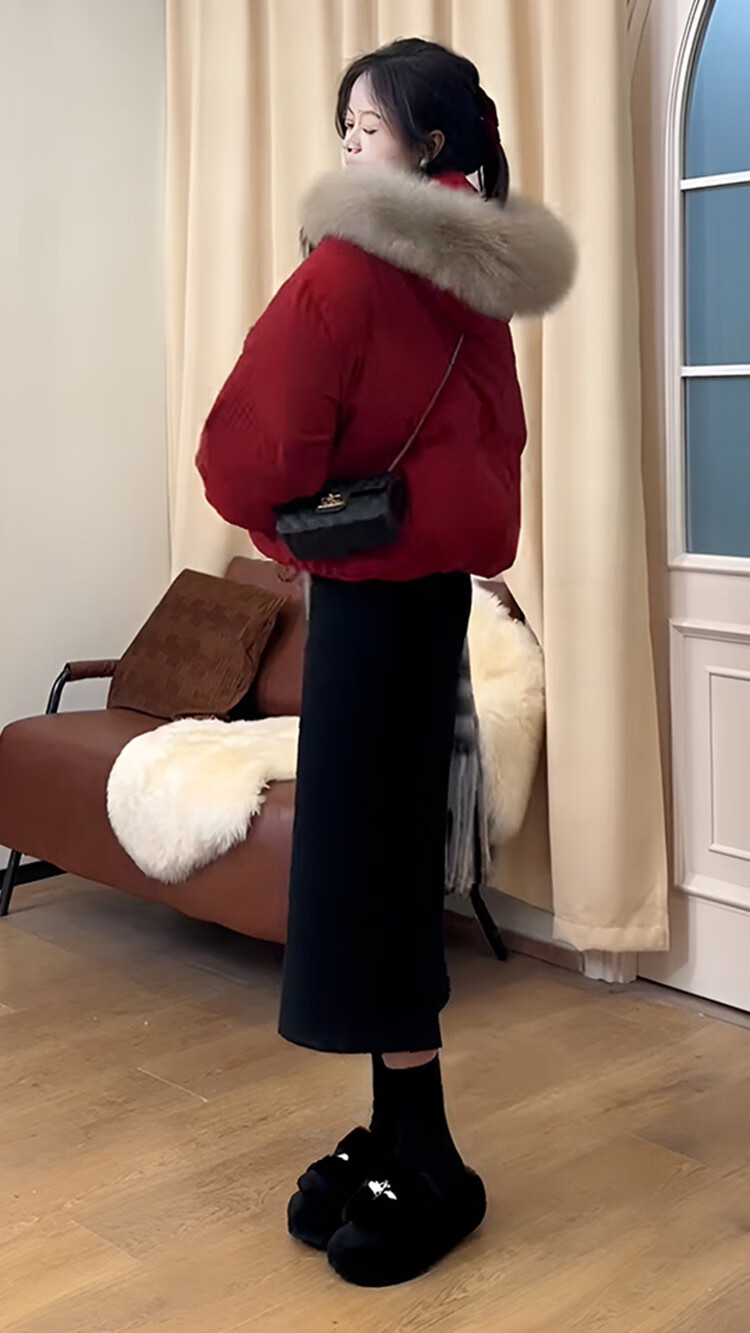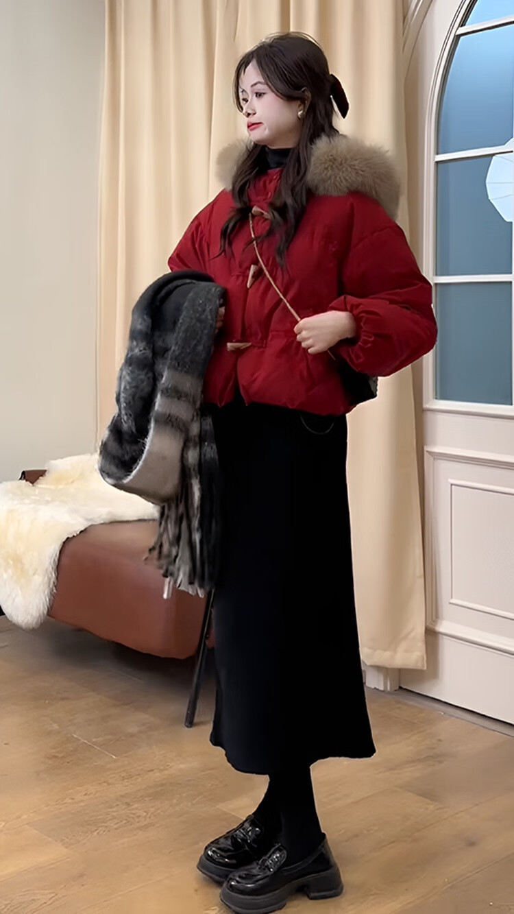 雅黛丝薇连衣裙新年战袍红色棉服外套女冬季2025新款韩系高级感两件套装裙 红色棉服+黑色针织半身裙 M (棉服110-125斤)