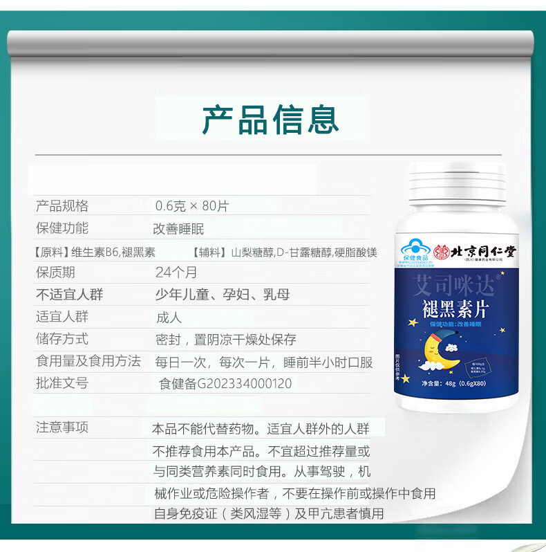 同仁堂北京朕皇蓝帽认证褪黑素维生素b6改善睡眠失眠褪黑素片成人中老年 拍1共发2【包含赠送共发2瓶同款】共160片 80粒*1瓶