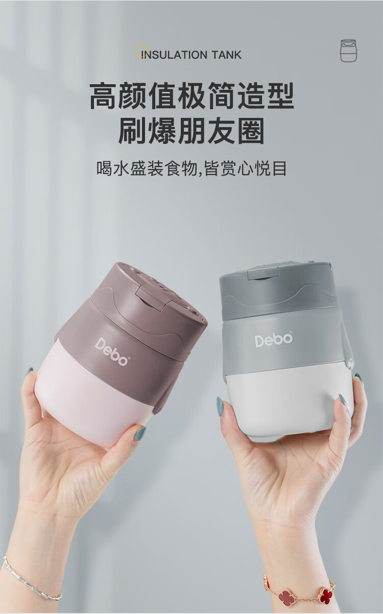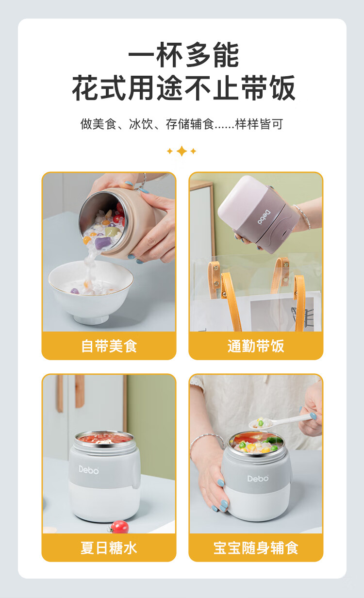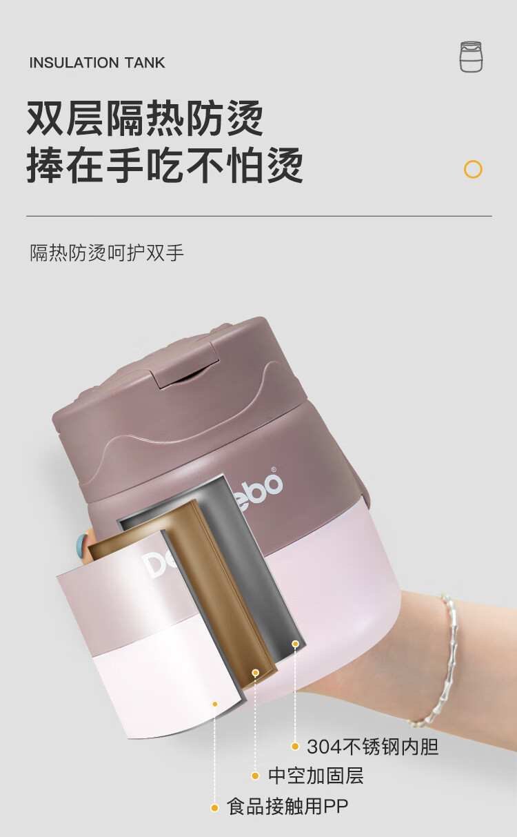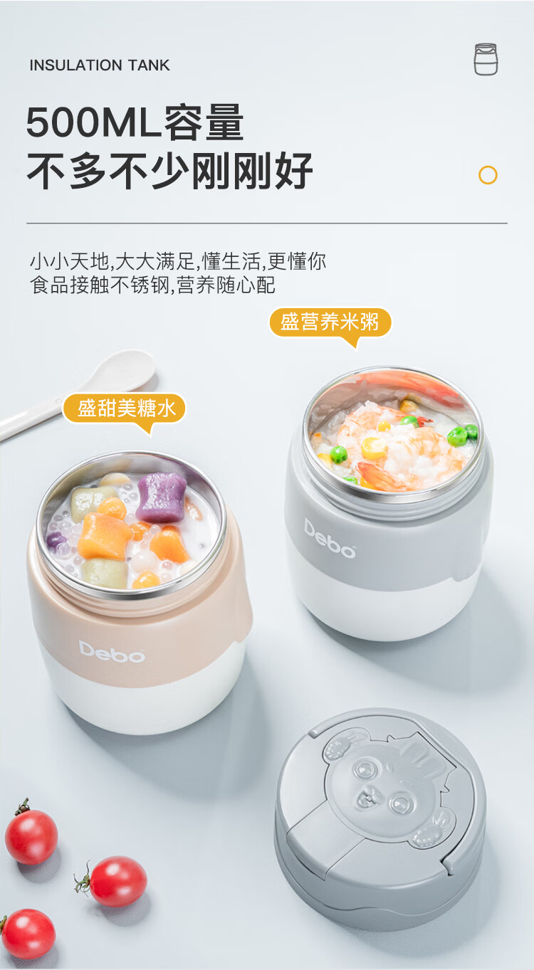 Debo德铂304不锈钢便携早餐杯汤杯带盖上班族餐盒汤罐 露比-灰色-500ml