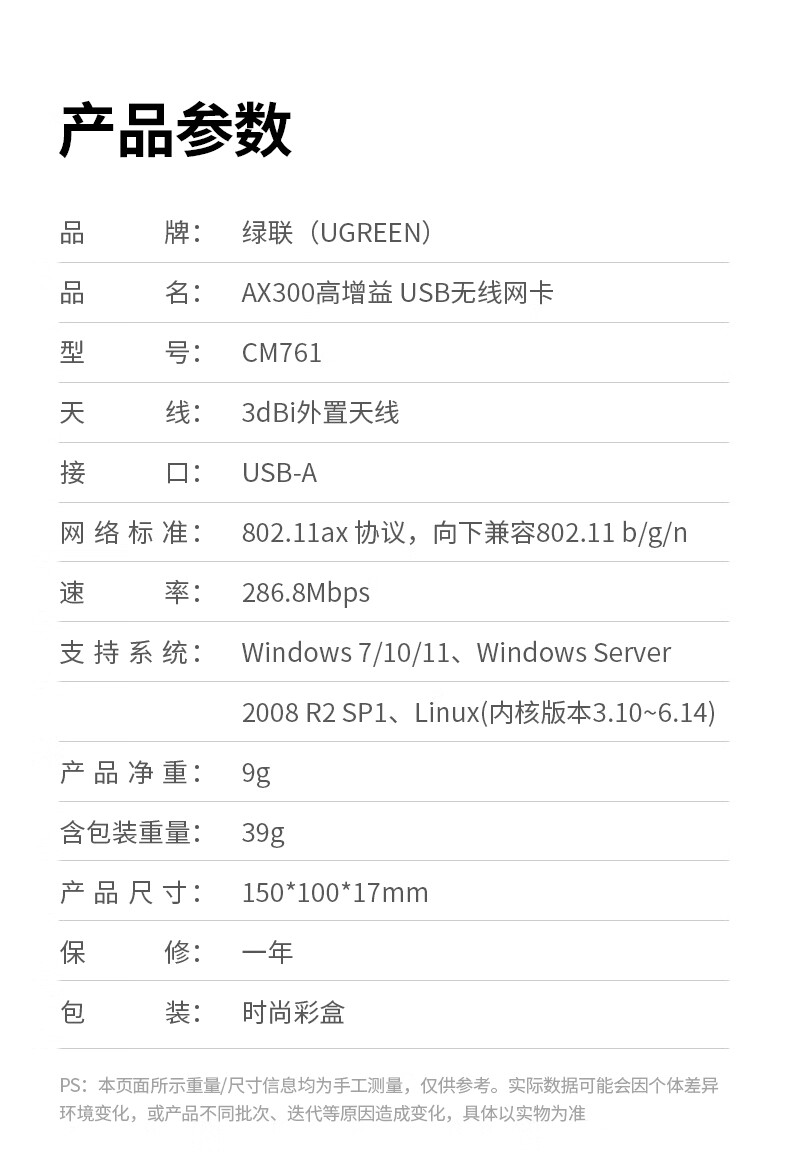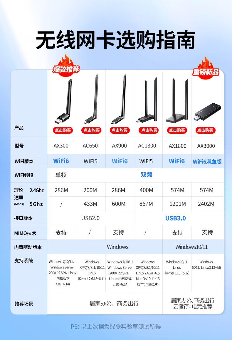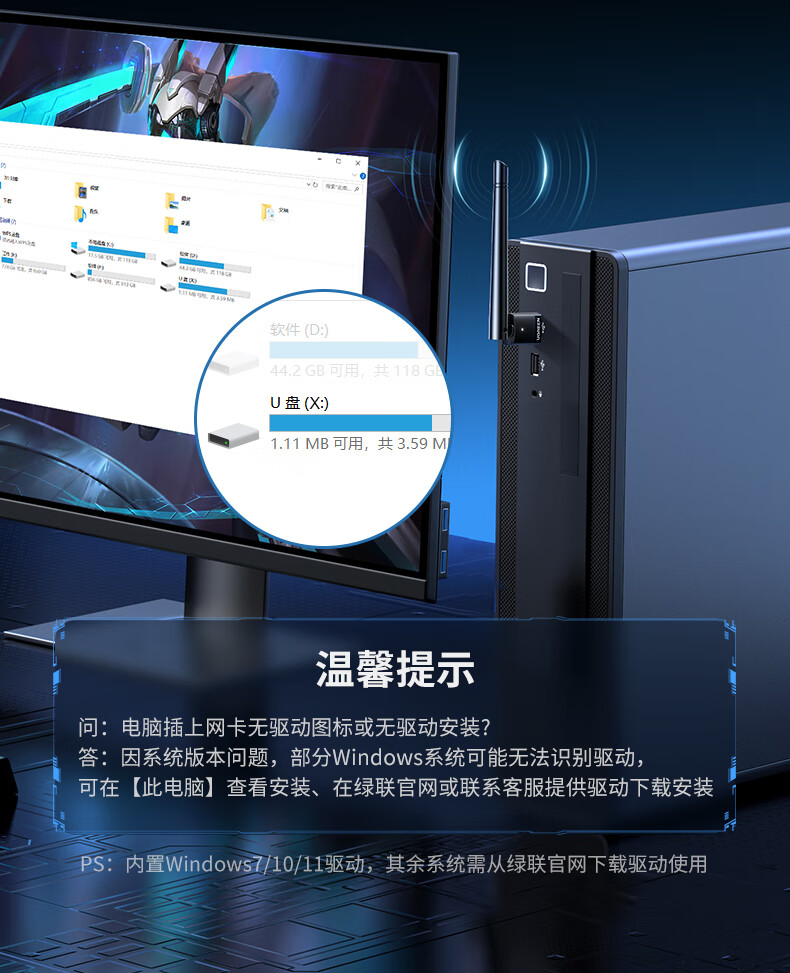 绿联USB无线网卡WiFi6 智能免驱AX300 无线WiFi接收器台式机专用电脑无线网 笔记本网络接收器外置天线