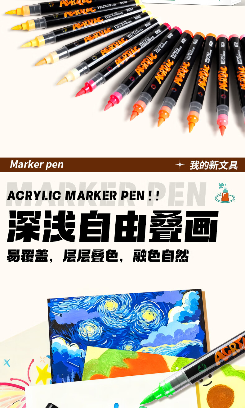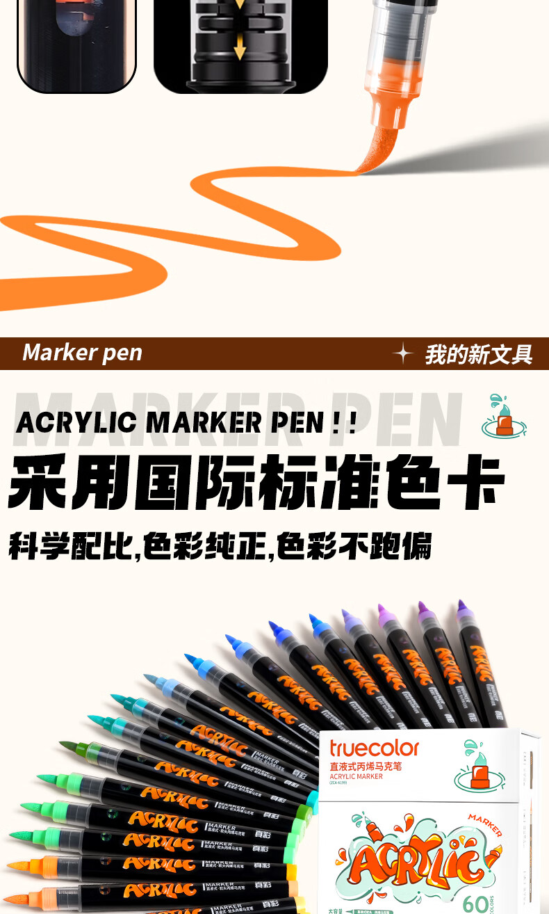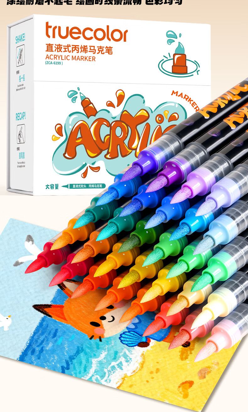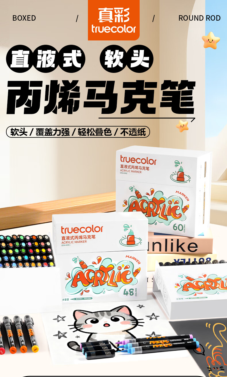 真彩(TRUECOLOR)60色直液式软头丙烯马克笔小学生专用不透色可叠色美术专用儿童无毒可水洗水彩笔幼儿园画画笔6199