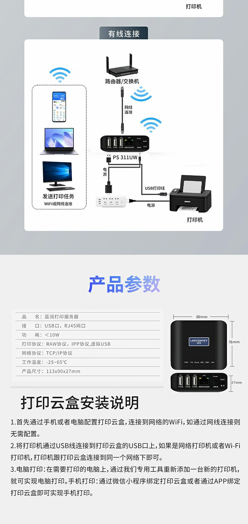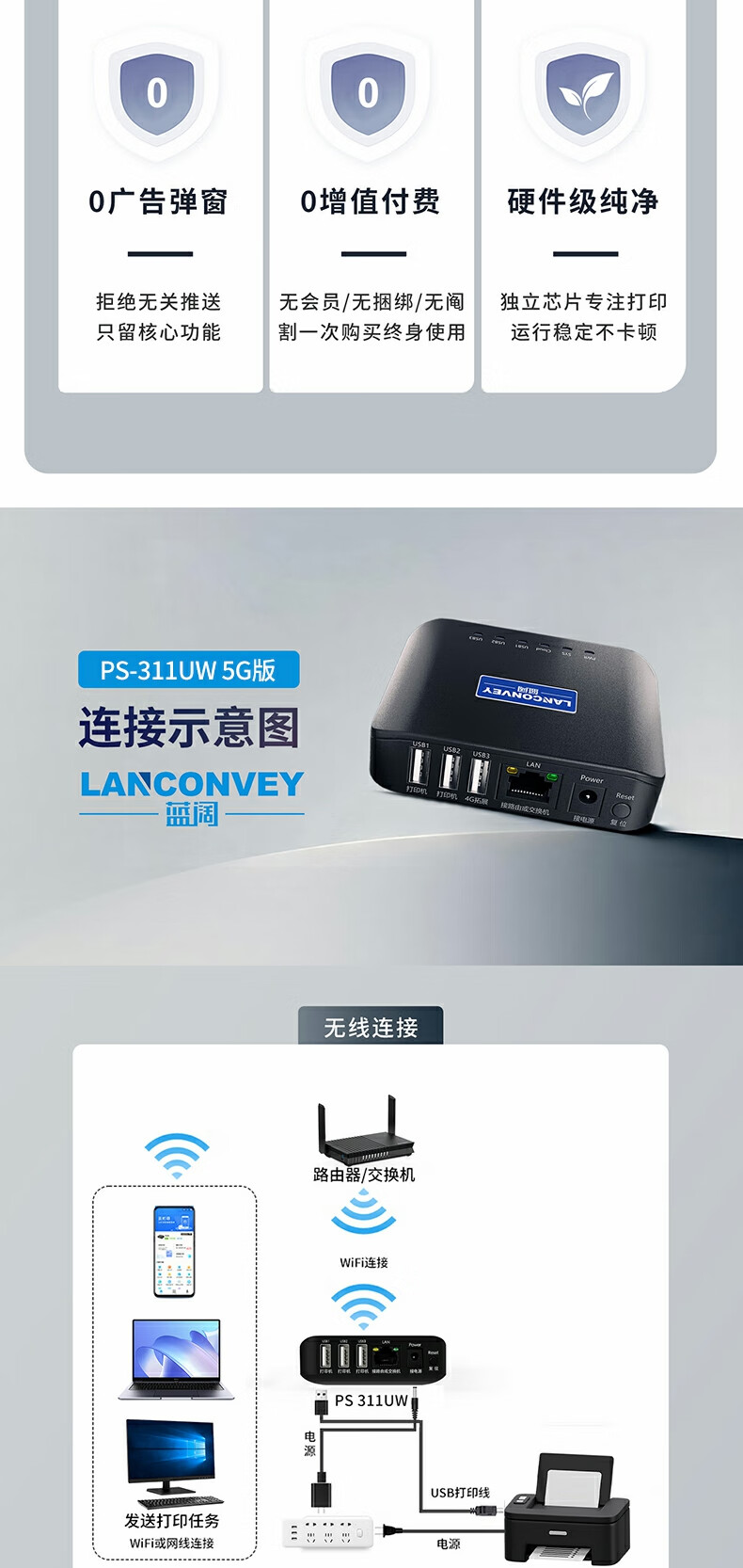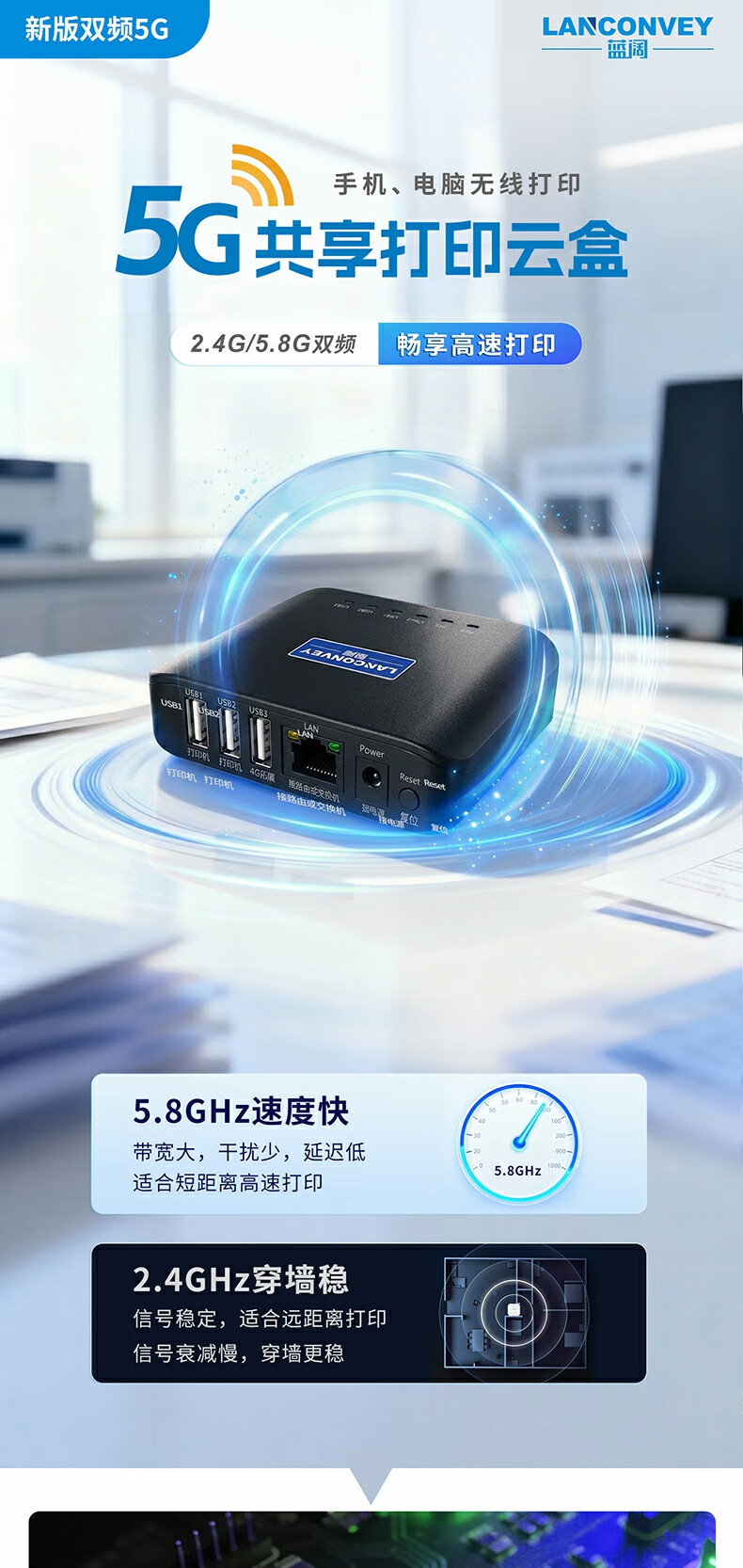 蓝阔支持双频5.8G 2.4GWiFi手机远程电脑无线共享USB打印机转网络 PS311UW 5G版