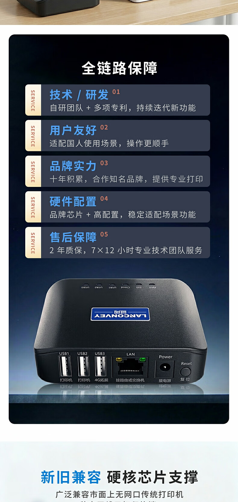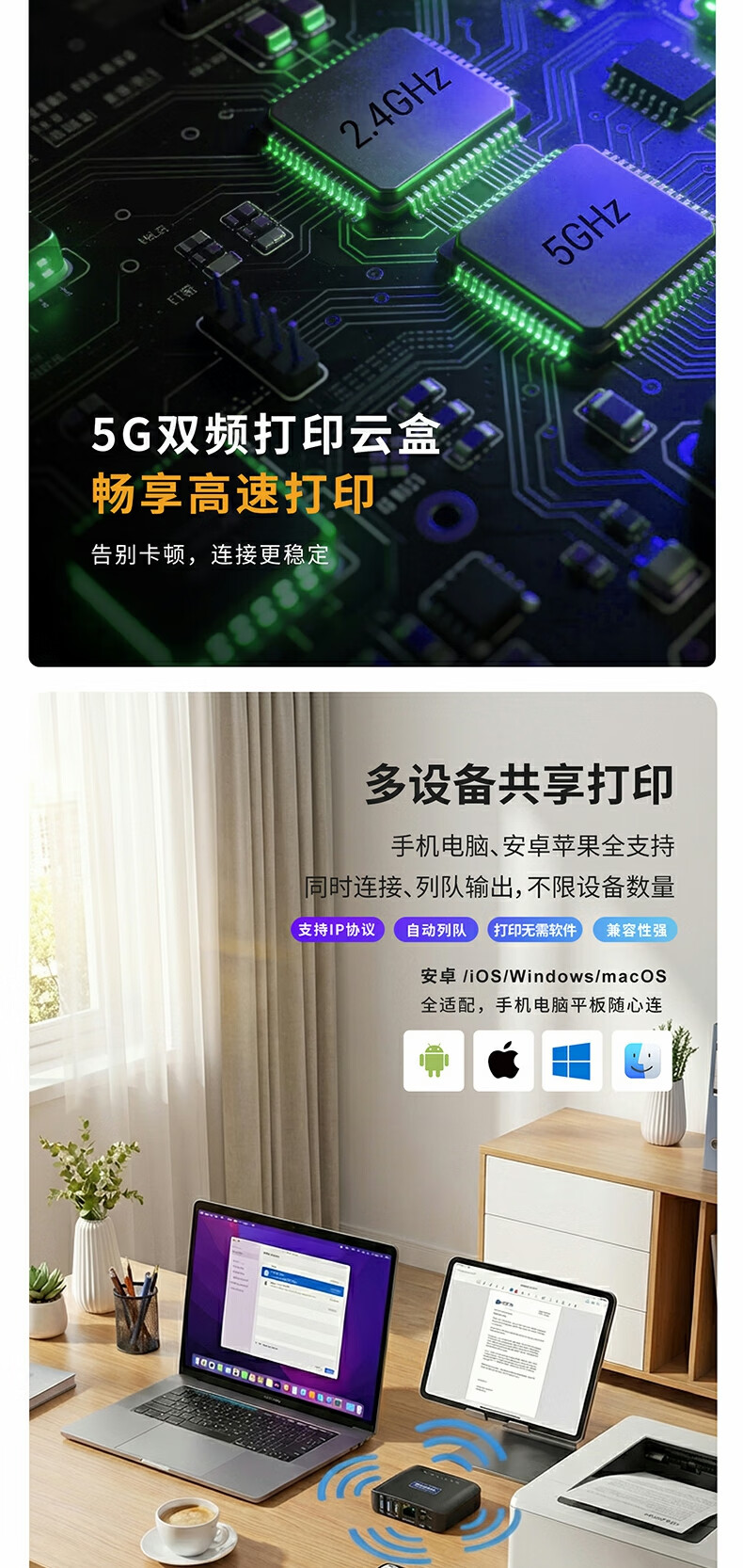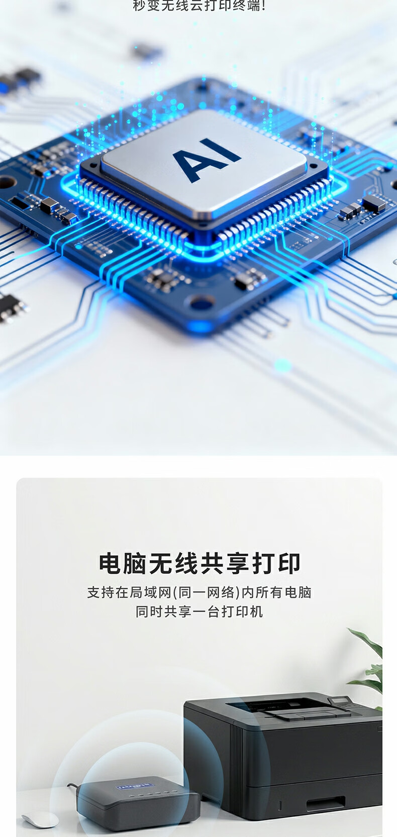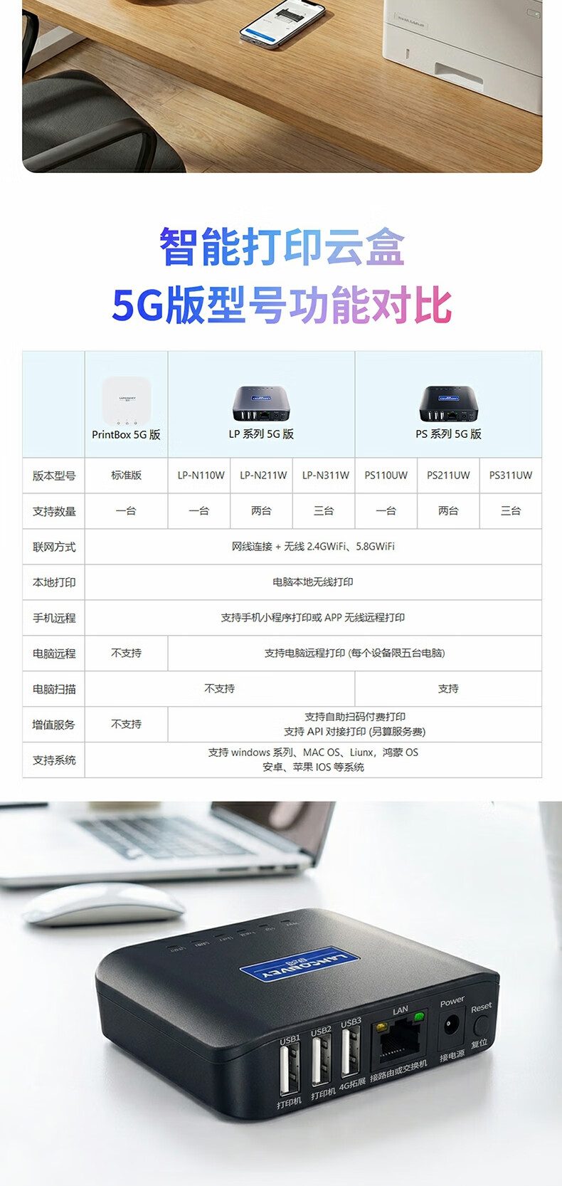 蓝阔支持双频5.8G 2.4GWiFi手机远程电脑无线共享USB打印机转网络 PS311UW 5G版