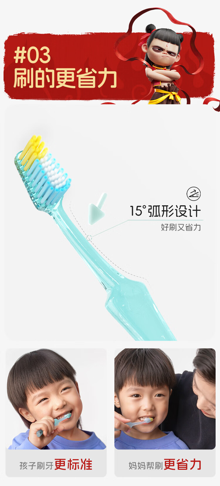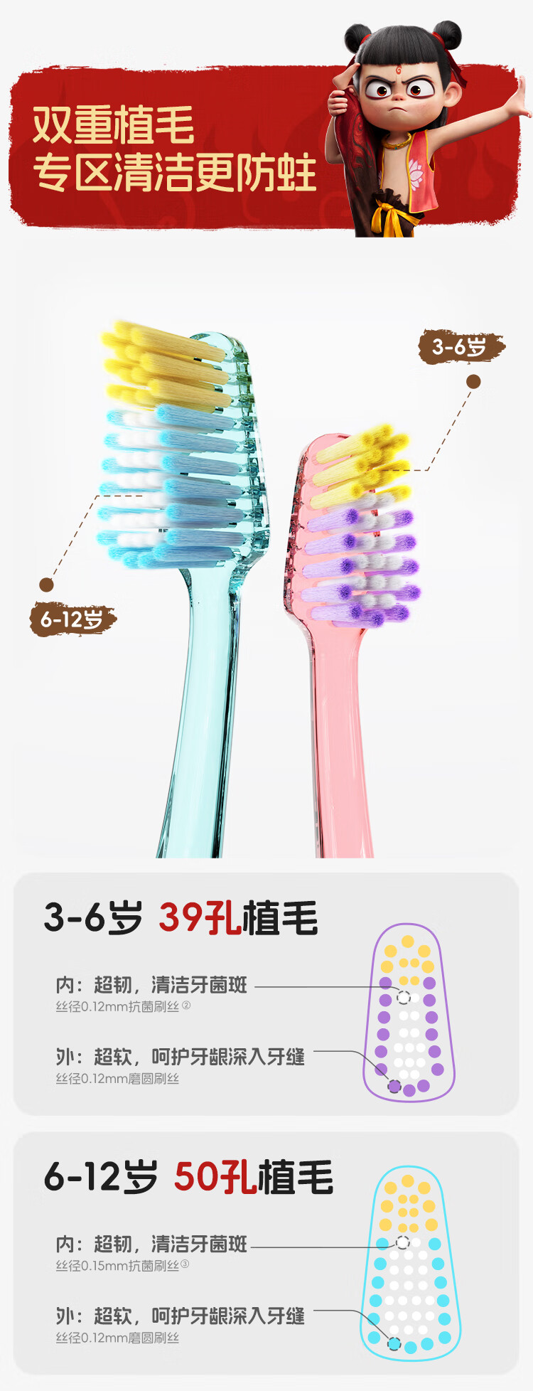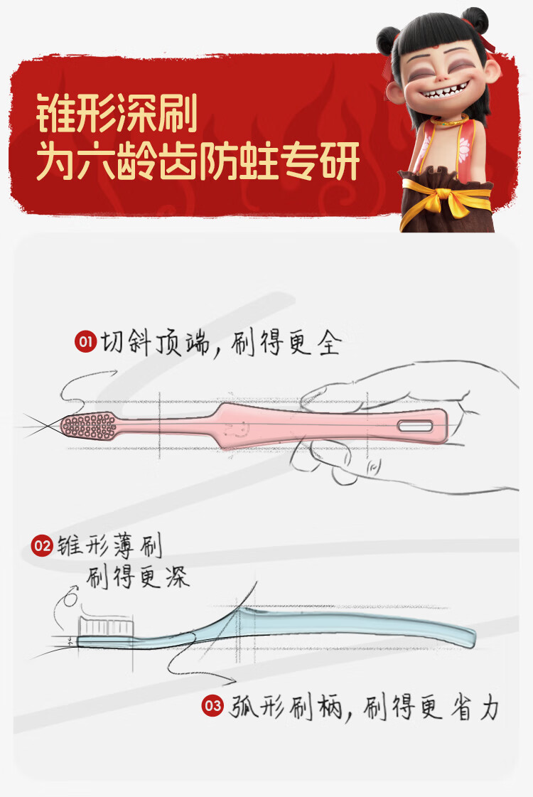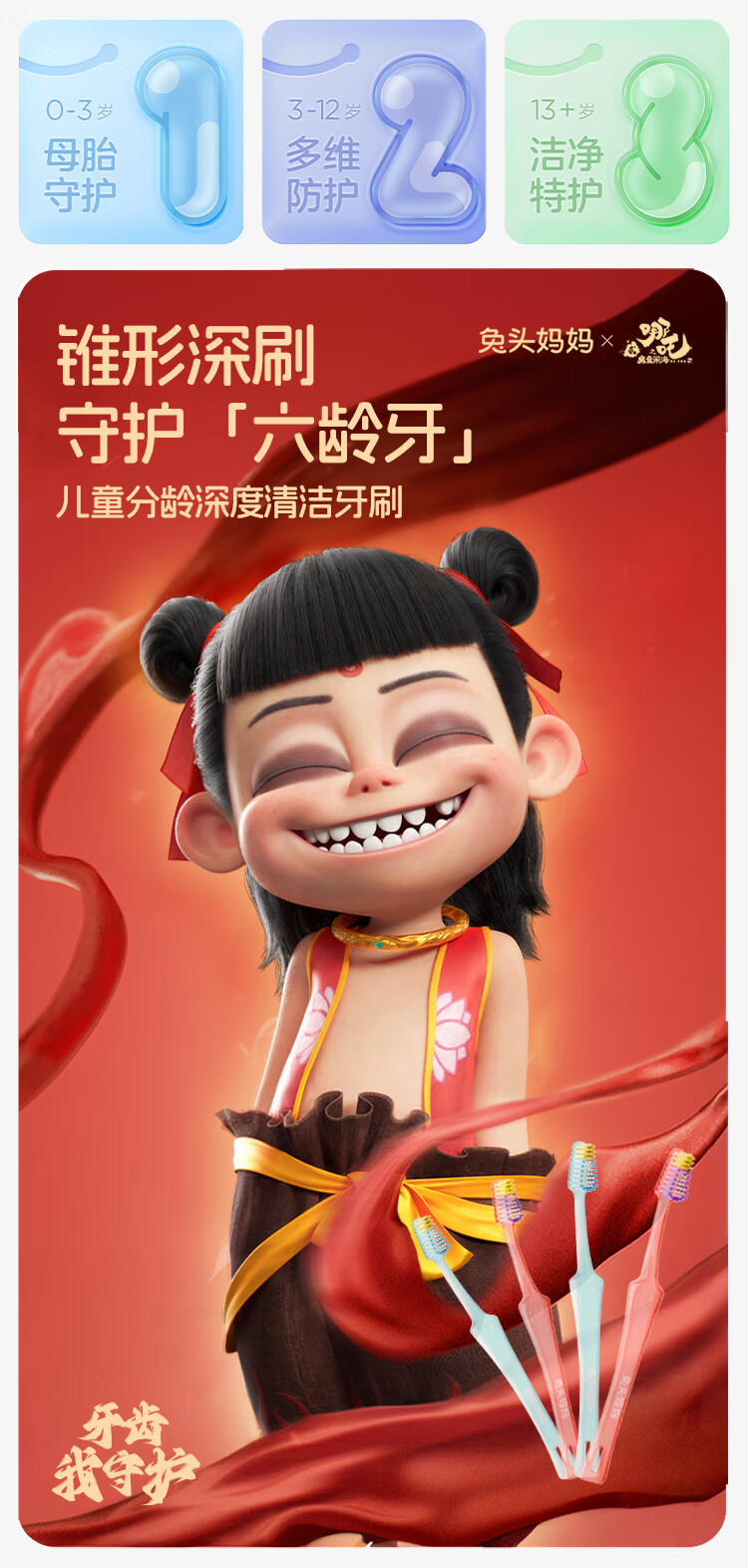 兔头妈妈哪吒联名 儿童牙刷锥形深刷守护六龄牙 深度清洁牙刷2支装6-12岁