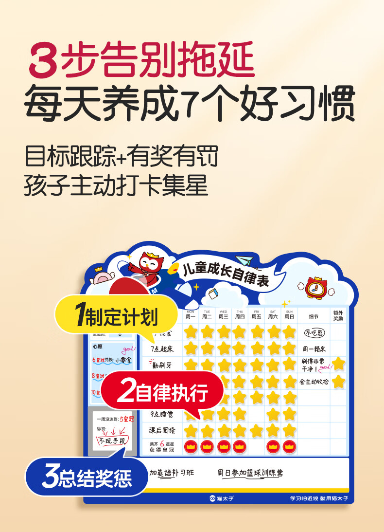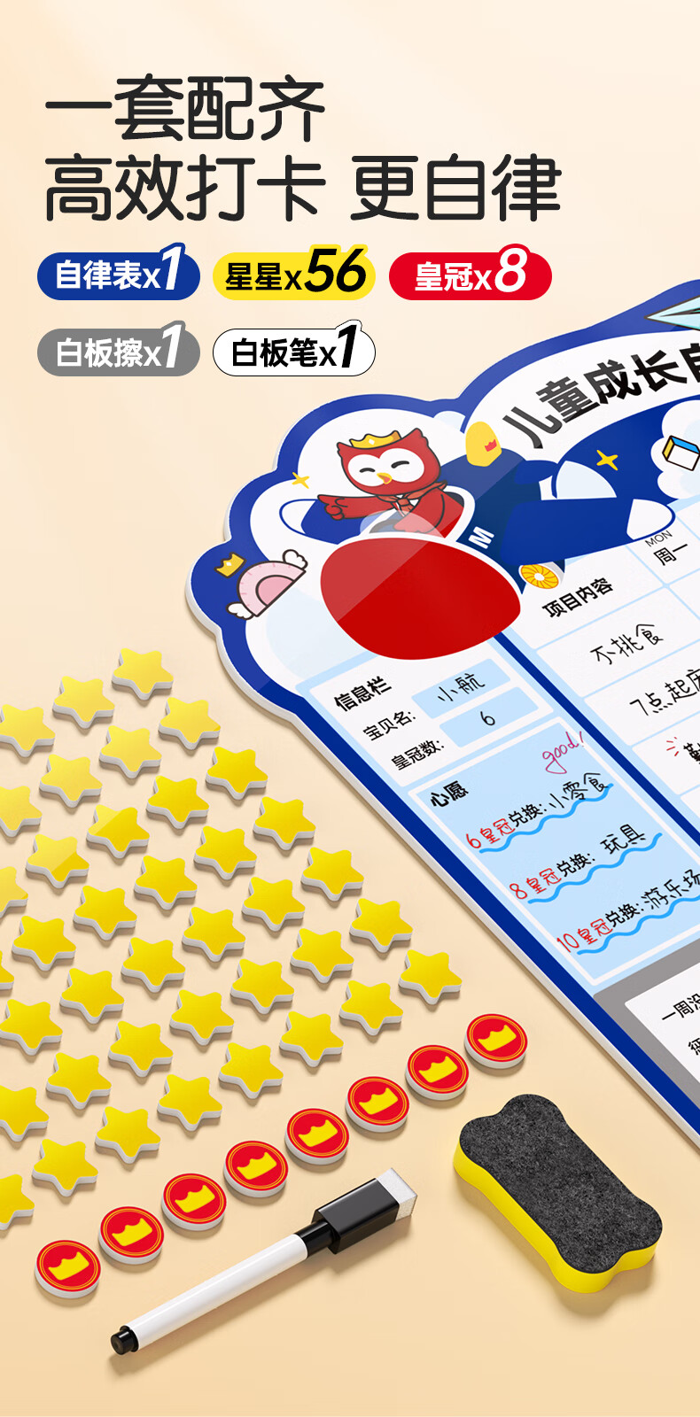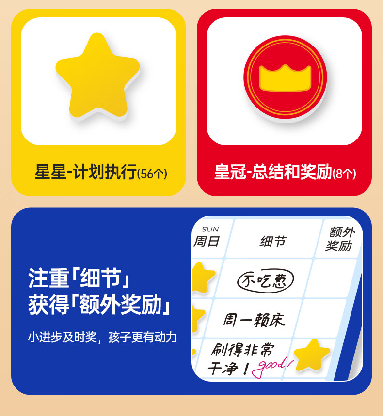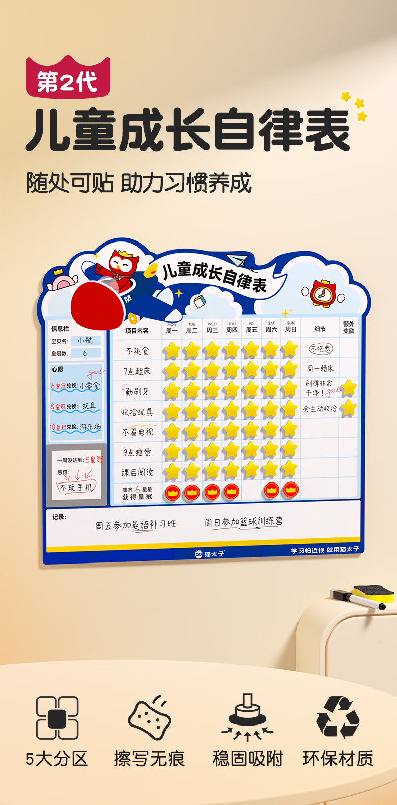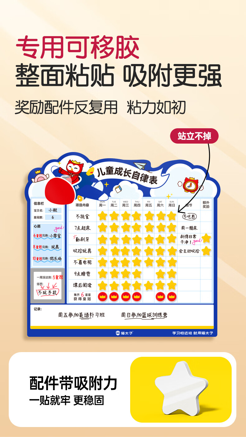 猫太子儿童成长自律表奖励打卡记录表学习计划表墙贴孩子的积分奖励贴纸家庭版提示牌鼓励小学生好习惯 中国红-升级款(56颗星星+8颗皇冠)