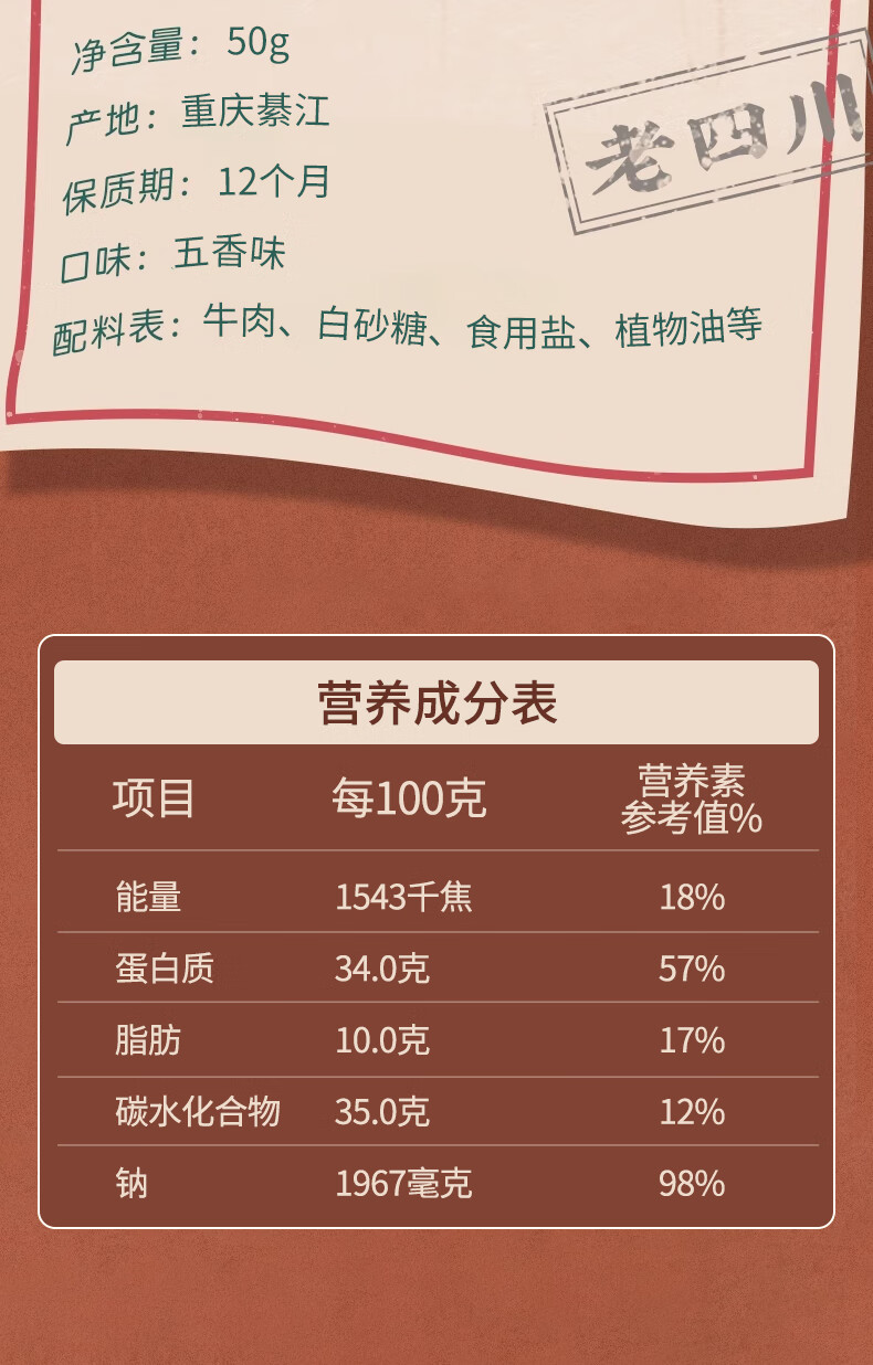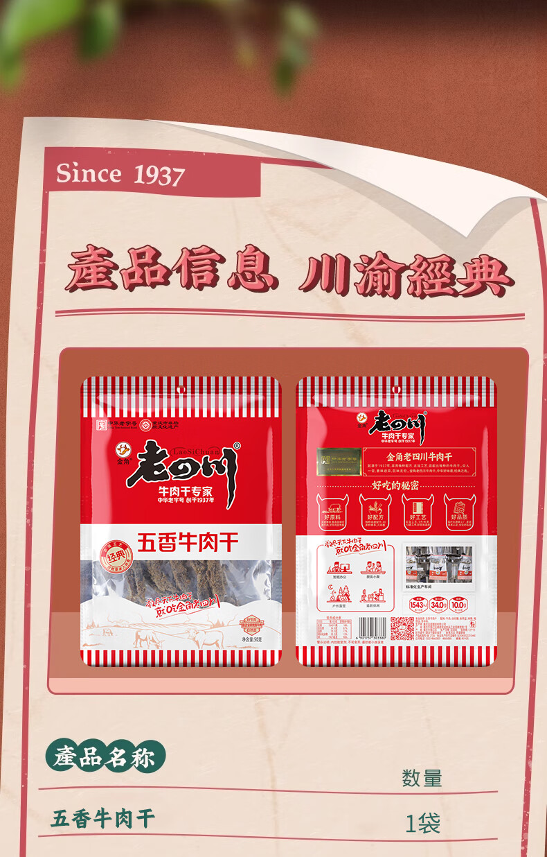 老四川 五香牛肉干50g 休闲零食 四川特产金角中华老字号