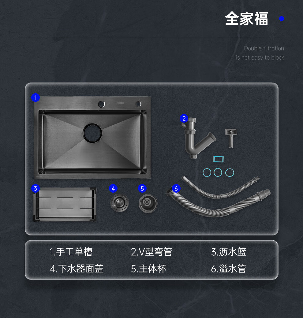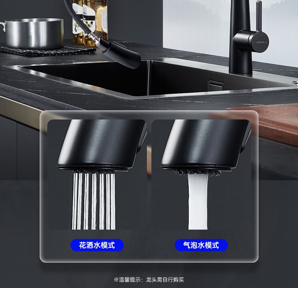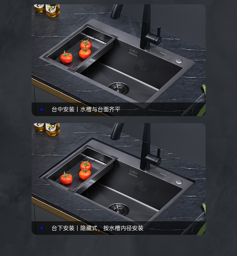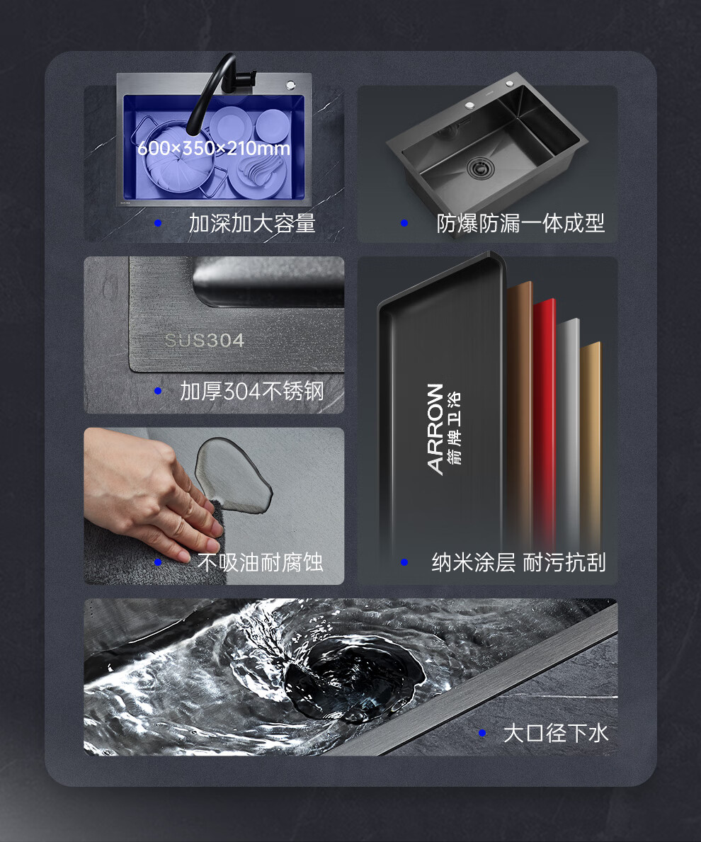 箭牌(ARROW) 304加厚不锈钢手工单槽纳米黑色洗菜厨房洗手盆洗菜池水盆洗碗池 手工单槽75*45cm(抽拉龙头角阀)