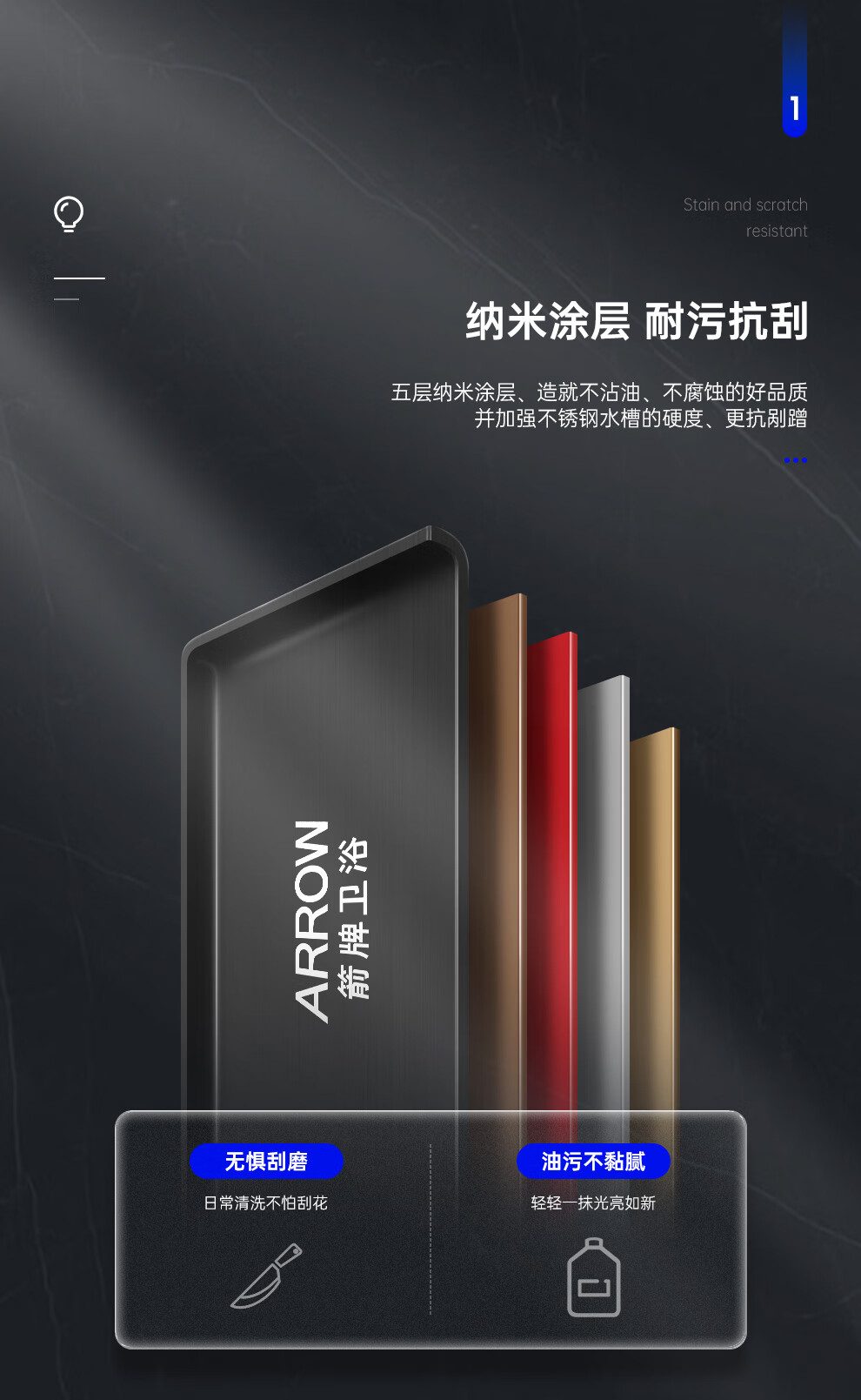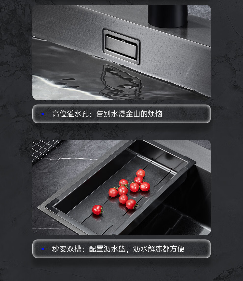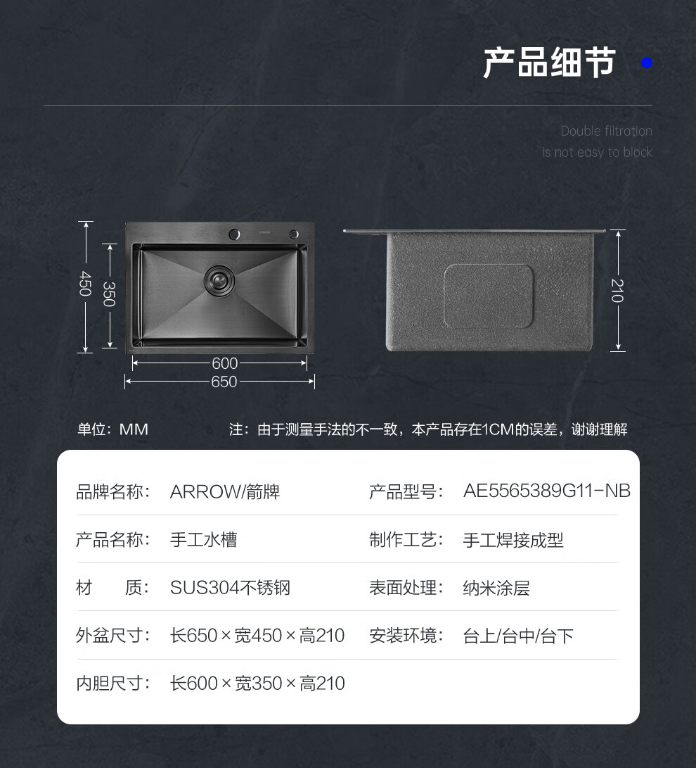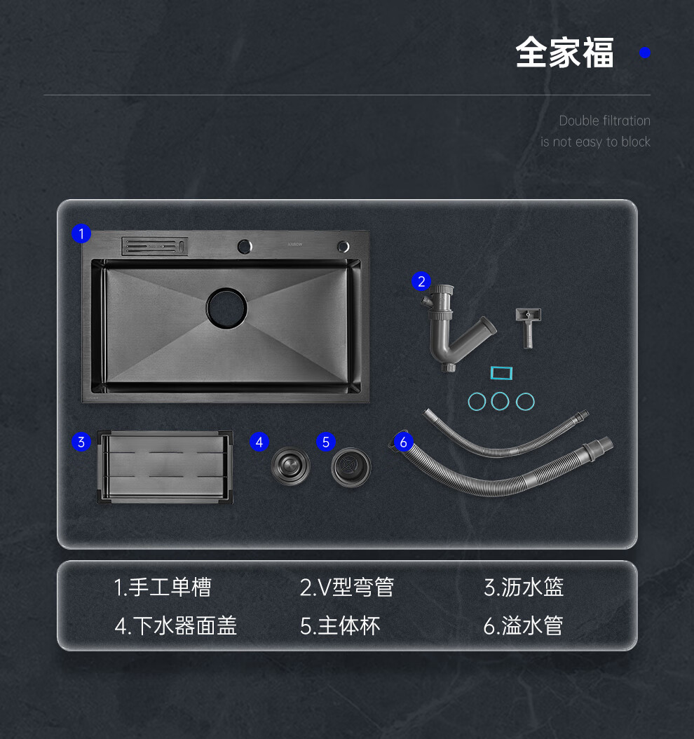 箭牌(ARROW) 304加厚不锈钢手工单槽纳米黑色洗菜厨房洗手盆洗菜池水盆洗碗池 手工单槽75*45cm(抽拉龙头角阀)