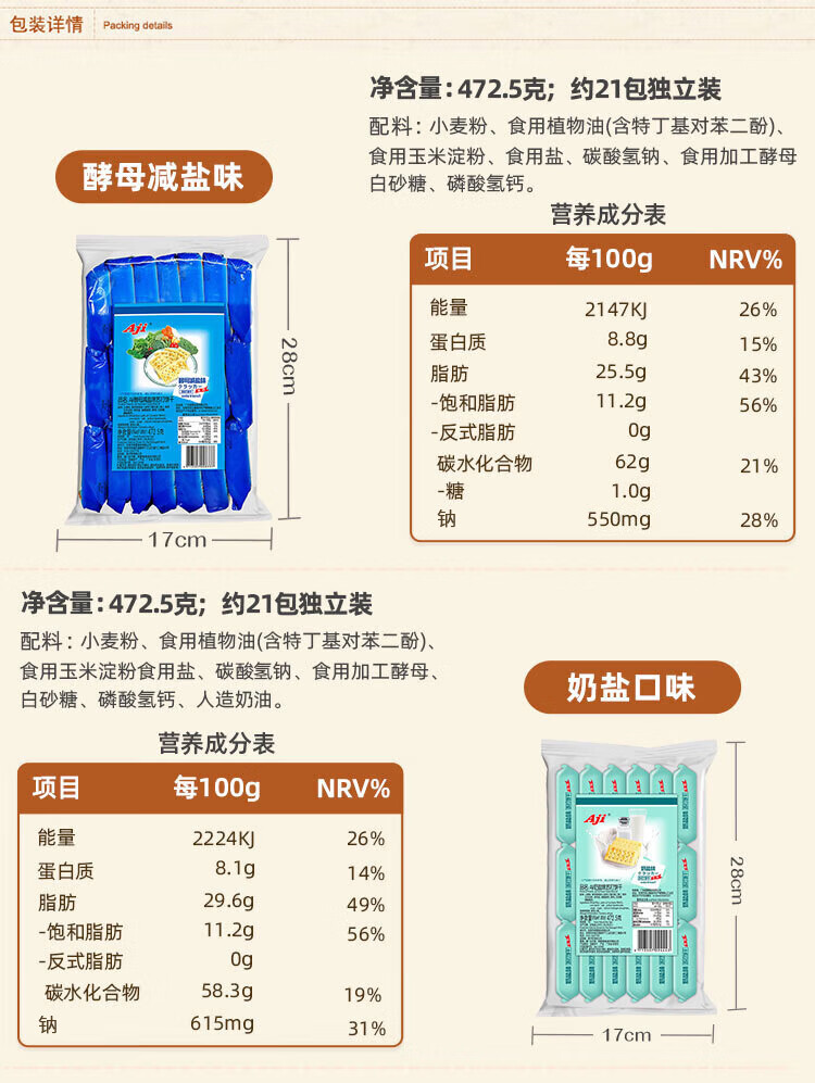 Aji 苏打饼干 酵母减盐味472.5g/袋 营养早餐夜宵咸零食休闲 下午茶