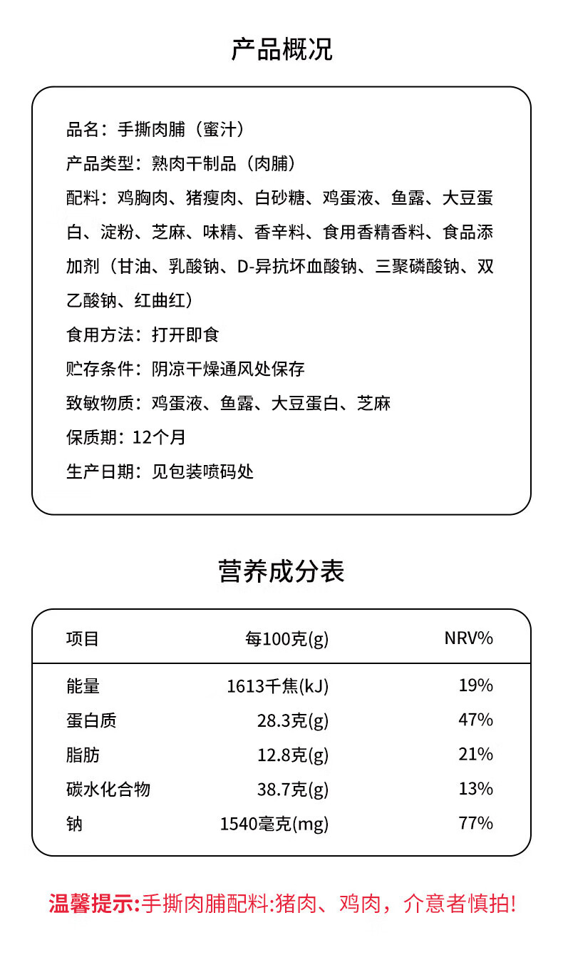 农香森 蜜汁味靖江手撕肉脯500g肉干肉食熟食即食小吃休闲办公零食