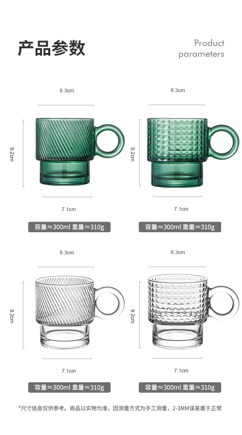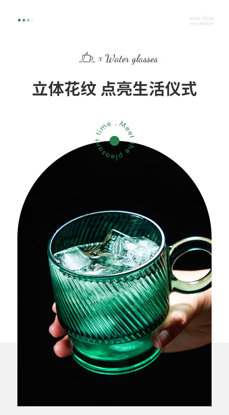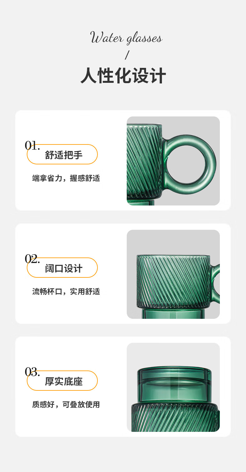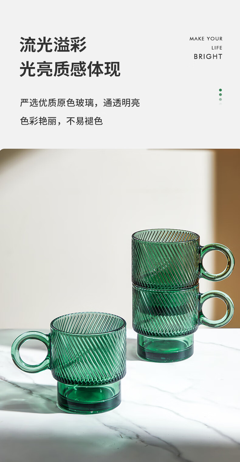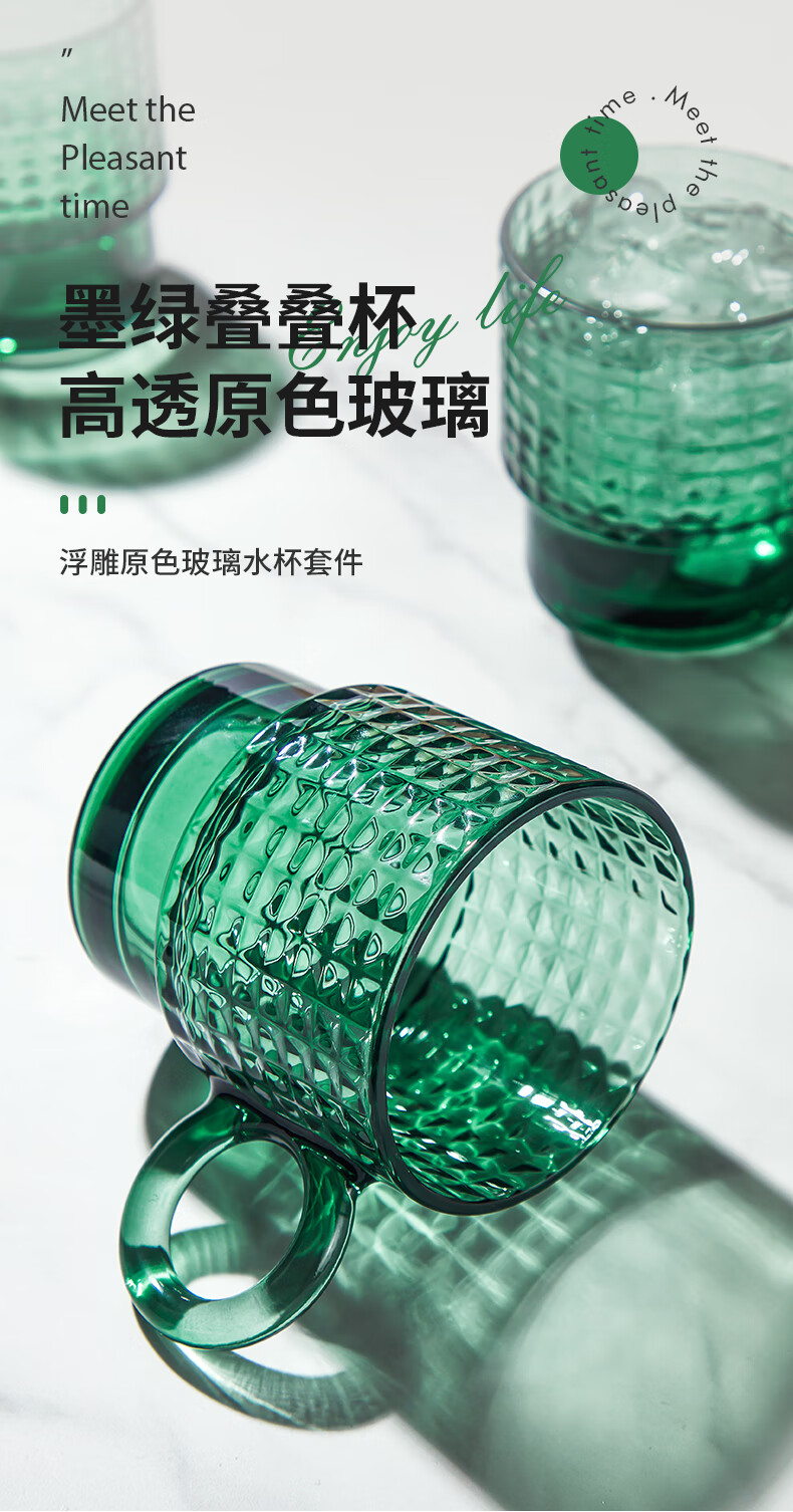 乐唯诗墨绿原色玻璃杯家用大容量喝水杯子女生高颜值带把手叠叠杯饮料杯 乐雅叠叠杯【斜纹透明】 300ml 2只