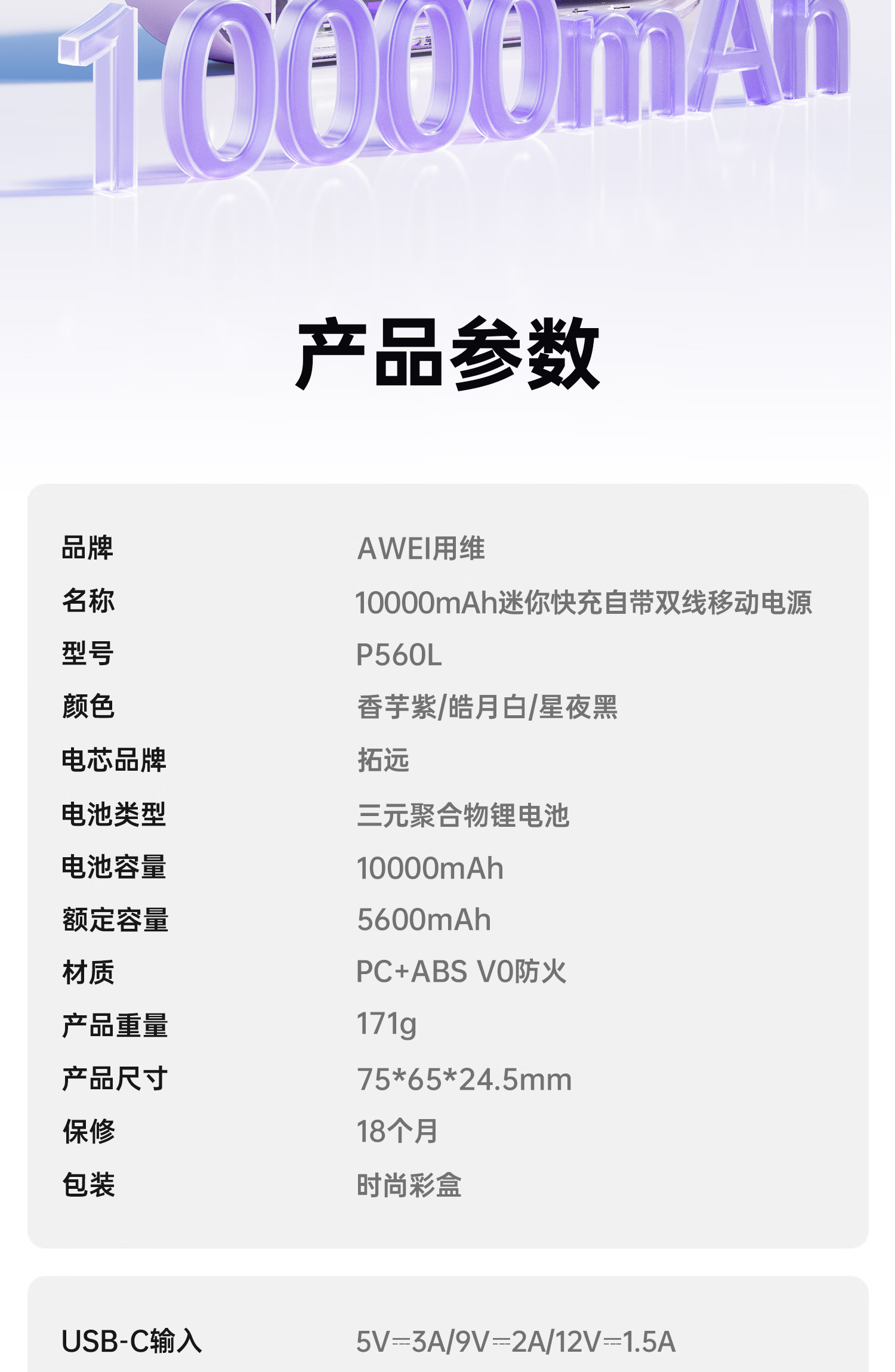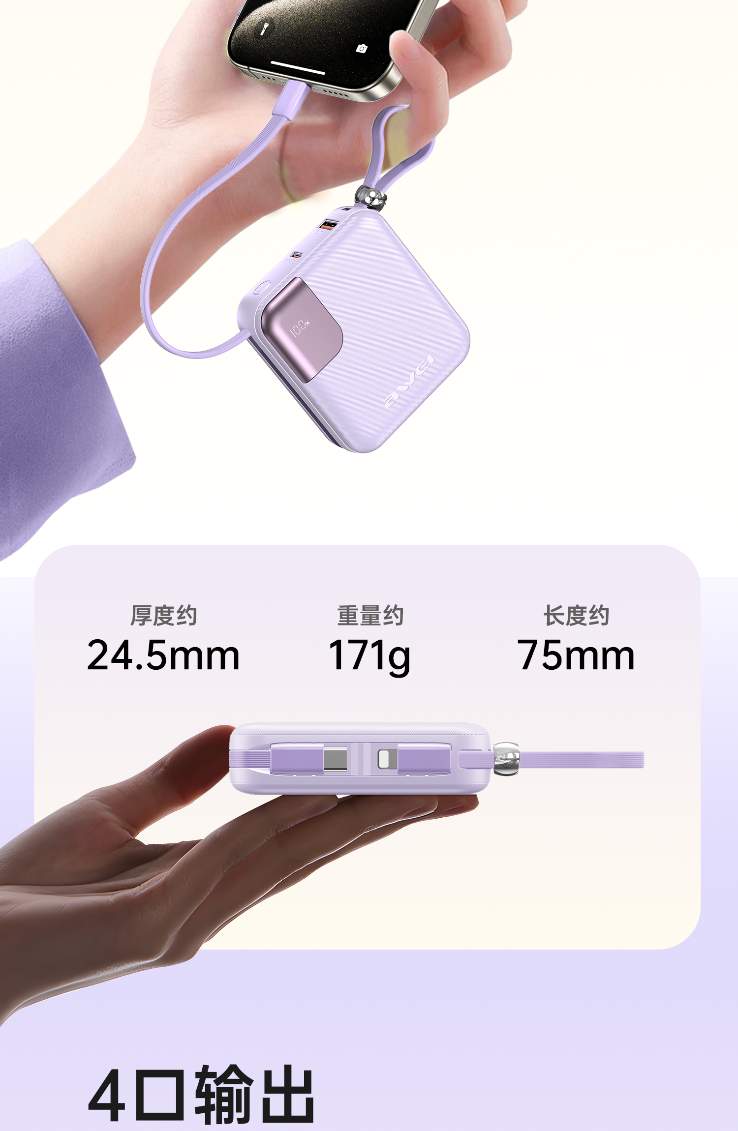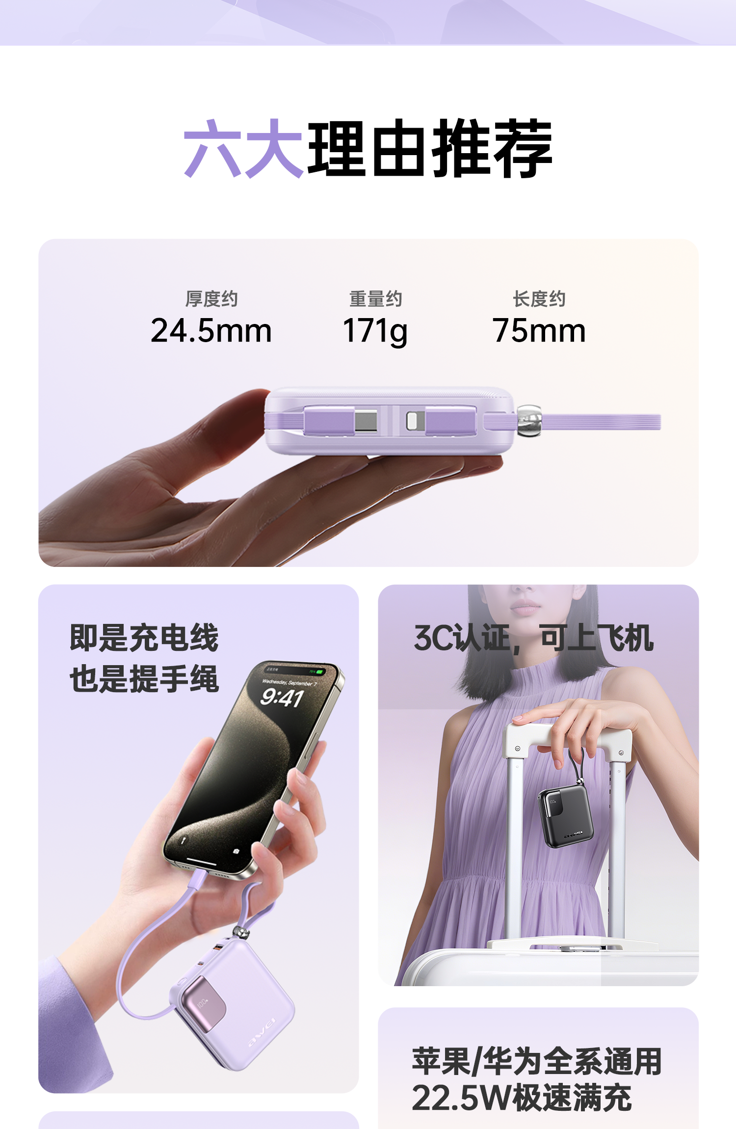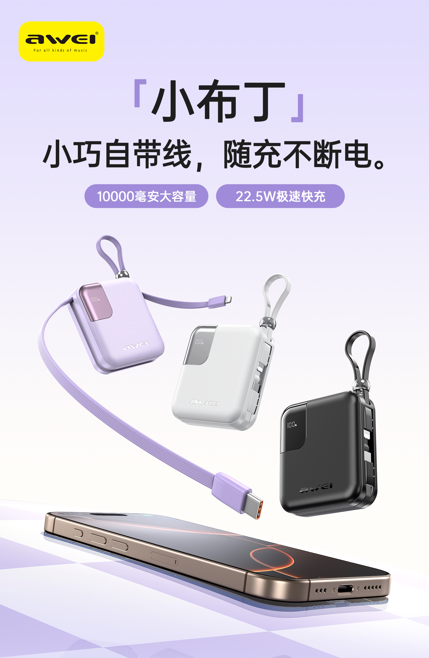 用维(AWEI)充电宝10000毫安容量自带双线22.5W快充移动电源迷你超薄小巧便携适用苹果17【3C认证可上飞机】 紫色丨电量数显丨自带苹果+Type-C双线 10000mAh