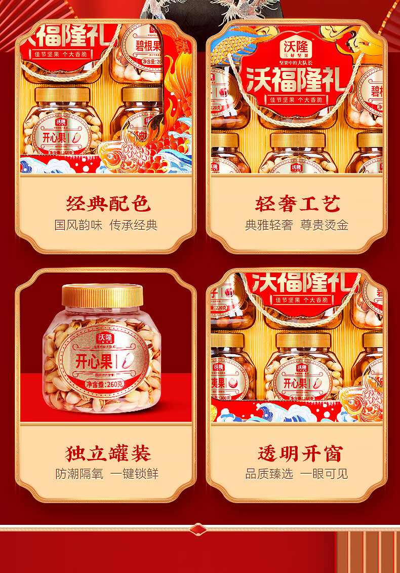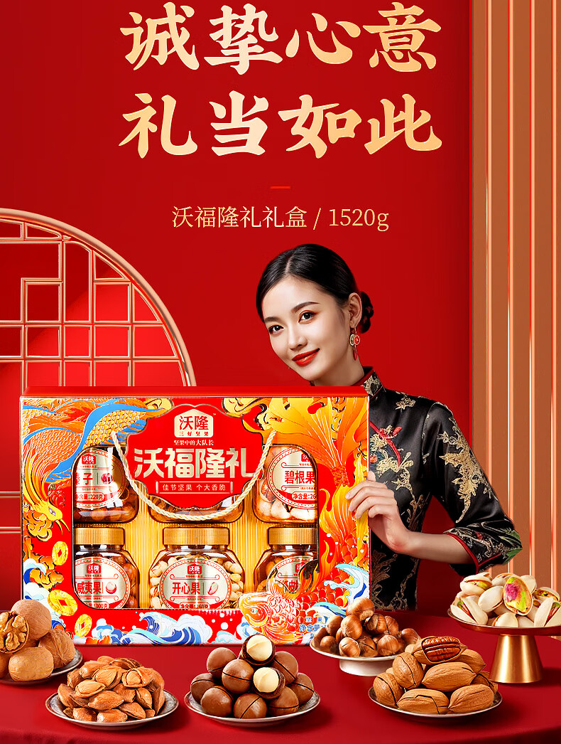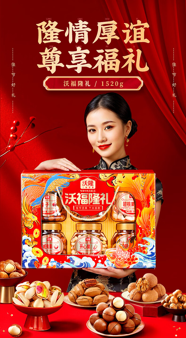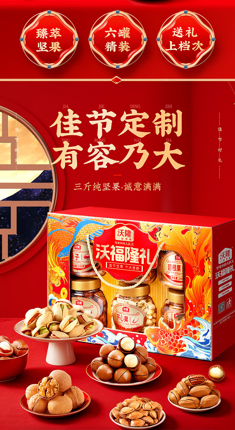 沃隆纯坚果礼盒6罐1.52kg沃福隆礼开心果干果零食炒货大礼包节日礼盒